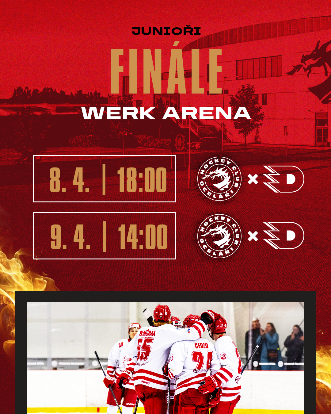 Ve finále změří Oceláři síly s pardubickým Dynamem, úřadujícím mistrem juniorské extraligy. Série hraná na čtyři vítězné zápasy začne ve WERK ARENĚ už tento týden. První zápas je na programu ve středu 8. dubna od 18:00, druhý duel začne o den později ve 14:00.