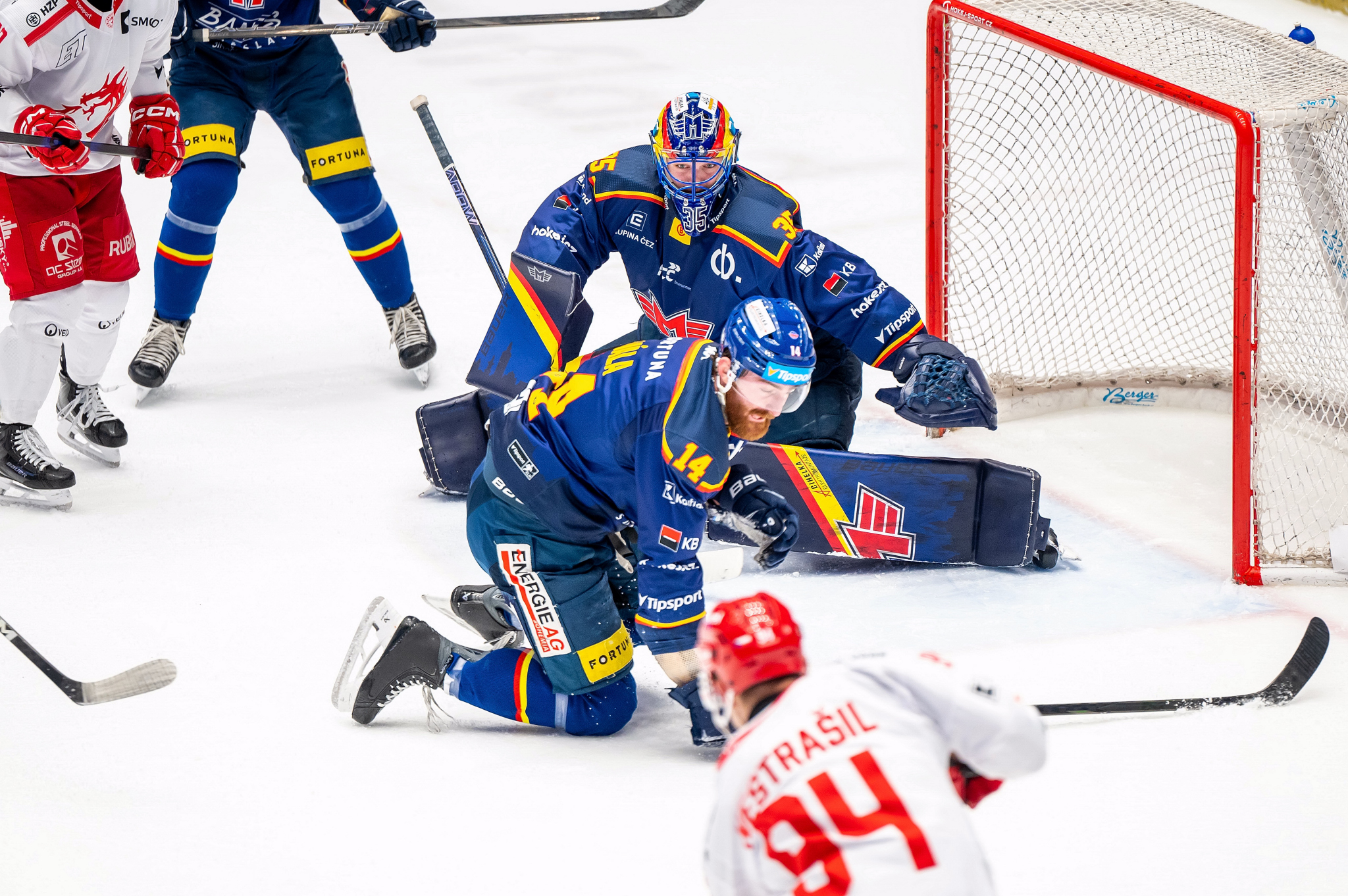 Přikryl nabíral s každým střídáním sebevědomí, k další střele se dostal po lehkém zaváhání v domácí defenzivě. Necelých šest minut před třetí sirénou byl vyloučen Galvas za vysokou hůl. Dvaapadesát sekund trvala přesilovka hosů, když kotouč z obranného pásma dostal Koch, který byl následně podražen Lantošim, síly na ledě se srovnaly. Zhruba dvě a půl minuty před třetí sirénou si vzali hosté oddechový čas, avšak Klouček zamířil na hostující lavičku až později. Motor se marně dobýval přes hradbu těl ve středním pásmu. V závěru vyslal tvrdou ránu z první Štencel a po něm i Cibulka, obě střely dokázal Mazanec eliminovat. Dvě vteřiny před závěrečnou sirénou dohrál Toman Michala Kovařčíka, ten naštěstí okamžitě vstal a ještě si s Tomanem celou situaci fyzicky vyříkal. Toman byl vyloučen do konce utkání za vražení na hrazení. Oceláři porazili Motor 2:1.