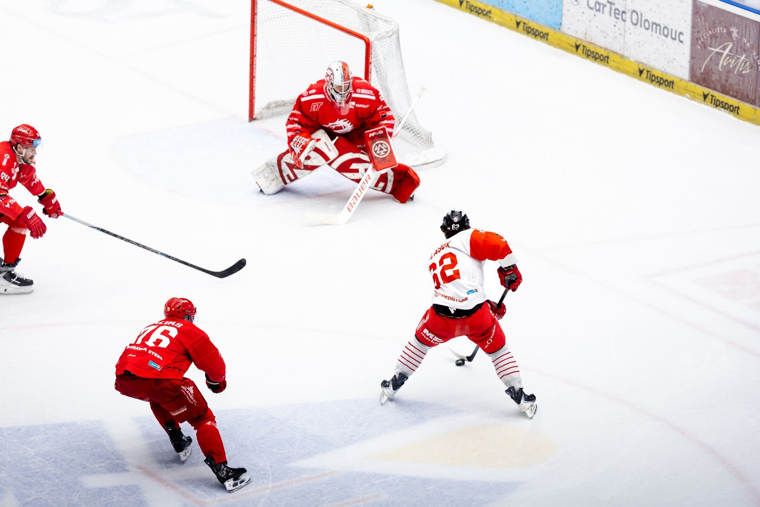 Tři minuty po uplynutí poloviny zápasu přišel trest ze strany domácích. Olomouc v této třetině vystřelila jen pětkrát, David Škůrek ale z prostoru nad pravým kruhem dělovkou nedal Mazancovi žádnou šanci. V šestatřicáté minutě usedl na trestnou třinecký Flynn, Cosgrove ani Navrátil ale své střely poslali mimo brankový prostor.