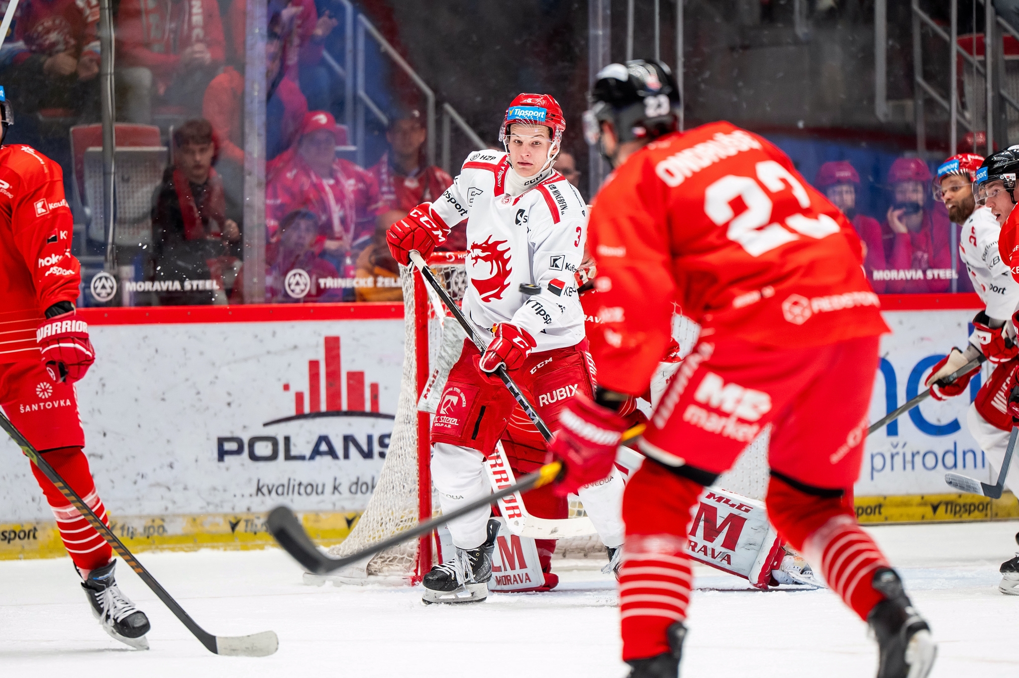 Kohouti hráli svou první přesilovku hned zkraje druhého dějství, avšak ani třetí situace při nerovnovážném počtu hráčů na ledě nebyla potrestána. Ve 25. minutě měla první třinecká letka slušný závar v útočném pásmu, celou situaci zakončoval Michal Kovařčík z mezikruží, Machovskému propadl za zády kotouč, přesto však zamezil tomu, aby puk prošel za brankovou čáru. V dalších dvou akcích byl v hlavní roli opět hostující brankář – nejprve díky rychlému přesunu pokazil radost Hudáčkovi, záhy nato pak Romanovi, jenž vzal přečíslení na sebe. Nabito na vrchol pravého kruhu dostal Kundrátek, jeho bomba minula horní konstrukci branky. Za strkanici před hostující brankou byli vyloučeni Michal Kovařčík a Silvester Kusko. Sikora ujížděl po pravém křídle a zkusil ránu na vzdálenější tyč, kde byl opět a znovu připraven Machovský.