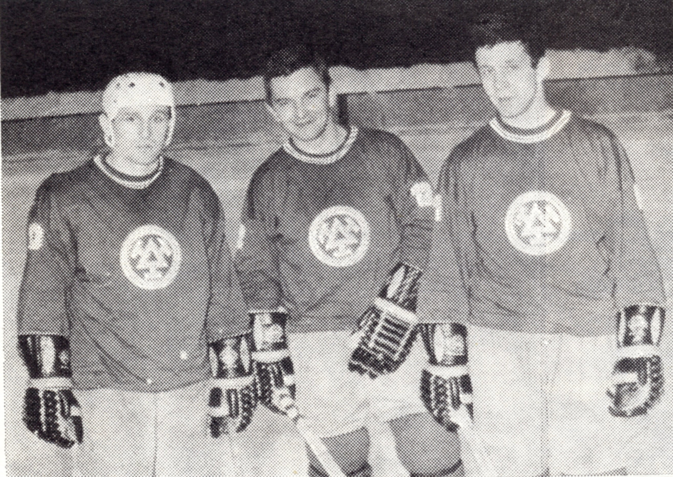 Bývalý třinecký útočník a jedna z hvězd místního týmu z přelomu šedesátých a sedmdesátých let Jindřich Mucina na fotce uprostřed, spolu s ním další dva spoluhráči z tehdejší elitní formace: Vlevo Václav Niesner, vpravo Petr Bartošík. Foto pořízeno během sezony 1968-69, na jejímž začátku Třinec v posledním přípravném utkání senzačně porazil tým AIK Skelleftea.