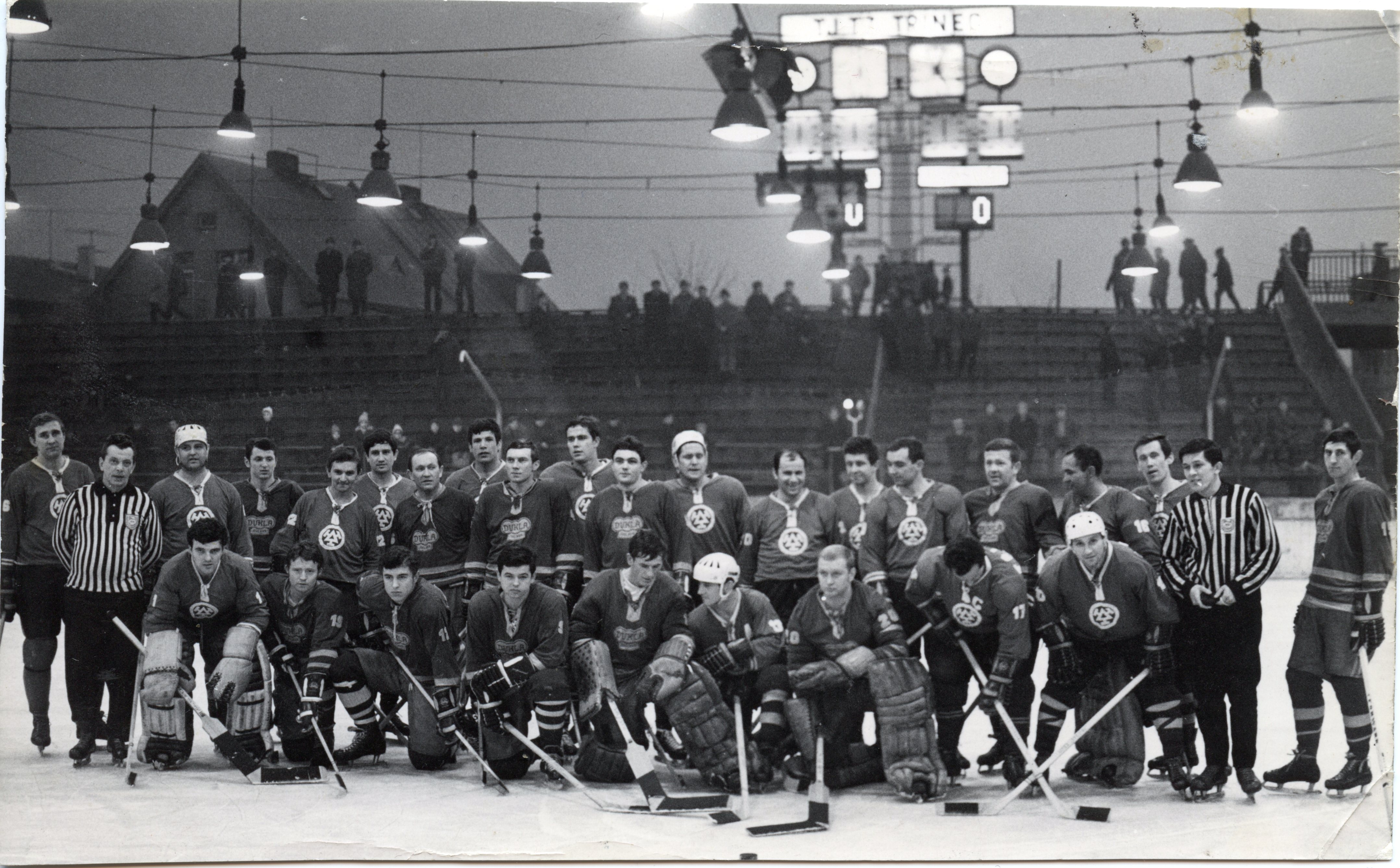 Momentka z přátelského utkání s Duklou Praha z 25. února 1969. Takhle nějak vypadal zimní stadion krátce po jeho otevření, za hráči vidíte hodiny a tribunu za brankou, na které byl později sektor na stání a kotel třineckých fanoušků. Střecha stadionu, jeho opláštění i ostatní tribuny rostly až o několik let později. V těchto kulisách hráči tehdejšího TJ TŽ odehráli také památný zápas s týmem AIK Skelleftea. V klubových kronikách se ale bohužel žádné obrazové záznamy z toho klání dochovat nepodařilo.
