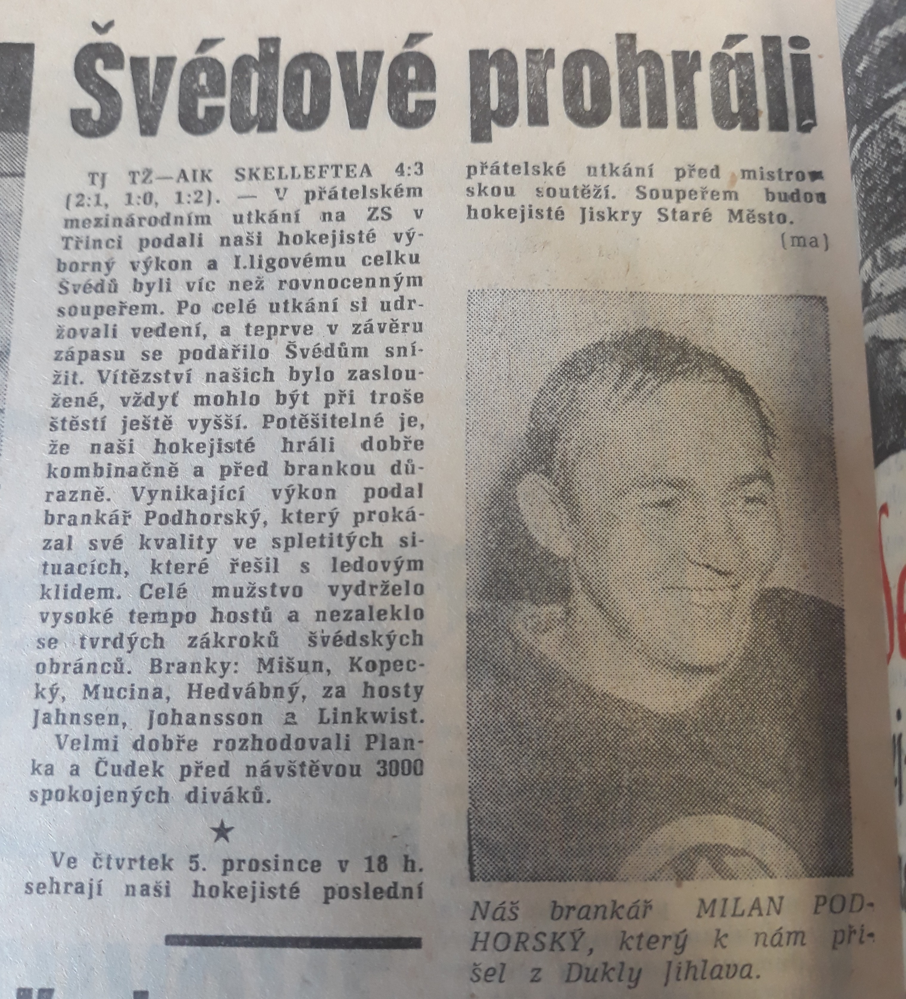 Podle Hutníku byli naši hokejisté Švédům více než rovnocenným soupeřem. Po celé utkání si udržovali vedení a teprve v závěru zápasu se podařilo Švédům snížit. Vítězství bylo zasloužené, při troše štěstí mohlo být ještě vyšší. A potěšitelné bylo, že třinečtí hokejisté hráli dobře kombinačně a před brankou důrazně. Týdeník Hutník chválil také vynikající výkon brankáře Podhorského, který své kvality prokázal i ve spletitých situacích, které řešil s ledovým klidem. A z dnešního pohledu je vtipná i poznámka o výkonu rozhodčích Pianka s Čudkem, kteří zápas rozhodovali velmi dobře.