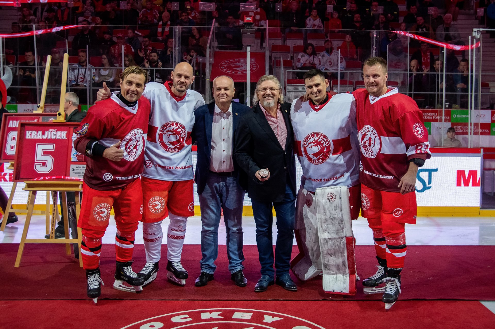 "Byl jsem dojatý, několikrát jsem měl slzy v očích," řekl Lukáš Krajíček, který s Třincem vyhrál coby hráč dva mistrovské tituly a v kariéře si zahrál také finále Staley Cupu. I proto mu na kostce nad ledem na dálku popřál jeho tehdejší spoluhráč z Philadelphie, člen legendárního Triple Gold Clubu a pravděpodobně jeden z nejlepších obránců hokejové historie Chris Pronger.