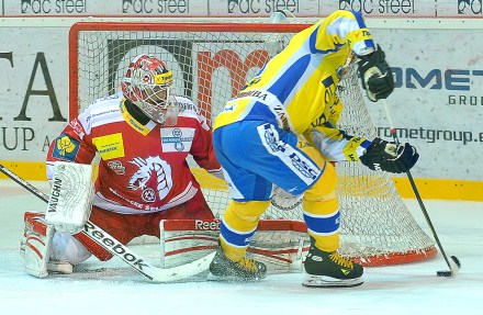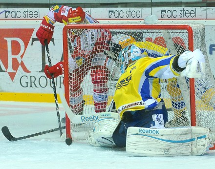 Oceláři chtěli rozhodnout čtvrtý zápas za každou cenu ze hry. Takto po obkroužení branky zkoušel zasunout puk za čáru kapitán Bonk a pouze decimetry ho dělily od úspěchu.