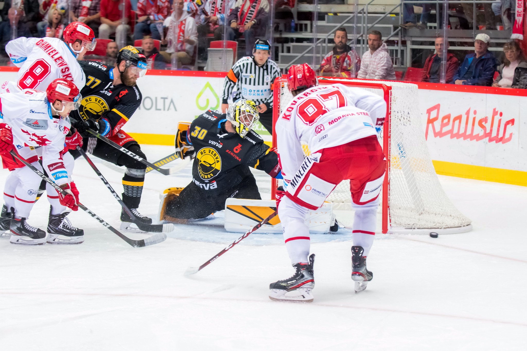 Stále aktuální extraligoví šampioni absolvují v pořadí už čtvrté domácí utkání v řadě. S Libercem, Hradcem ani Spartou nezaváhali, a ve stejném trendu chtějí pokračovat i nadále. Proti Spartě se v sestavě neobjevil Aron Chmielewski, který touto absencí ukončil 134 zápasů dlouhou sérii bez vynechání jediného utkání. Scházel rovněž gólman Jakub Štěpánek, který letos vytvořil vyrovnanou a dobře fungující gólmanský tandem s Josefem Kořenářem. Objeví se v sestavě pro duel s Vervou? Počkejme si na odpověď do pátečního večera!