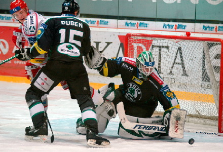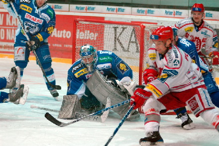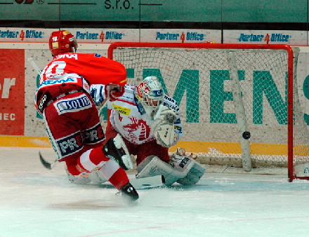 Roman Červenka atakoval stovku kanadských bodů v sezóně v součtu základní části a play-off. Nyní hodlá svůj talent dále rozvíjet v NHL nebo KHL. Na snímku při své tradiční činnosti – překonávání soupeřova brankáře.