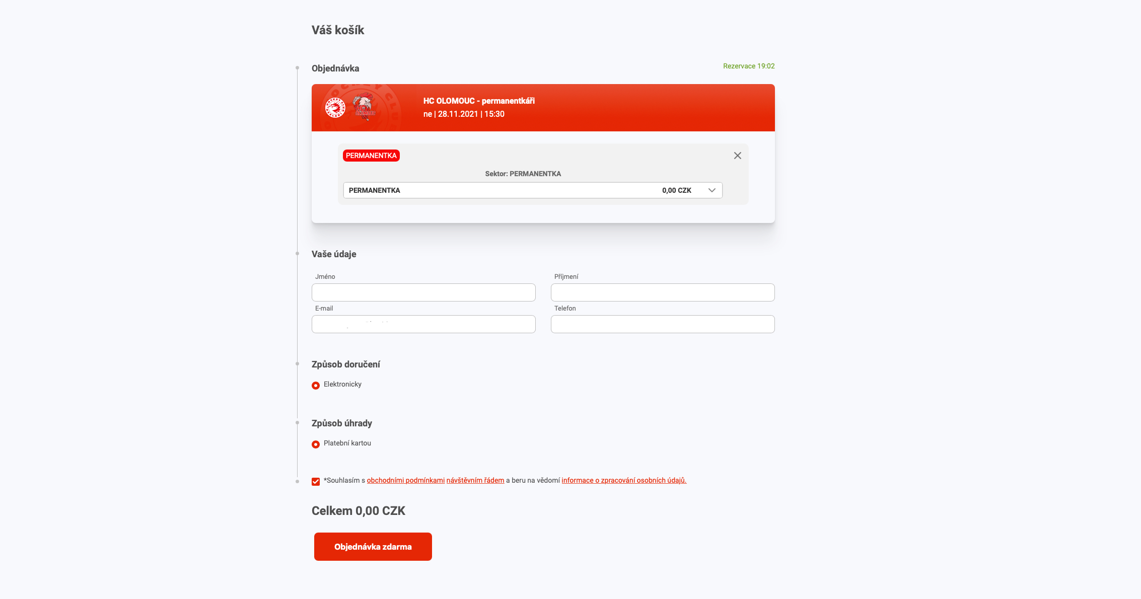 Po kliknutí na odkaz vás aplikace vyzve k vybrání vstupenky. V seznamu události vyberte nedělní utkání s HC Olomouc. Kliknutím na zámeček vyskočí okno, které vás vyzve k odemknutí pomocí čísla permanentky. Tím je unikátní šestimístný kód na zadní straně vaší permanentky. Po jeho zadání se vás aplikace zeptá na počet přidaných míst. Po kliknutí na 1 se následně automaticky vloží vaše místo do košíku. Nákup dokončíte vložením údajů (včetně platné emailové adresy a telefonního čísla). Vstupenka vám bude posléze doručena na email.