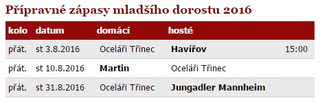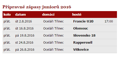 Poté se hráči s drakem na prsou vrátí zpět na třinecký led, kde se střetnou s Olomoucí a slovenskou osmnáctkou. Poslední dvě přípravná utkání pak mladí Oceláři sehrají v Kopřivnici, na domovském stadionu trenéra Václava Varadi, kde vyzvou švýcarský Rapperswil a Vítkovice.