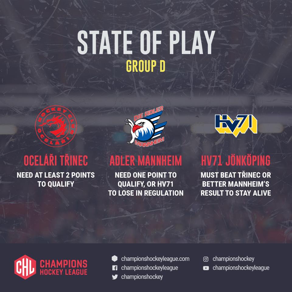 K postupu do play-off Champions Hockey League jim ve dvou zbývajících zápasech základní skupiny stačí získat dva body. Pokud se to nepodaří v úterý, mohou složit reparát 10. října při domácí odvetě ve WERK ARENĚ.