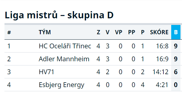 V rámci letošního ročníku Ligy mistrů dosud třinečtí získali devět bodů. Dvakrát zdolali dánský Esbjerg (9:1, 2:1), s Mannheimem to bylo daleko vyrovnanější (3:0, 2:6). Všechny tyto zápasy se hrály ještě před začátkem ligových soutěží, pravá síla mužstev na evropském kolbišti by se měla projevit právě v těchto dnech a týdnech, kdy už jsou jednotlivé národní ligy v plném proudu.