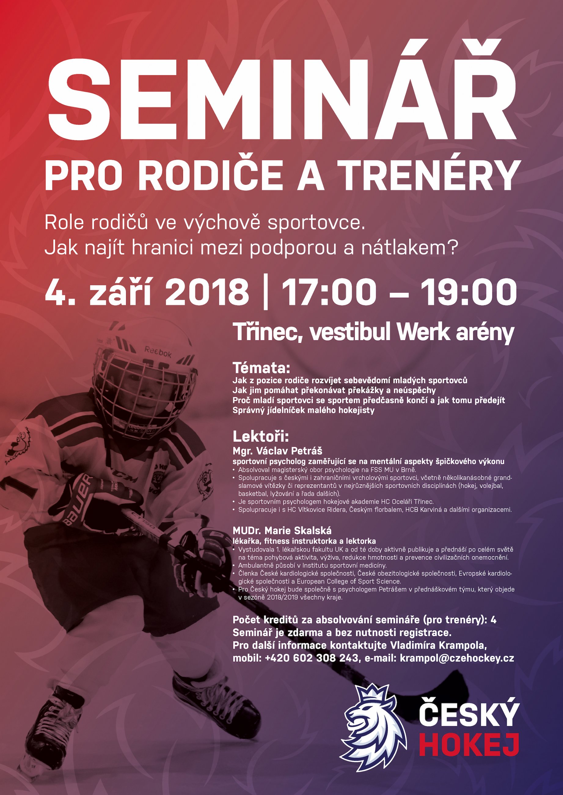 Jaké informace mohou rodiče očekávat? “Kromě sportovně-psychologické části, která bude věnována například rozvoji sebevědomí u mladých sportovců či tomu, jak najít hranici mezi podporou a nátlakem, se účastníci dočkají i tématu "Správný jídelníček malého hokejisty", kterému se bude věnovat paní Skalská,” popisuje plán semináře pan Petráš.