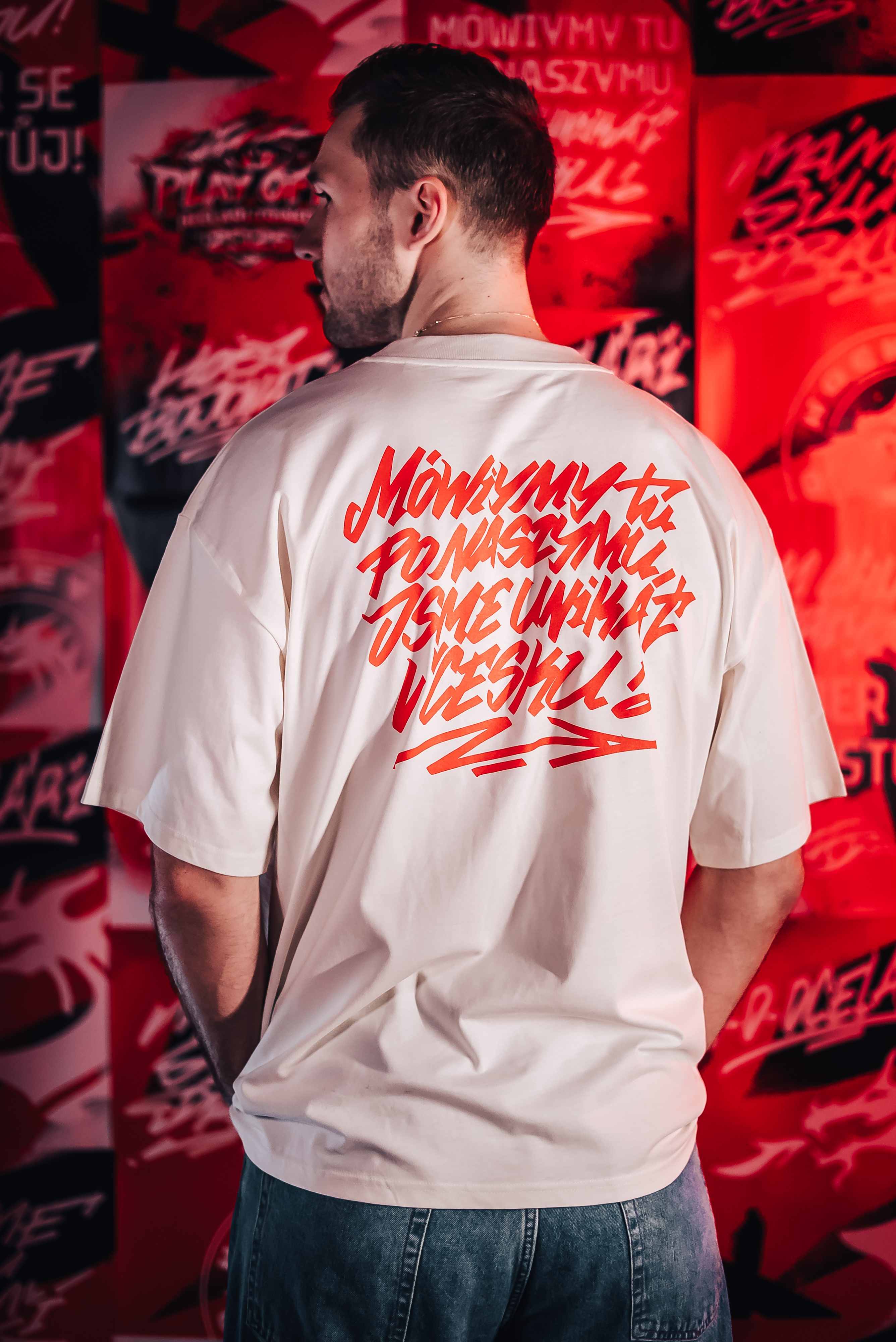 S totožným designem pak bude k dostání i černé oversize tričko a krémové oversize tričko s červeným nápisem a okem. Standardní střih pak dostalo tričko červené, kde na hrudi najdete ocelářského draka a na zádech nápis "Máme sílu dračí".