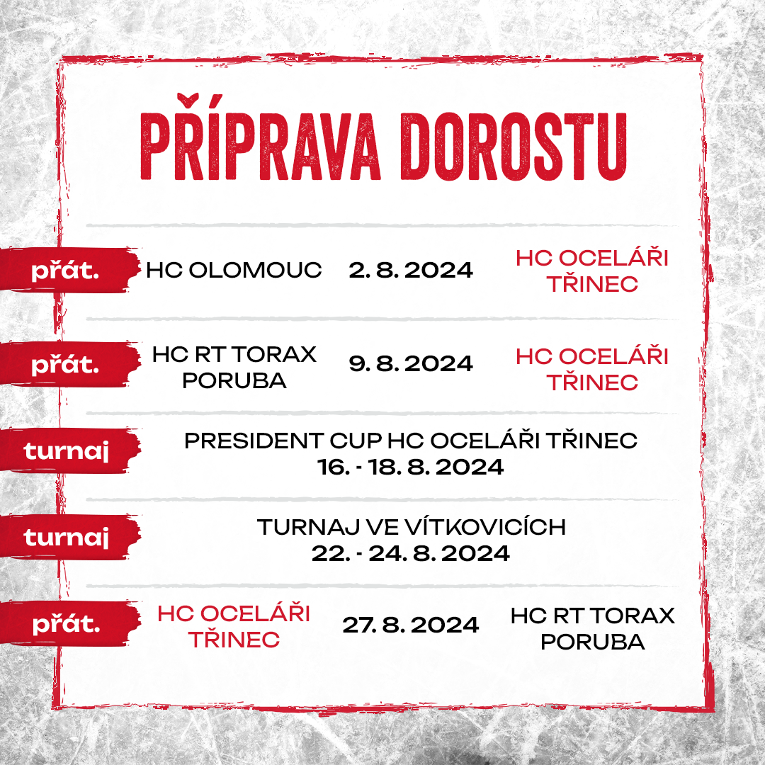 Třinečtí dorostenci odehráli tři přípravné zápasy už během měsíce června, mnohem větší porce utkání je ale čeká až nyní. Přípravu na blížící se sezonu odstartují svěřenci trenéra Jana Mikše v pátek 2. srpna proti Olomouci, highlightem léta pak pro Oceláře bude domácí President Cup. Prestižní turnaj se v Třinci uskuteční od pátku 16. srpna do neděle 18. srpna.