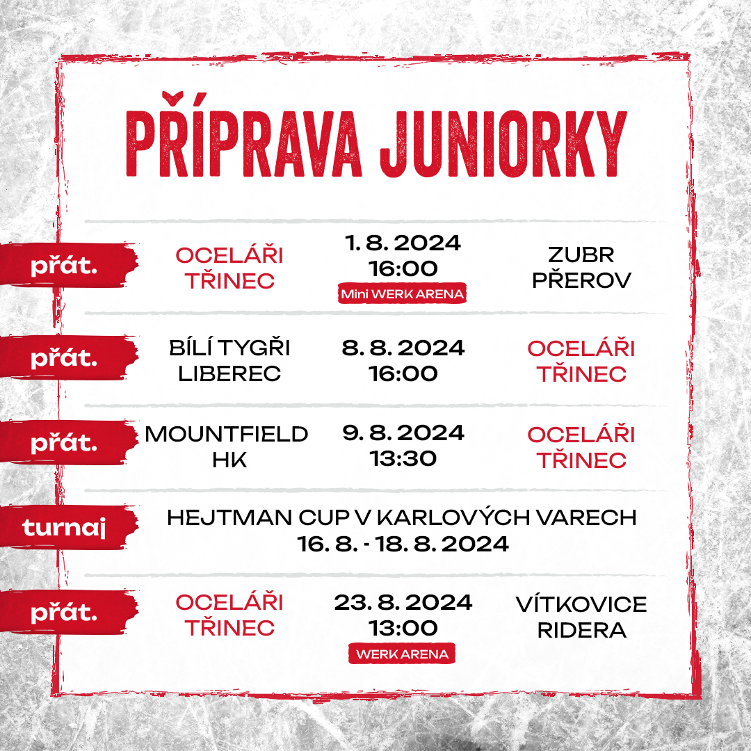 První zápasový test čeká na třinecké mladíky ve čtvrtek 1. srpna. Od 16:00 vyzvou Oceláři v Mini WERK ARENĚ Přerov, v dalších týdnech už vyrazí ven. Po zastávkách v Liberci a Hradci Králové zavítají hráči s drakem na hrudi do Karlových Varů, kde se zúčastní tradičního Hejtman Cupu. V základní skupině změří Třinec síly s Davosem a Spartou, závěrečné utkání turnaje pak odehraje dle svého umístění.