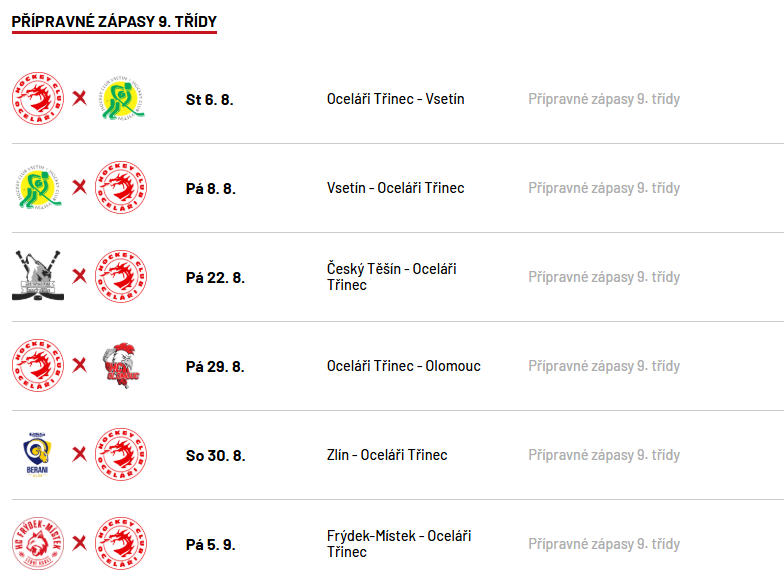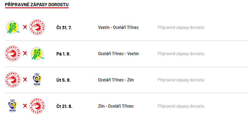 Kromě dvou pohárů pak třinecké mladíky čeká i čtveřice přípravných zápasů. Ten vůbec první odehrají Oceláři ve čtvrtek 31. července ve Vsetíně, generálkou na extraligu dorostu pro ně bude utkání ve Zlíně.