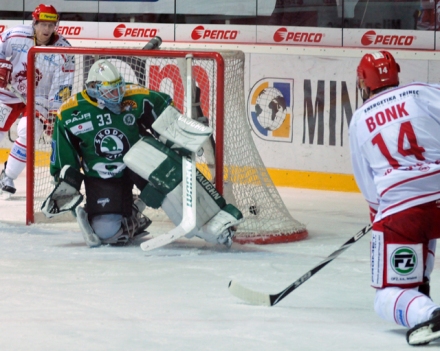 Oceláři letos ve třech zápasech nasázeli Boleslavi prozatím devět branek. Kapitán Bonk se zapsal mezi střelce celkem třikrát. Na snímku proměňuje přesilovku v zápase 16. kola a uzavírá tak skóre utkání na konečných 4:0.