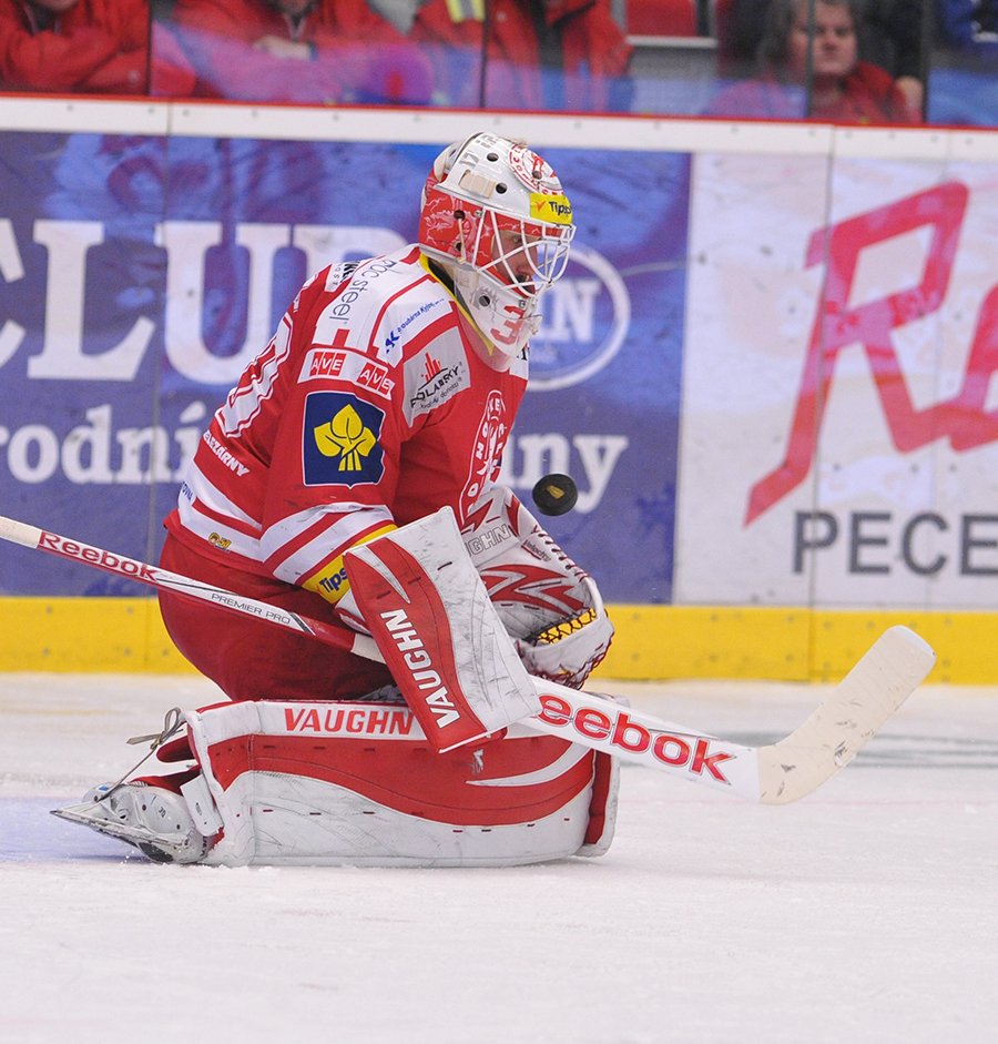 Obrovskou měrou se na vedení 3:1 v sérii podílí brankář Šimon Hrubec. Třinecký gólman v posledním zápase zastavil 32 střel a pomohl svému týmu získat cennou výhru ze soupeřova ledu. FOTO: Marian Ježowicz.