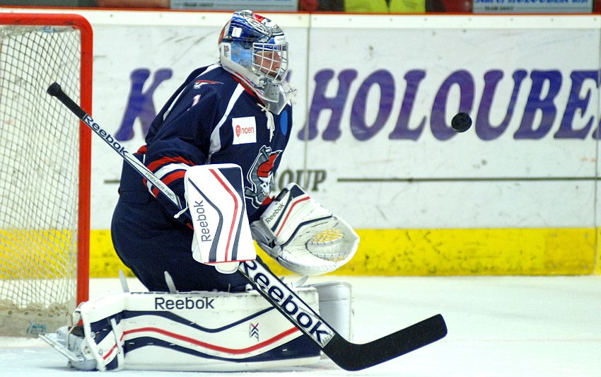 V chomutovském brankovišti se pravidelně střídají Miroslav Kopřiva s Janem Strmeněm, o osm zápasů více zatím odchytal první jmenovaný. Kopřiva si drží úspěšnost zákroků nad hranicí 93%, vychytal již tři čistá konta. FOTO: Jan Čech (www.piratichomutov.cz).