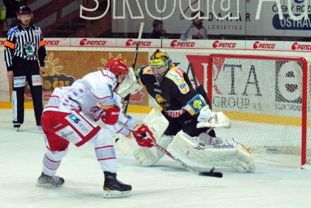 David Květoň byl v základní části nejproduktivnějším hráčem slezského týmu v bojích s Litvínovem. Na snímku z trestného střílení dává jeden ze svých gólů.