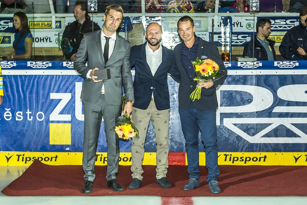 Zlín se před zápasem se Spartou rozloučil s trojicí klubových legend - Petrem Čajánkem, Petrem Leškou a Jaroslavem Balaštíkem. Kdo bude jejich nástupcem a potáhne Berany v extralize? FOTO: Zlín Press Jiří Zaňát (www.hokej.zlin.cz).