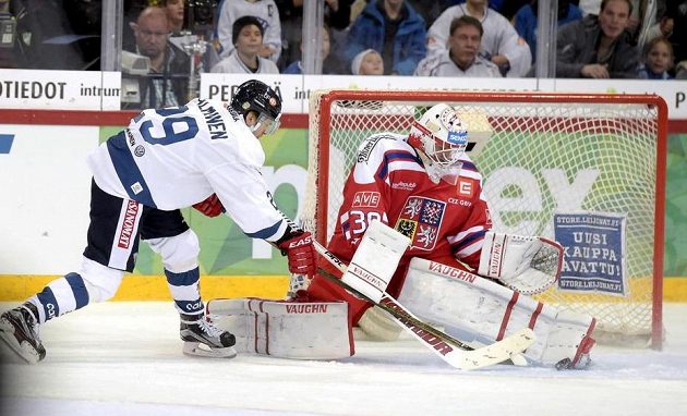 Šimon Hrubec se na podzim dočkal své druhé nominace do národního týmu. 5. listopadu odchytal v Helsinkách zápas s domácí finskou reprezentací a připsal si s českým týmem vítězství 5:3. Na snímku likviduje šanci Sakariho Salminena.