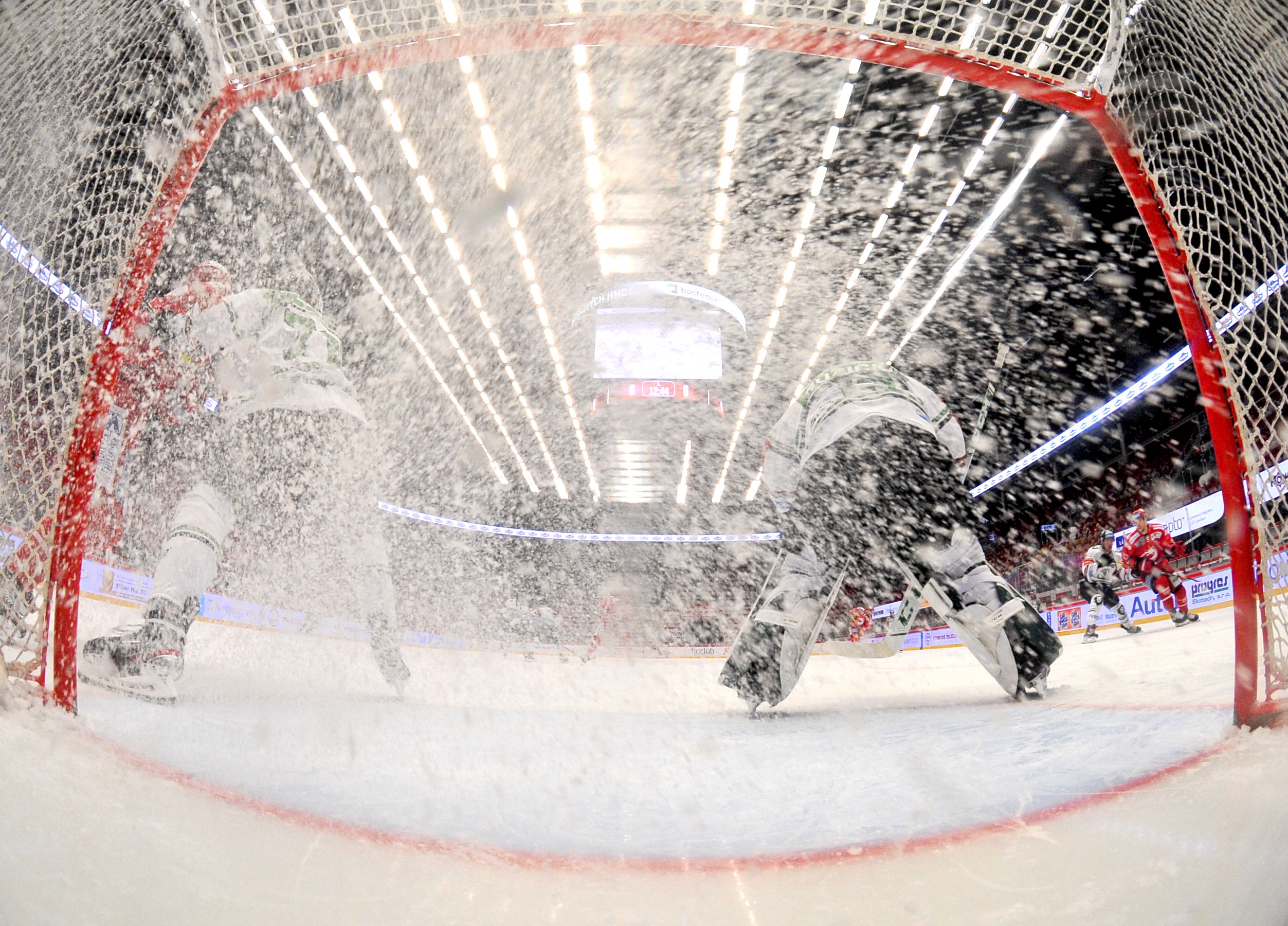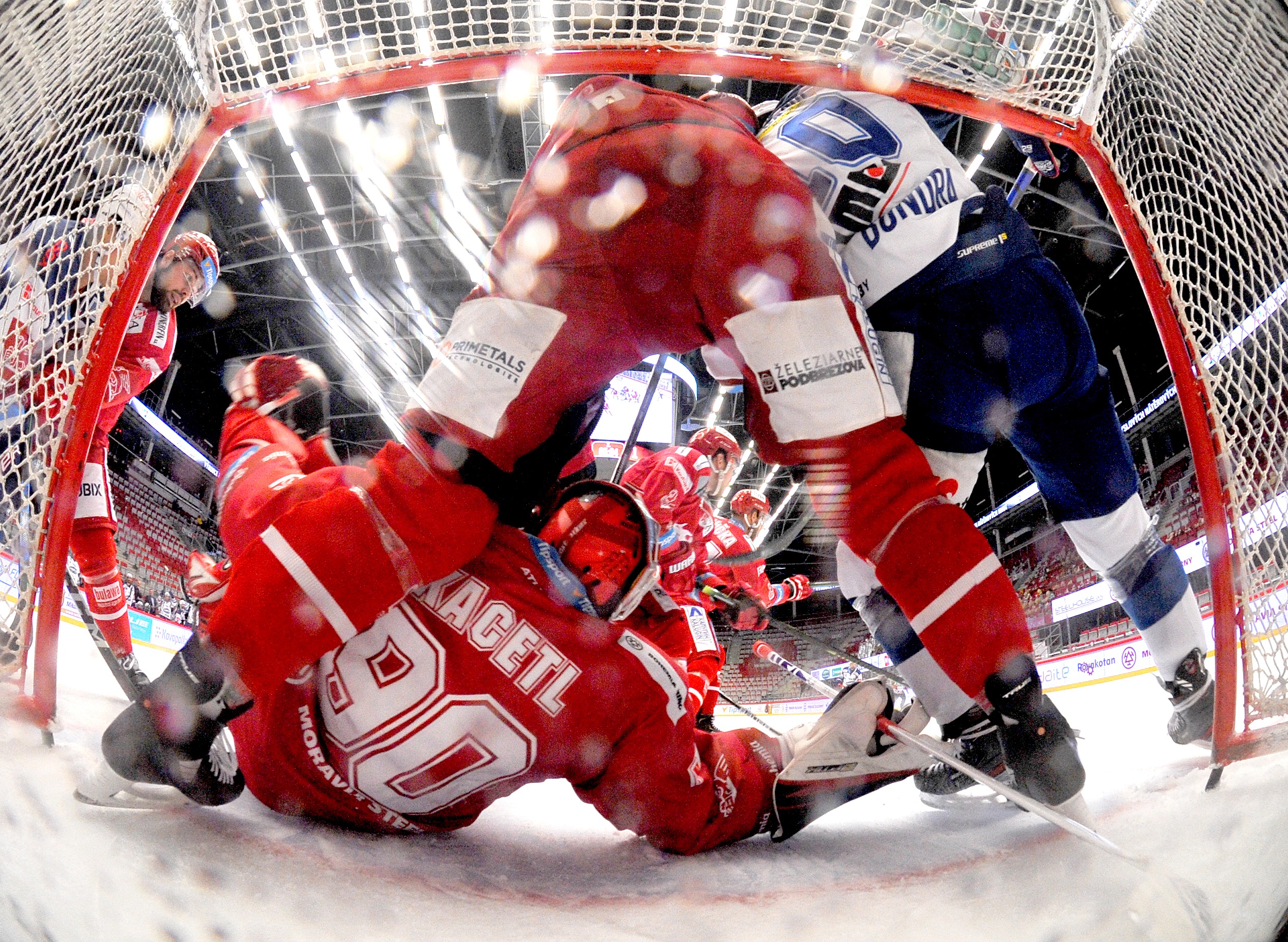 Během play off jsem se rozhodl podstoupit určité riziko rozbití své fototechniky a umístil jsem svůj druhý fotoaparát do branky. Fotky z něj jsou velmi působivé. Já Vám však chci popsat, co všechno se za tím skrývá. Jednak jsou to v prvé řadě nervy, jestli Vám foťák někdo nerozbije, za druhé fotoaparát se spouští na dálku rádiovým spojením, které není úplně spolehlivé a za třetí i když se trefíte a zmáčknete rádiovou spoušť ve správném okamžiku, někdy Vás výsledek moc nepotěší. Pár hezkých gólových fotografií z branky jsme na různých kanálech HCO už během play off prezentovali, nicméně já bych se s Vámi rád podělil o fotky, které pro mě mají nějaký příběh. První z fotek je pořízená díky nespolehlivosti rádiového spojení, protože mi během čtvrtfinálového zápasu s Kometou selhala dálková spoušť fotoaparátu a záhadným způsobem se ve druhé třetině zasekla a vyfotila přes 5000 snímku chytajícího Ondry Kacetla. Kdybych měl ve fotoaparátu větší paměťovou kartu, fotek by bylo asi víc. Mezi těmi 5000 fotografií jsem však našel jednu, která zachycuje obětavost a bojovnost obránců HCO, kteří se snažili maximálně Kácovi pomáhat. Na snímku bránicí Martin Gernát a Milan Doudera.