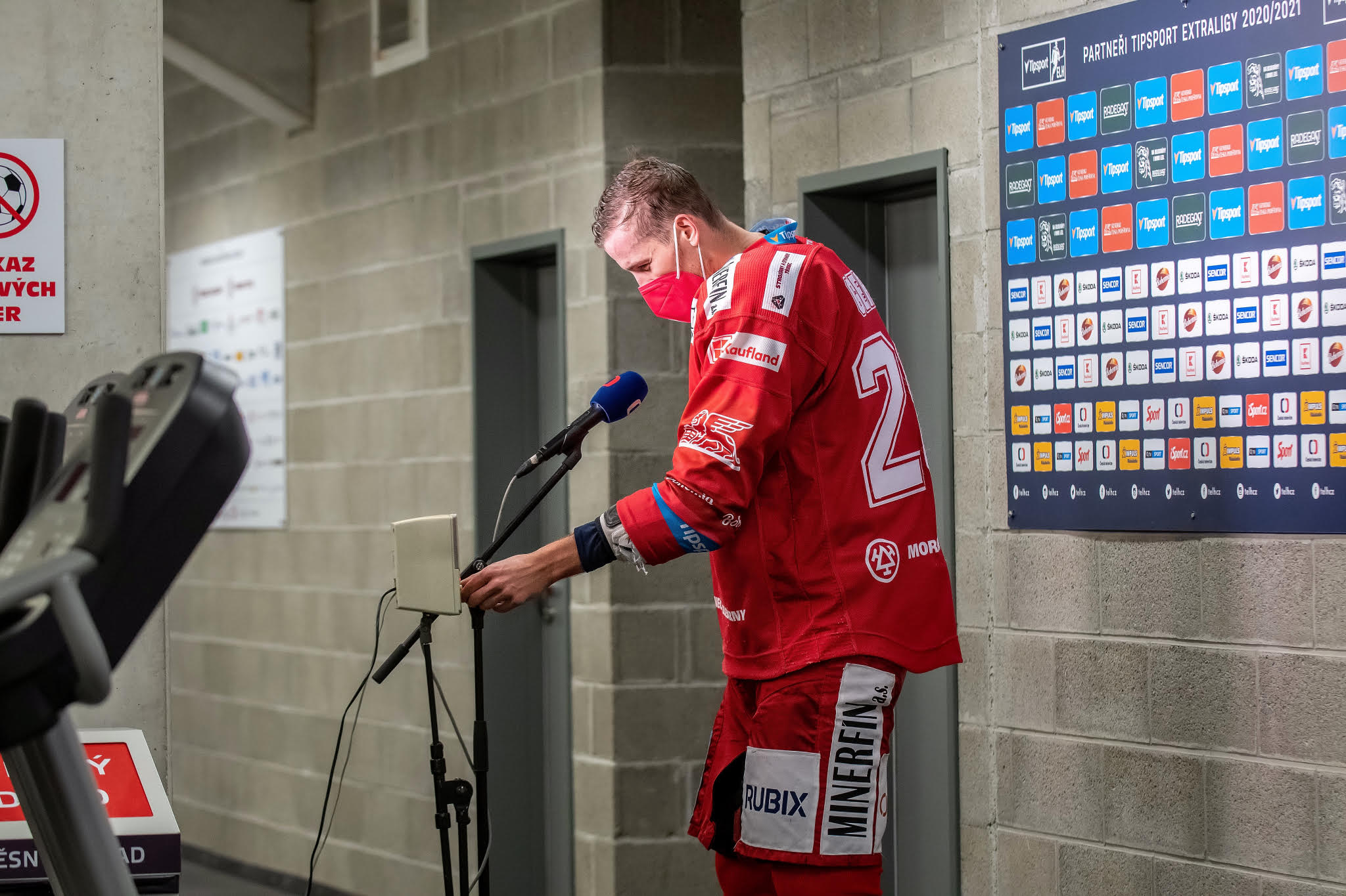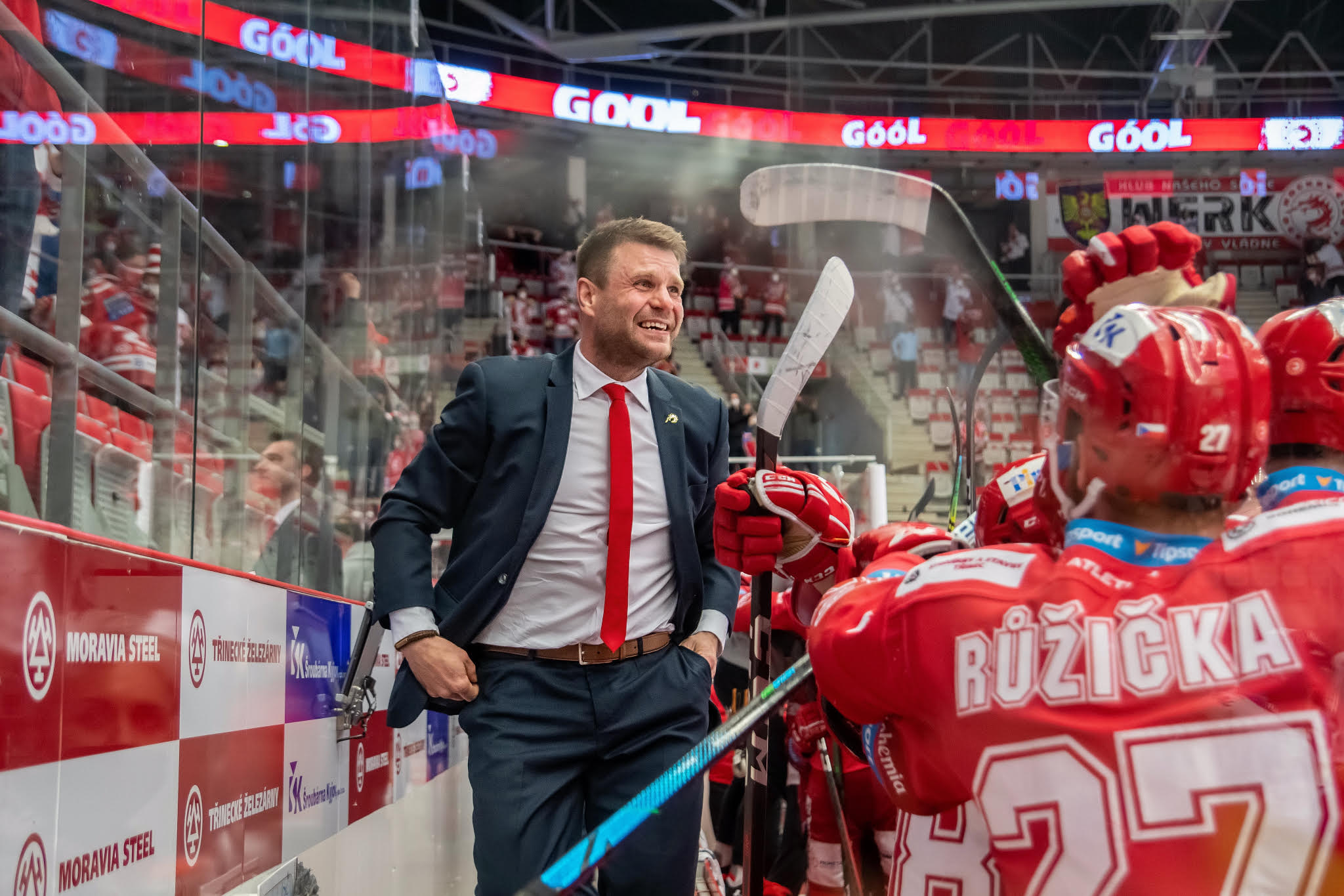 Radek Smoleňák. U té fotky se směju. Bylo to celkem vyhrocené utkání. Ještě v době, kdy i trenéři museli mít roušky. Vladimír Růžička jí měl pod nosem. Martin Růžička řval během hry (ze srandy) na Smoleňáka, ať řekne Růžovi, aby si nasadil roušku. Ten mu odpověděl: "Růža si vždycky dělá, co chce. Děláš, jako bys ho neznal."