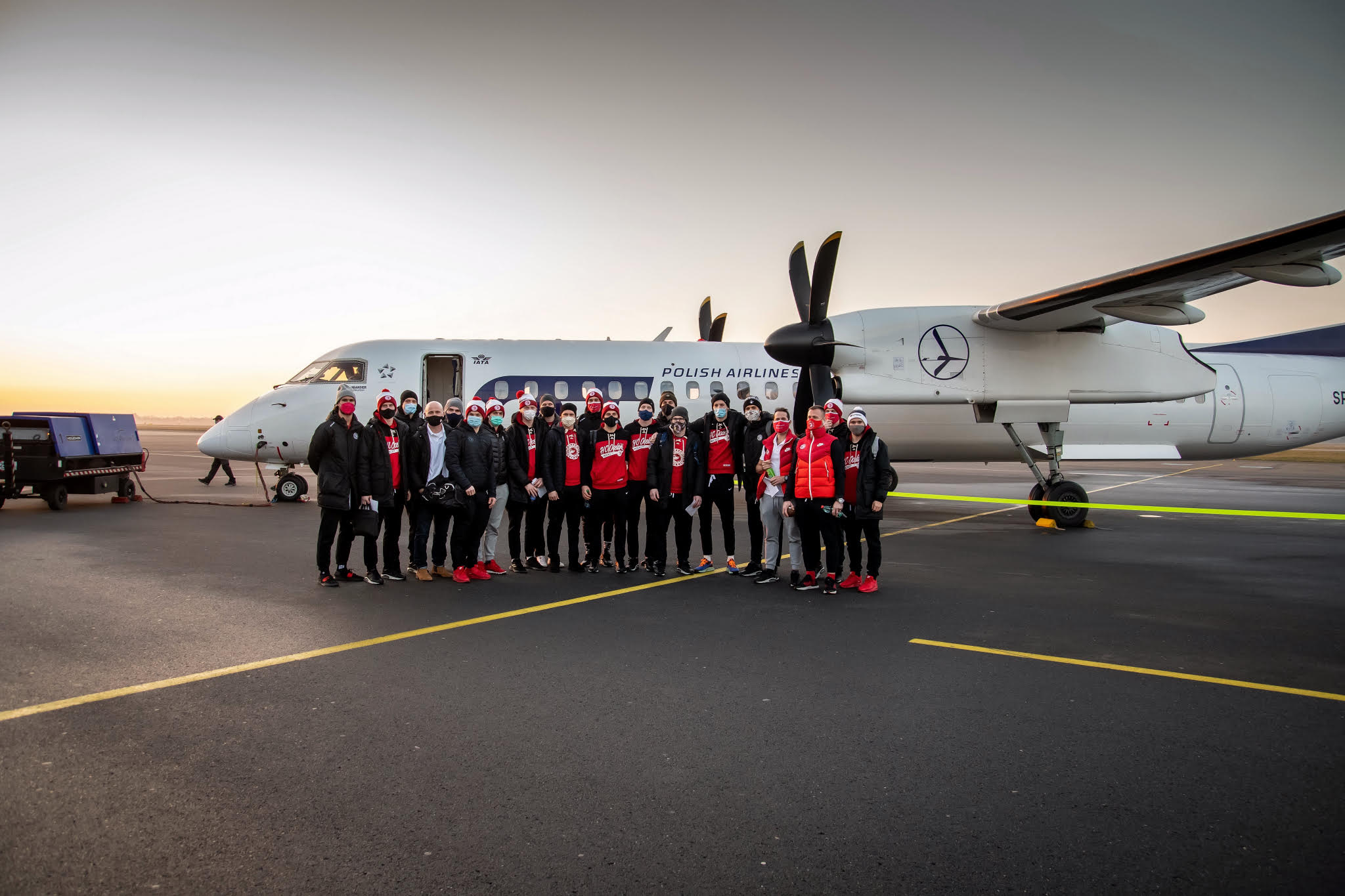 Oceláři na letišti před letadlem De Havilland Canada Dash 8-400, které je bezpečně dopravilo do Prahy.