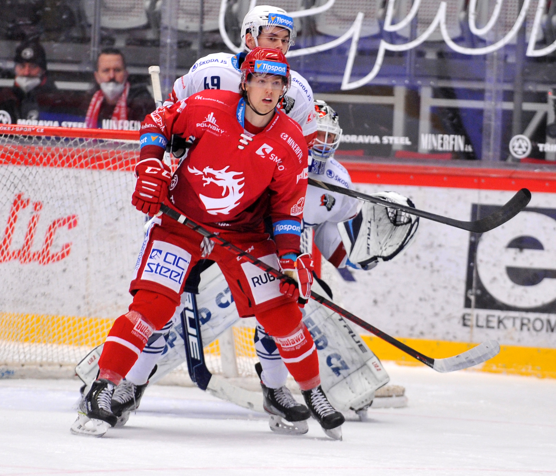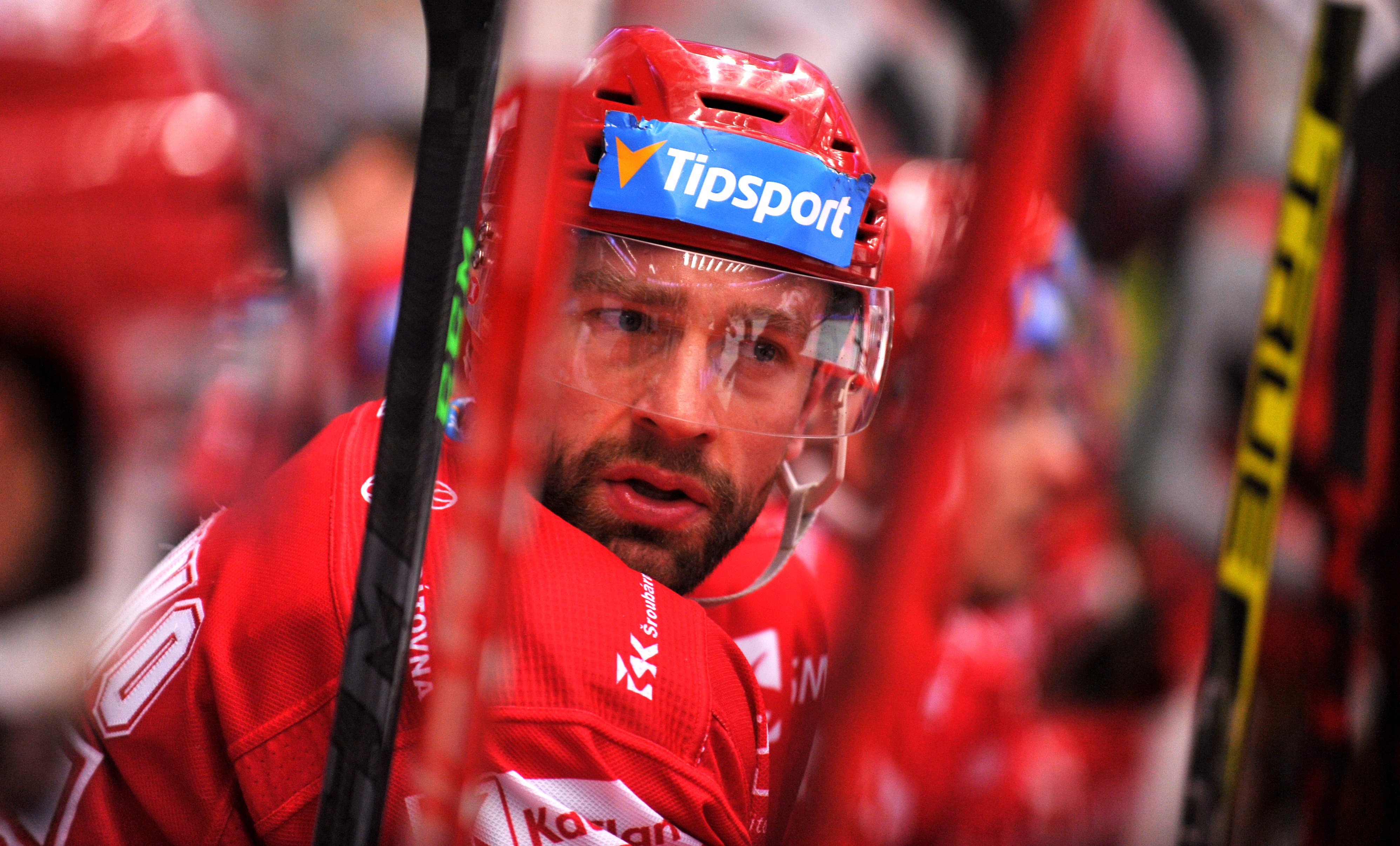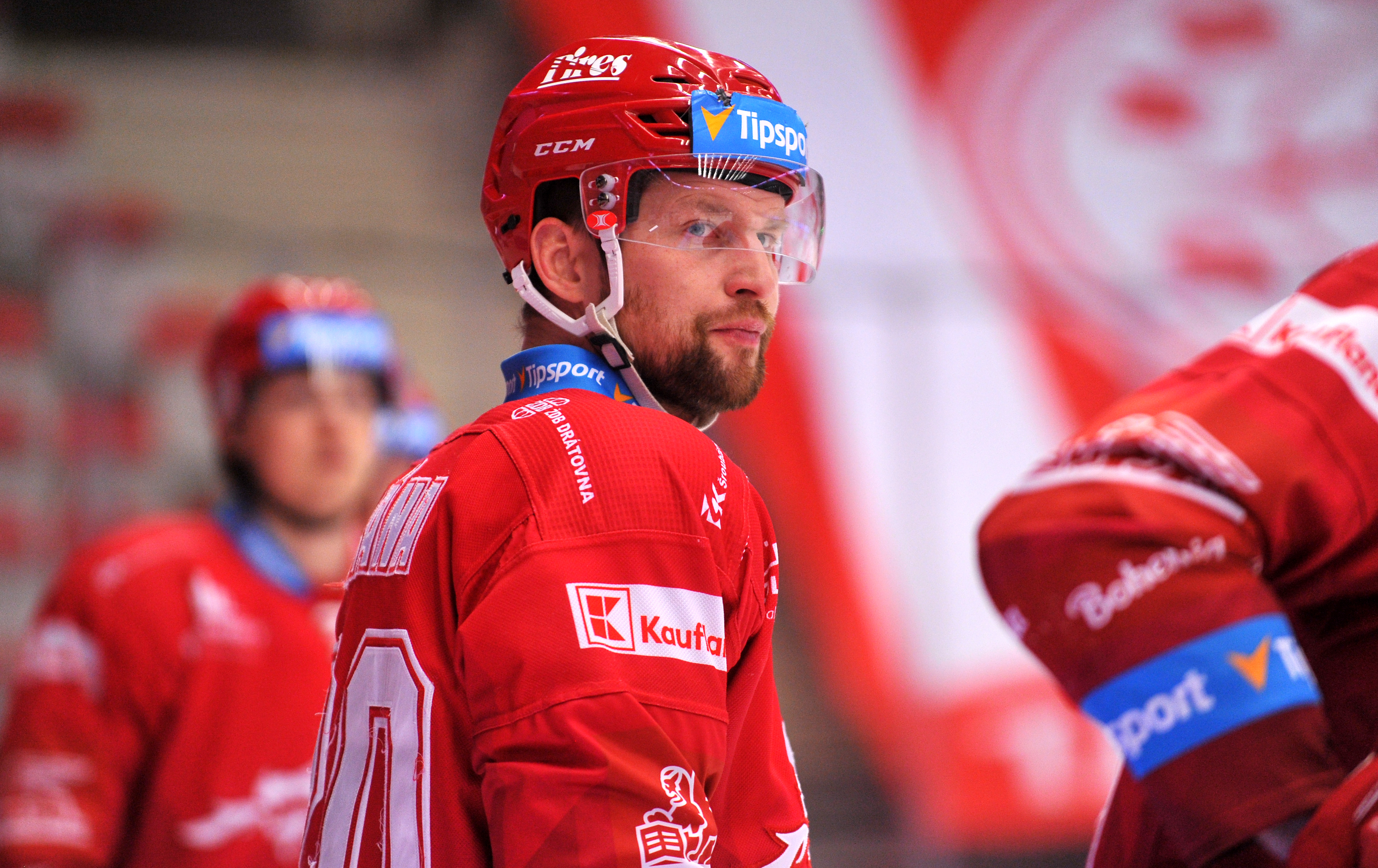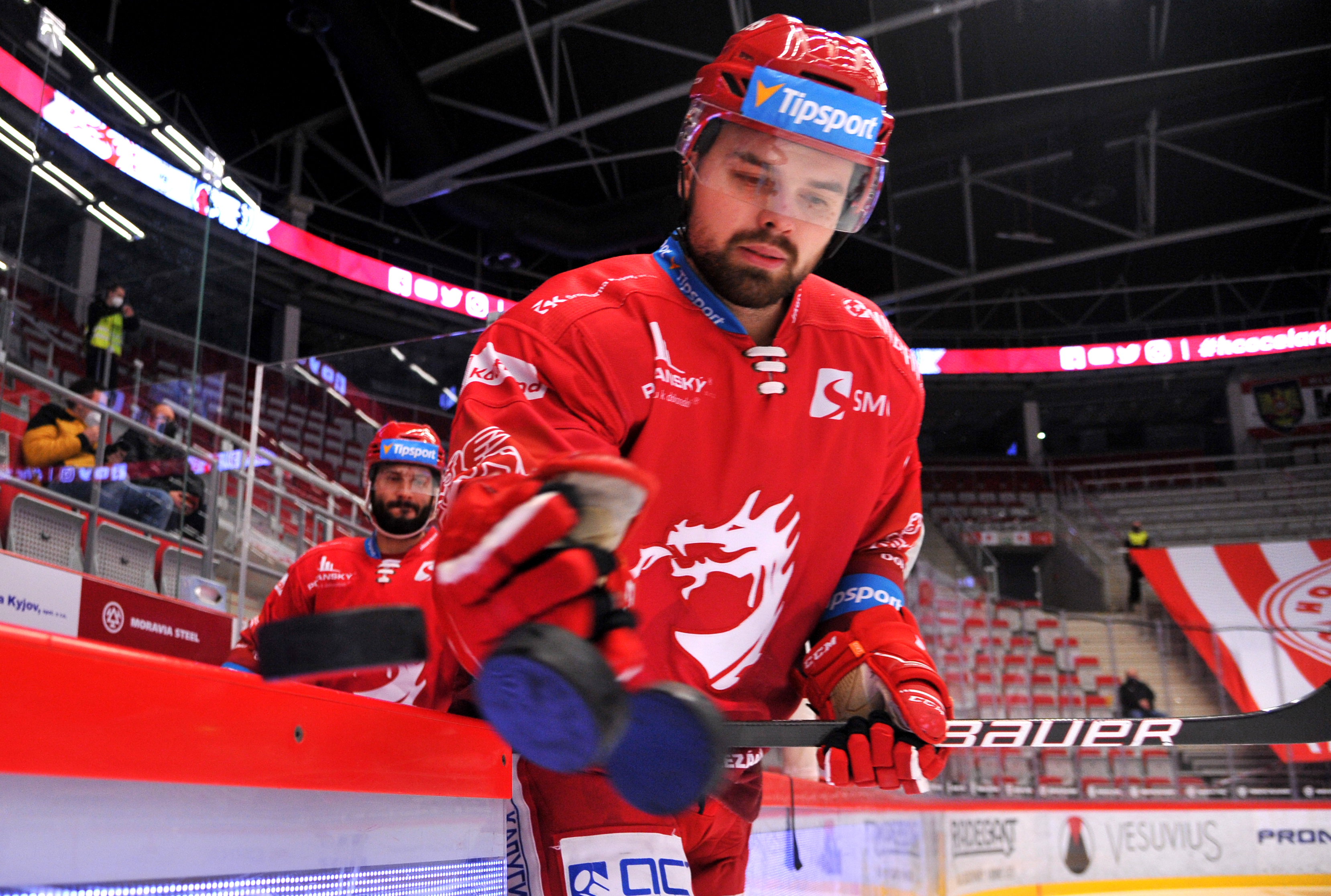 Michal Kovařčík sleduje soupeře při rozbruslení.