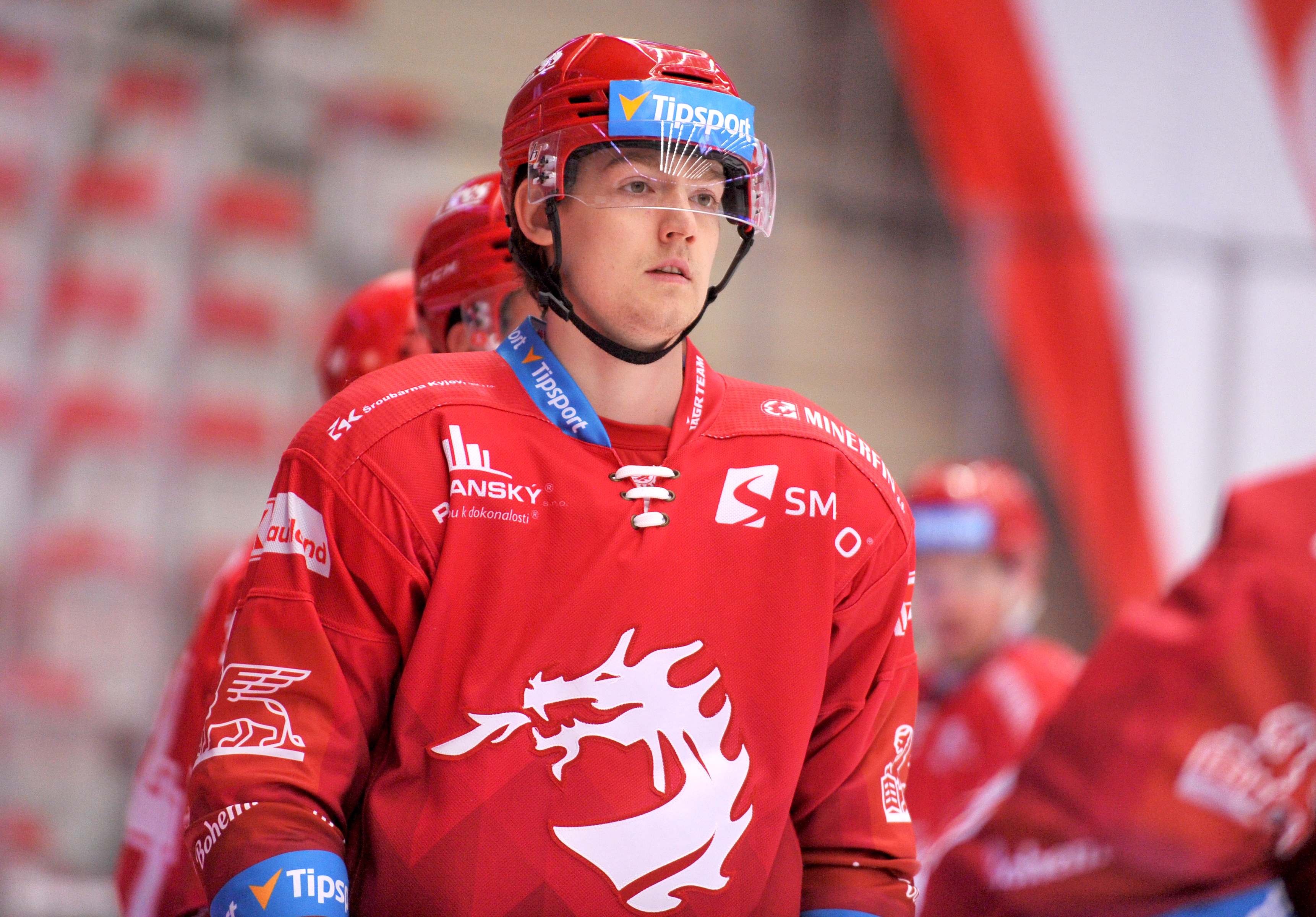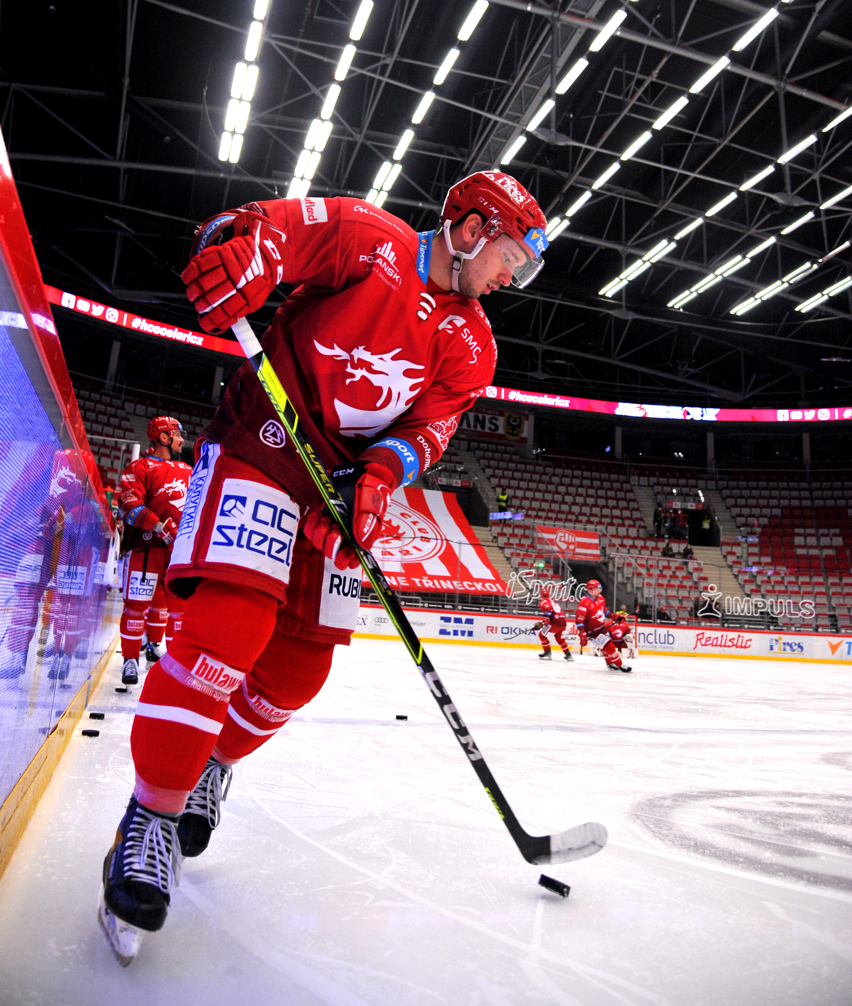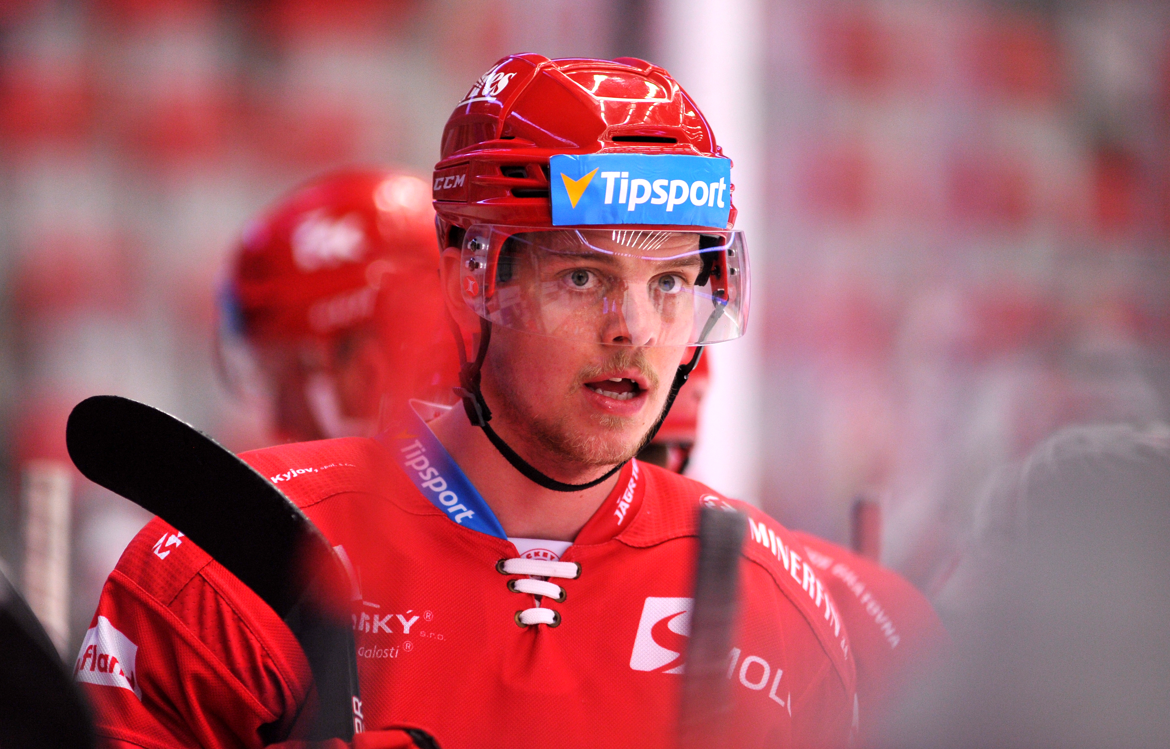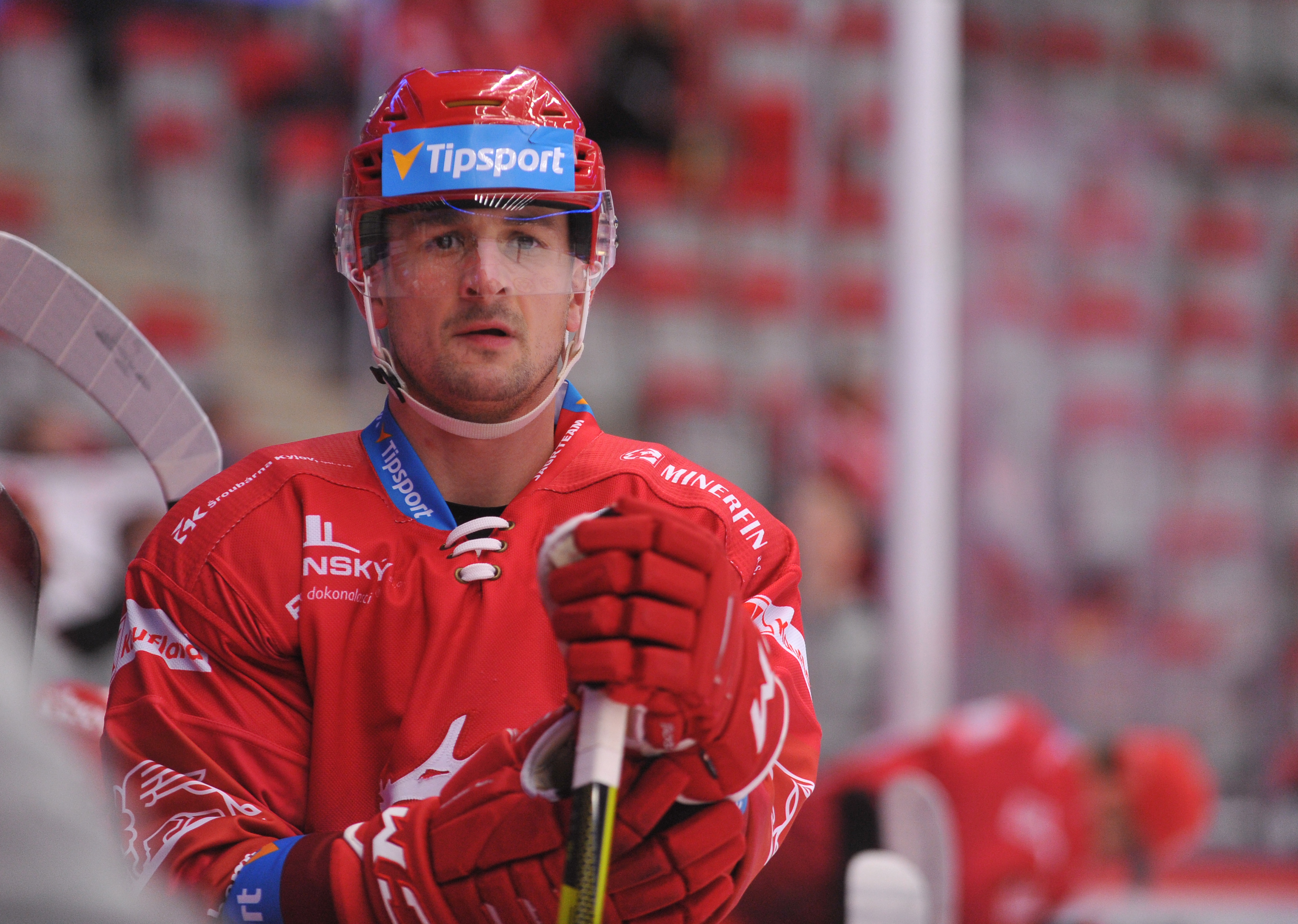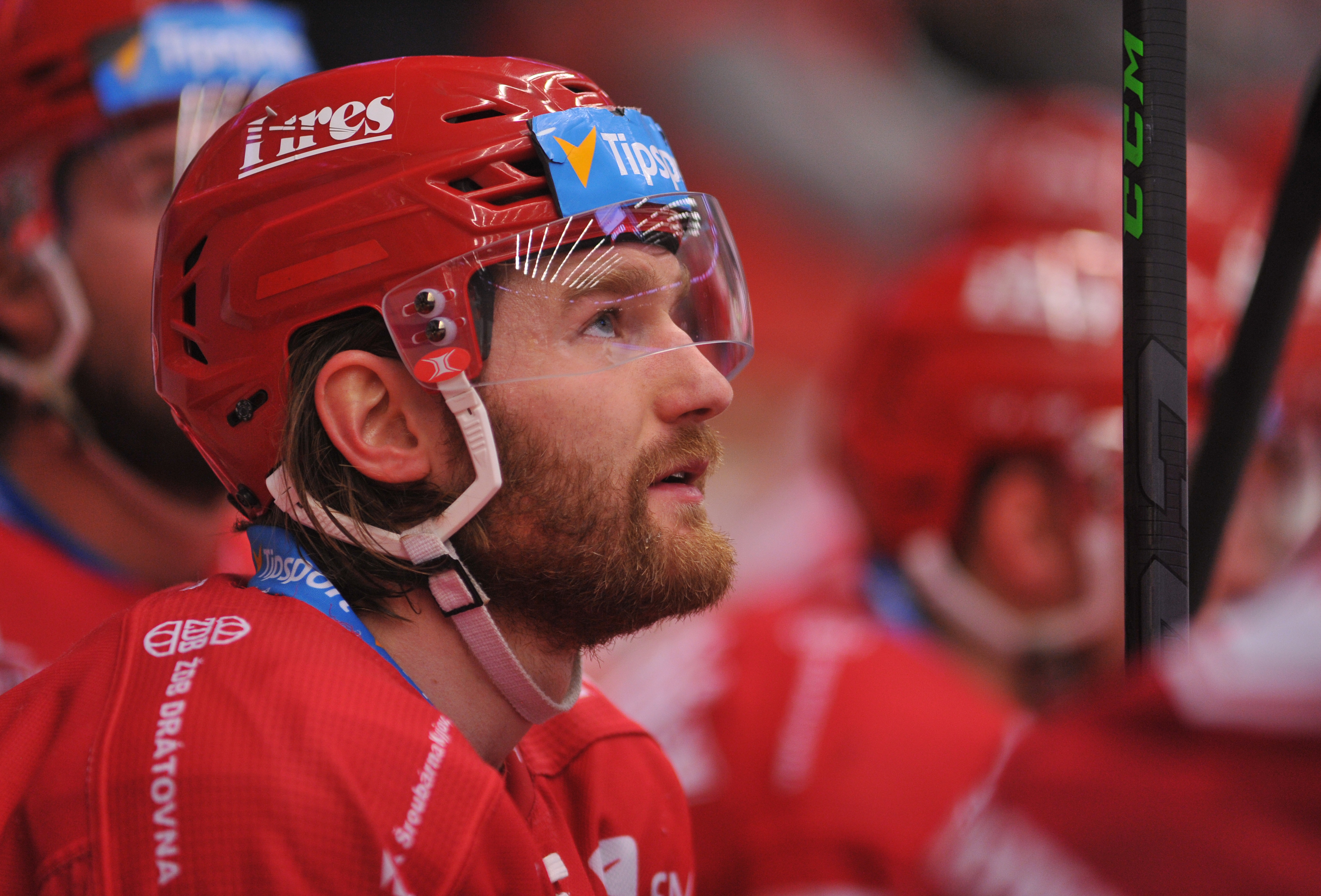 Michal Kovařčík sleduje soupeře při rozbruslení.