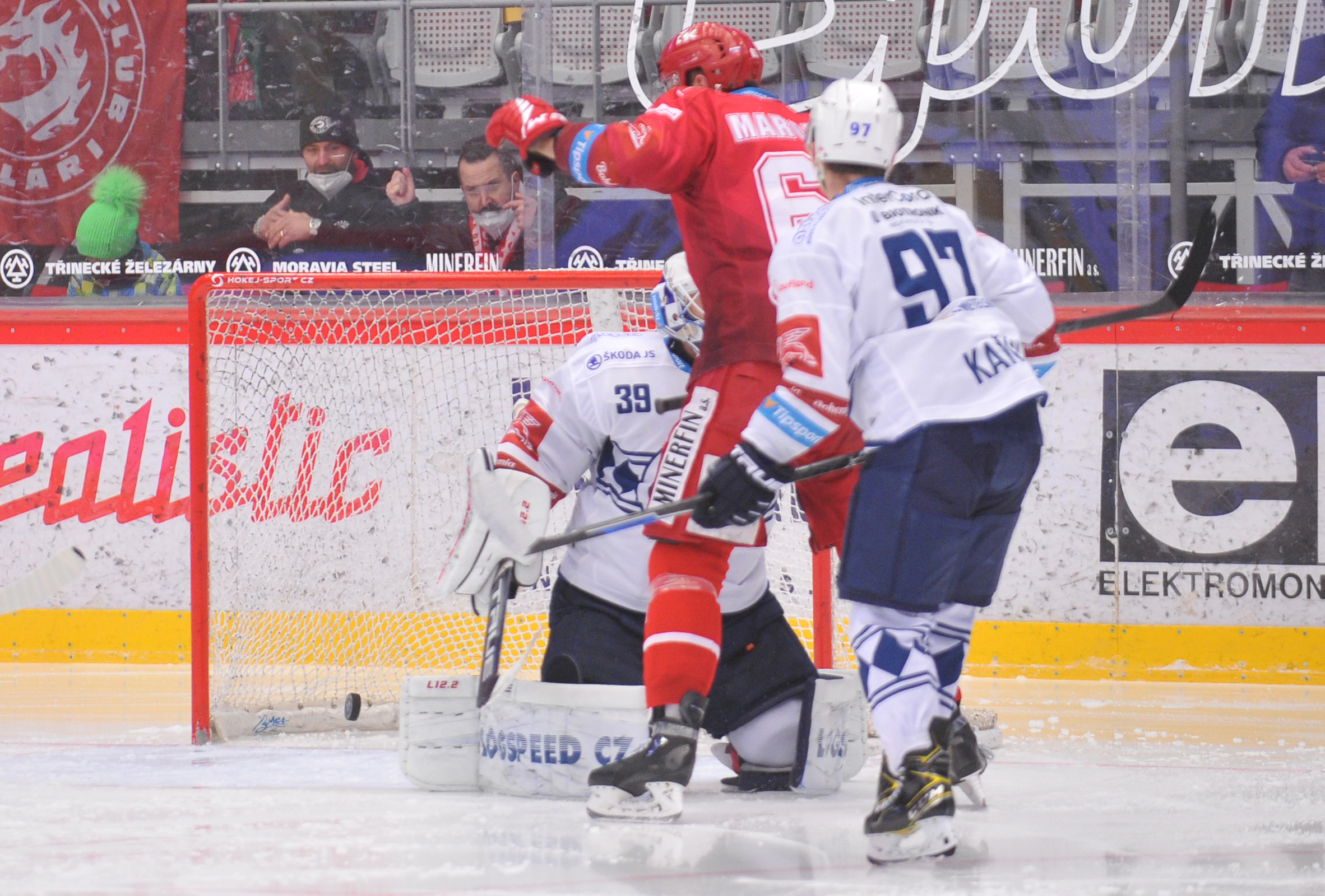 Tomáš Marcinko se snaží dotlačit puk za brankovou čáru.