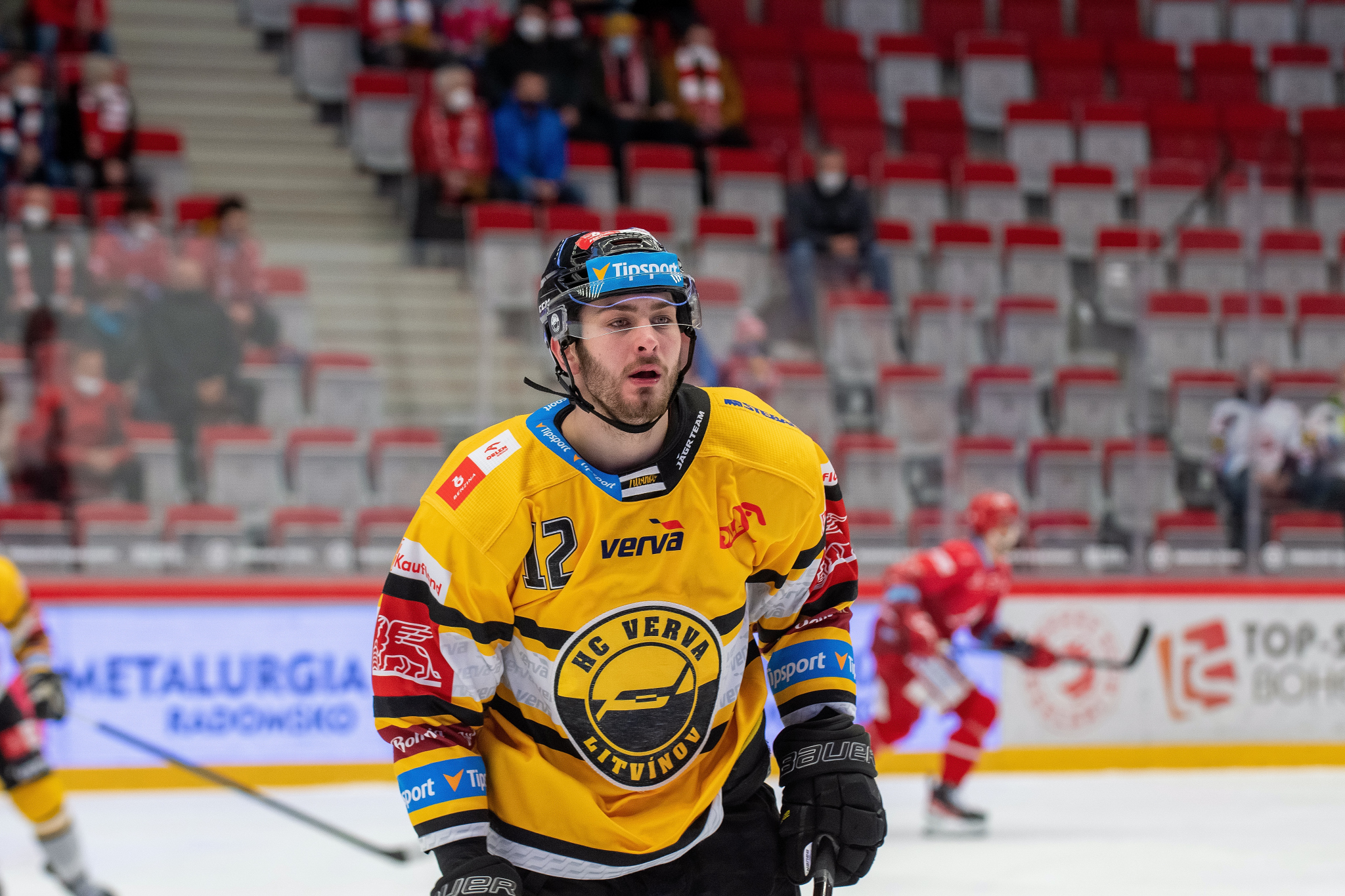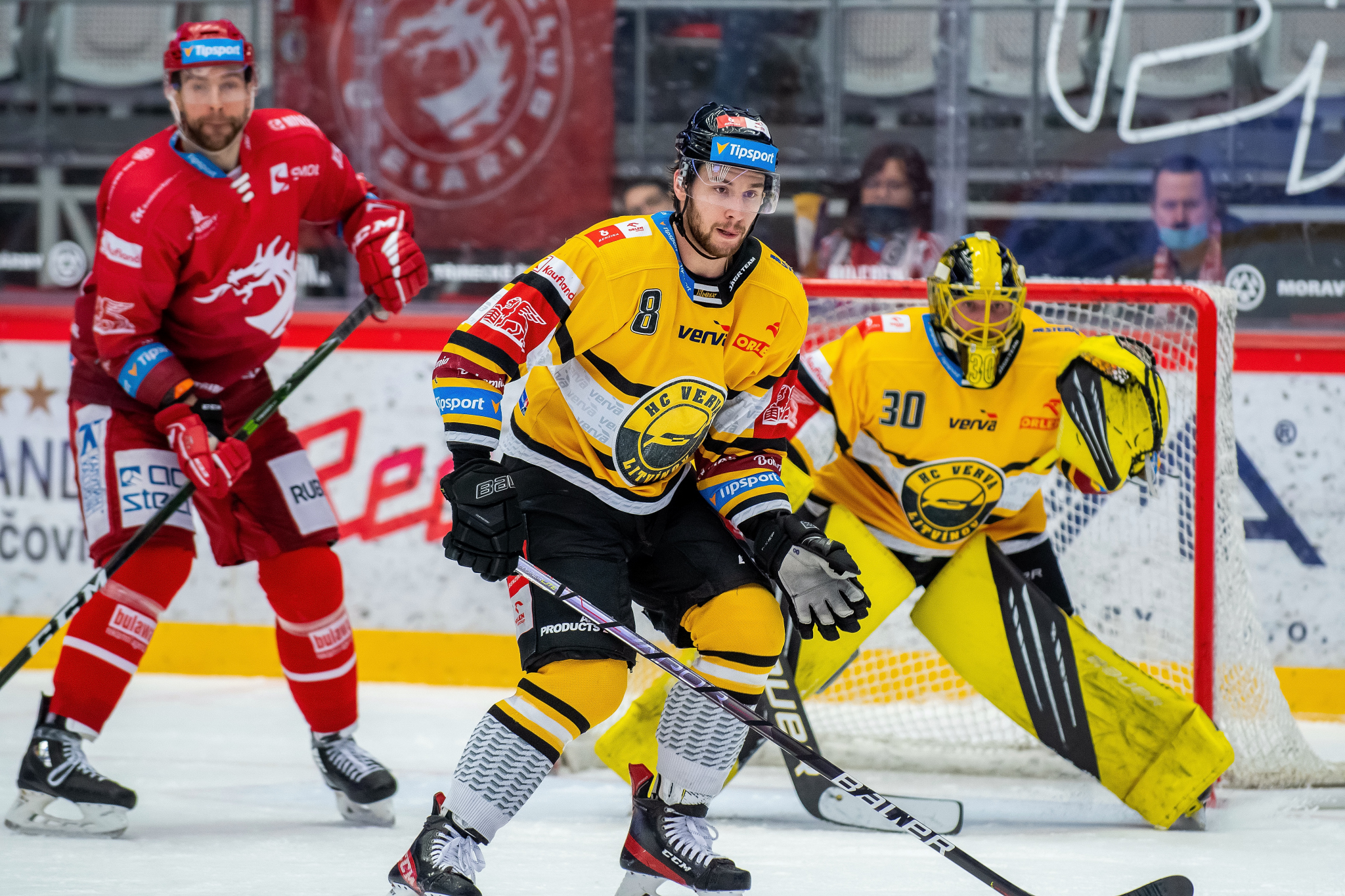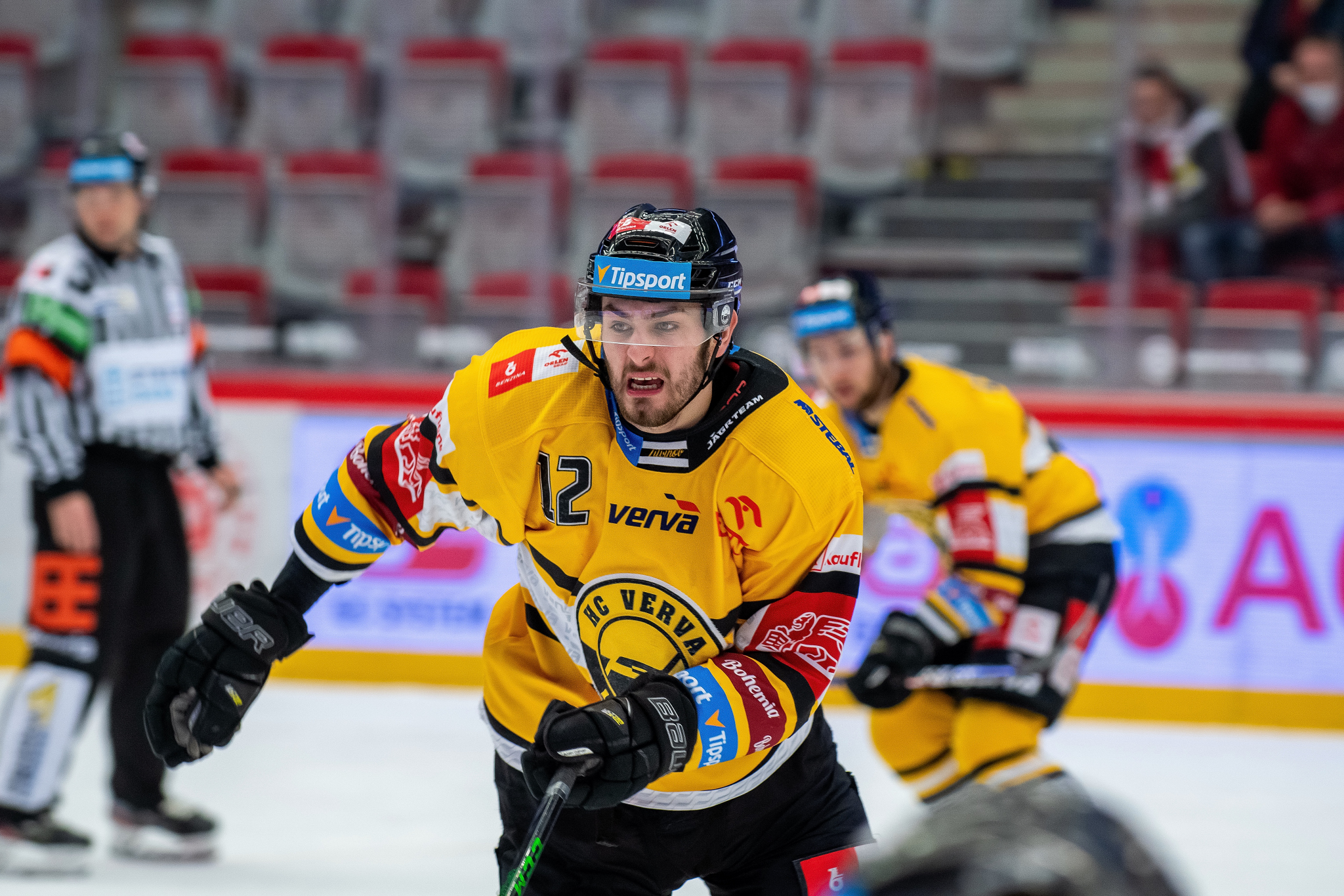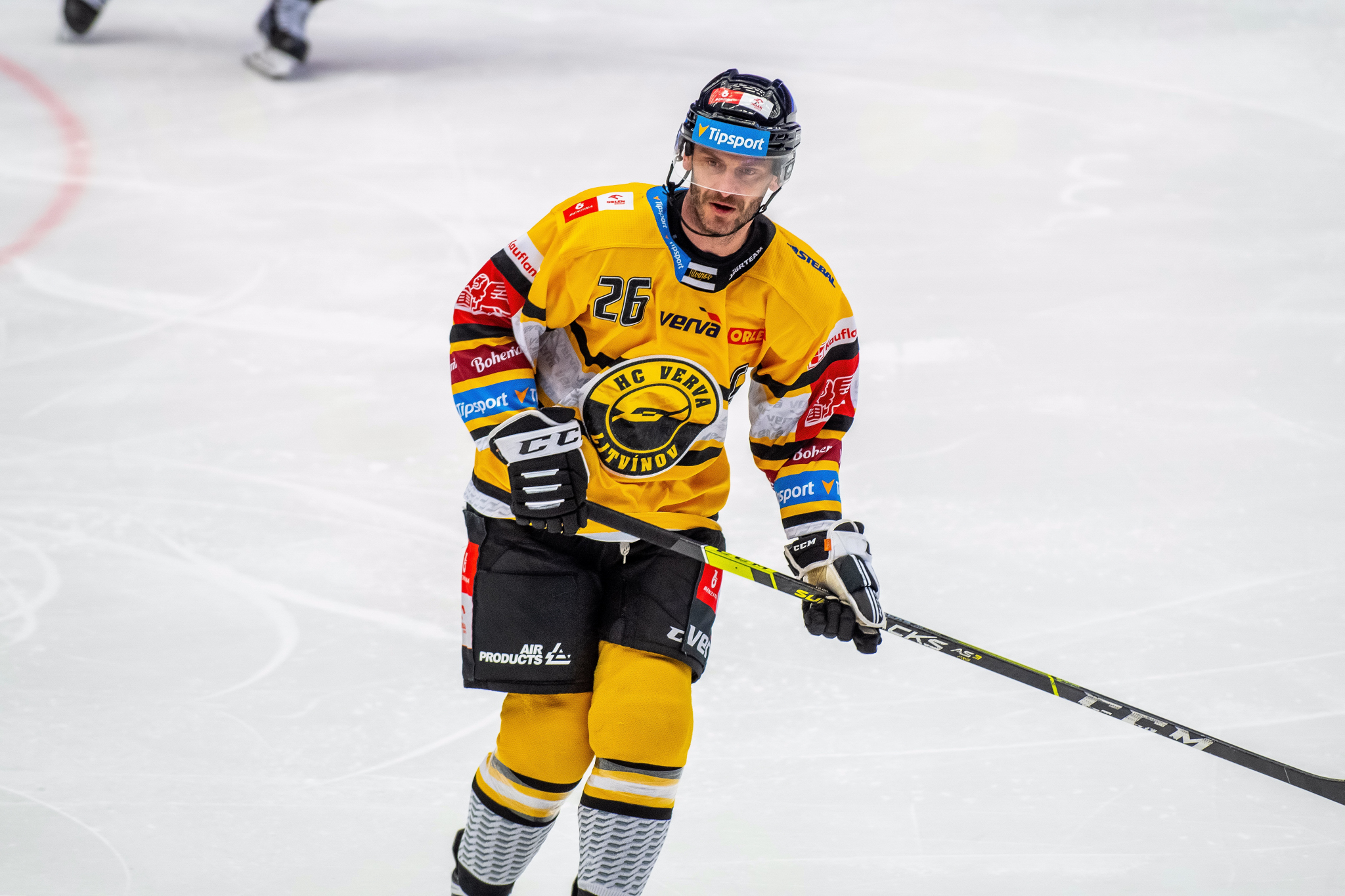 Petr Vrána sleduje soupeře před vhozením buly