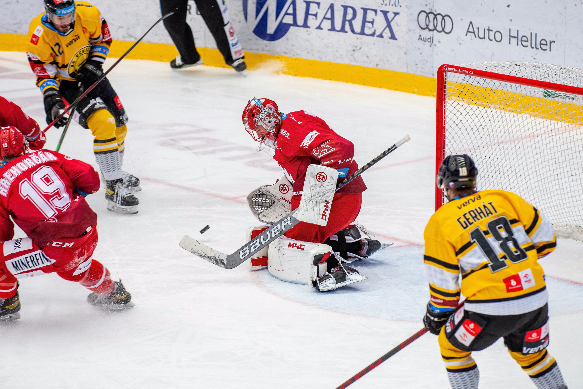 Denis Godla chytá střelu Martina Růžičky