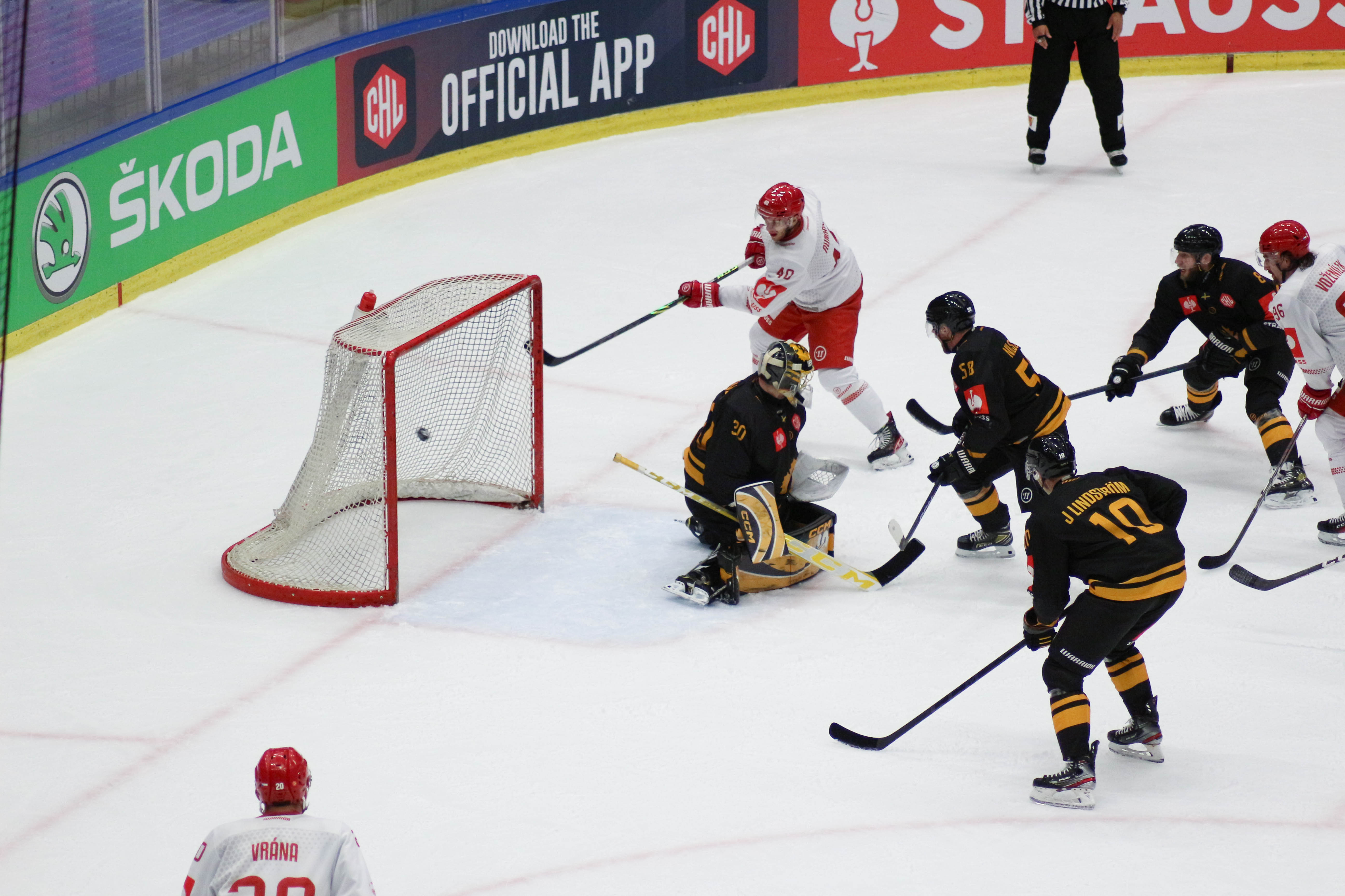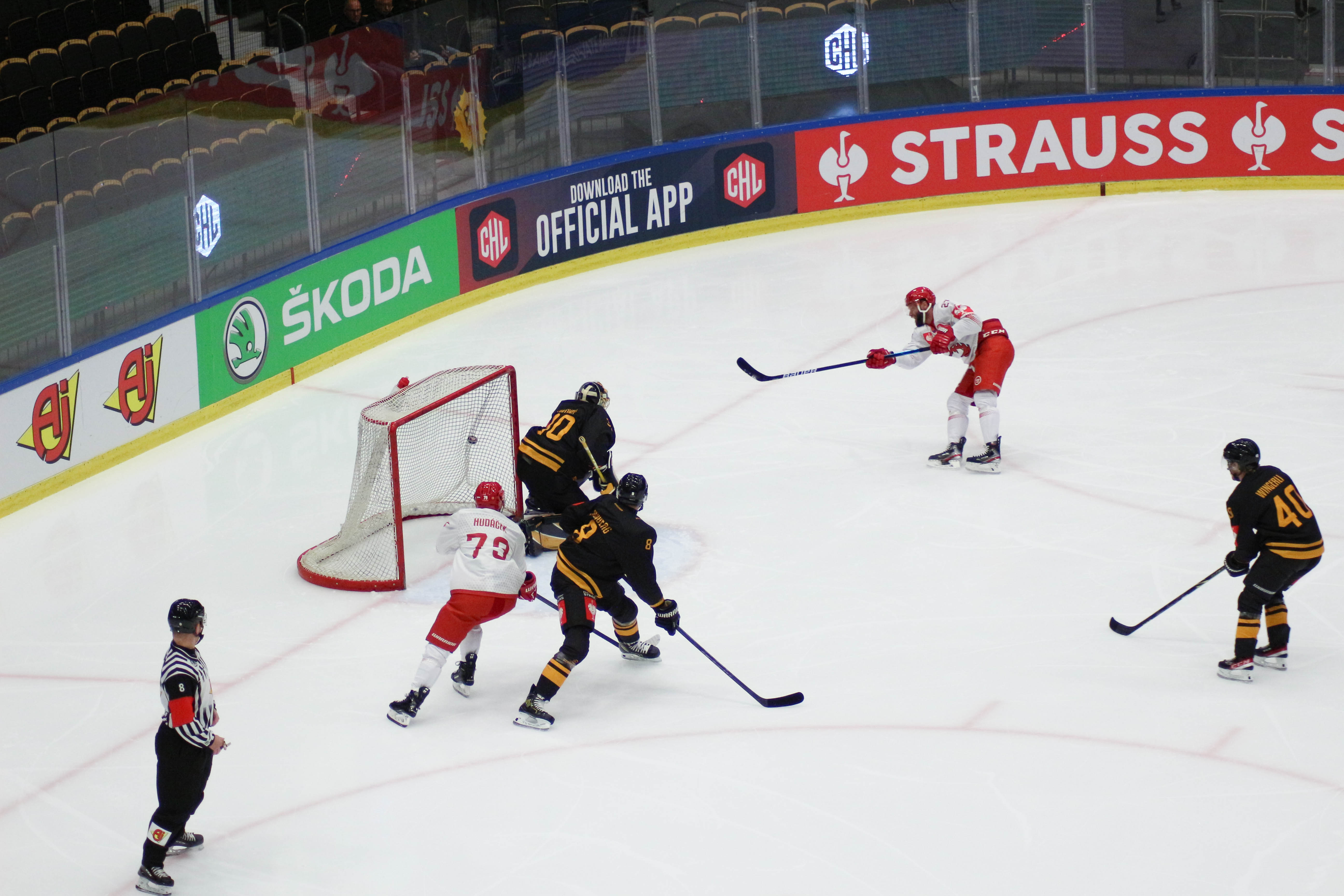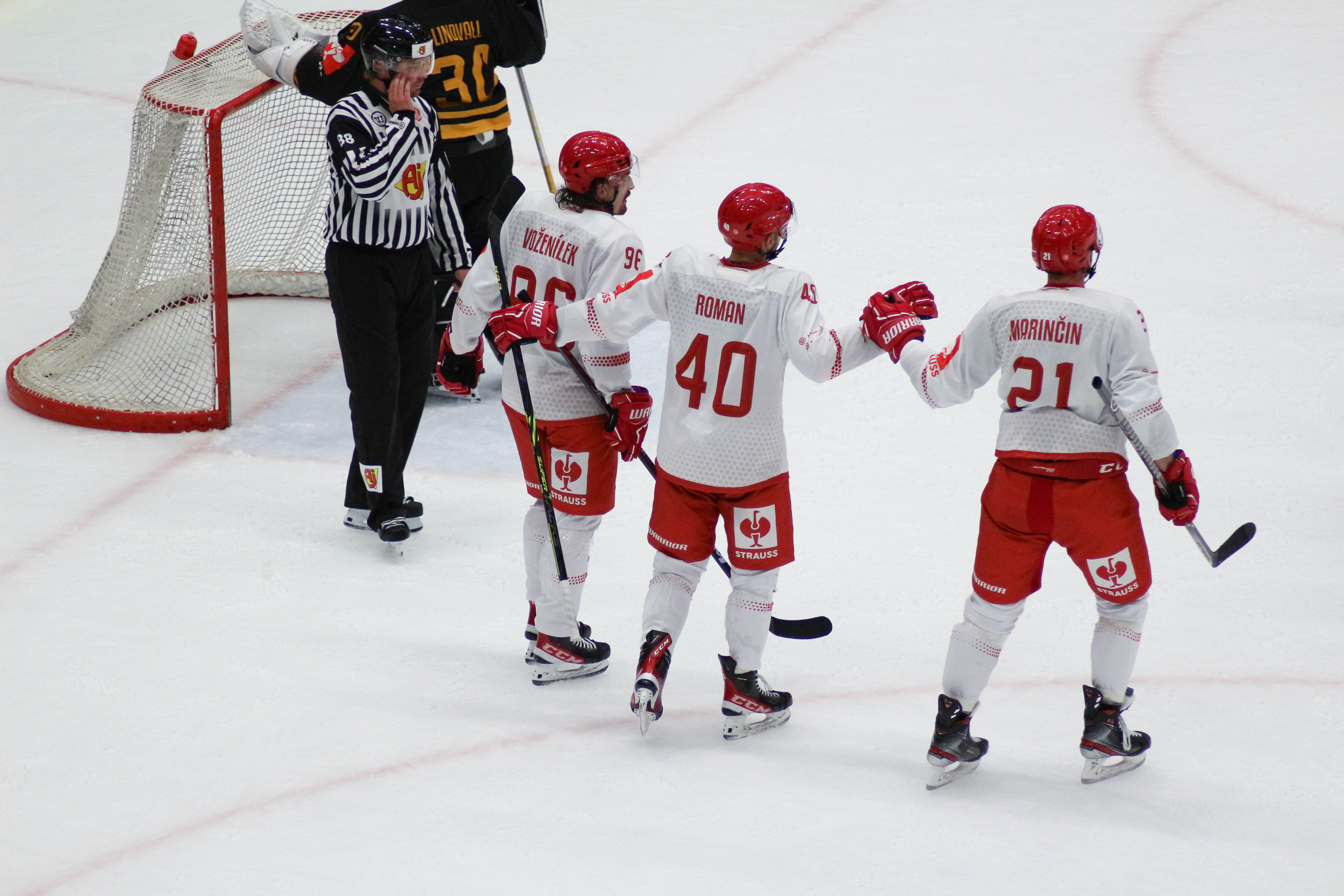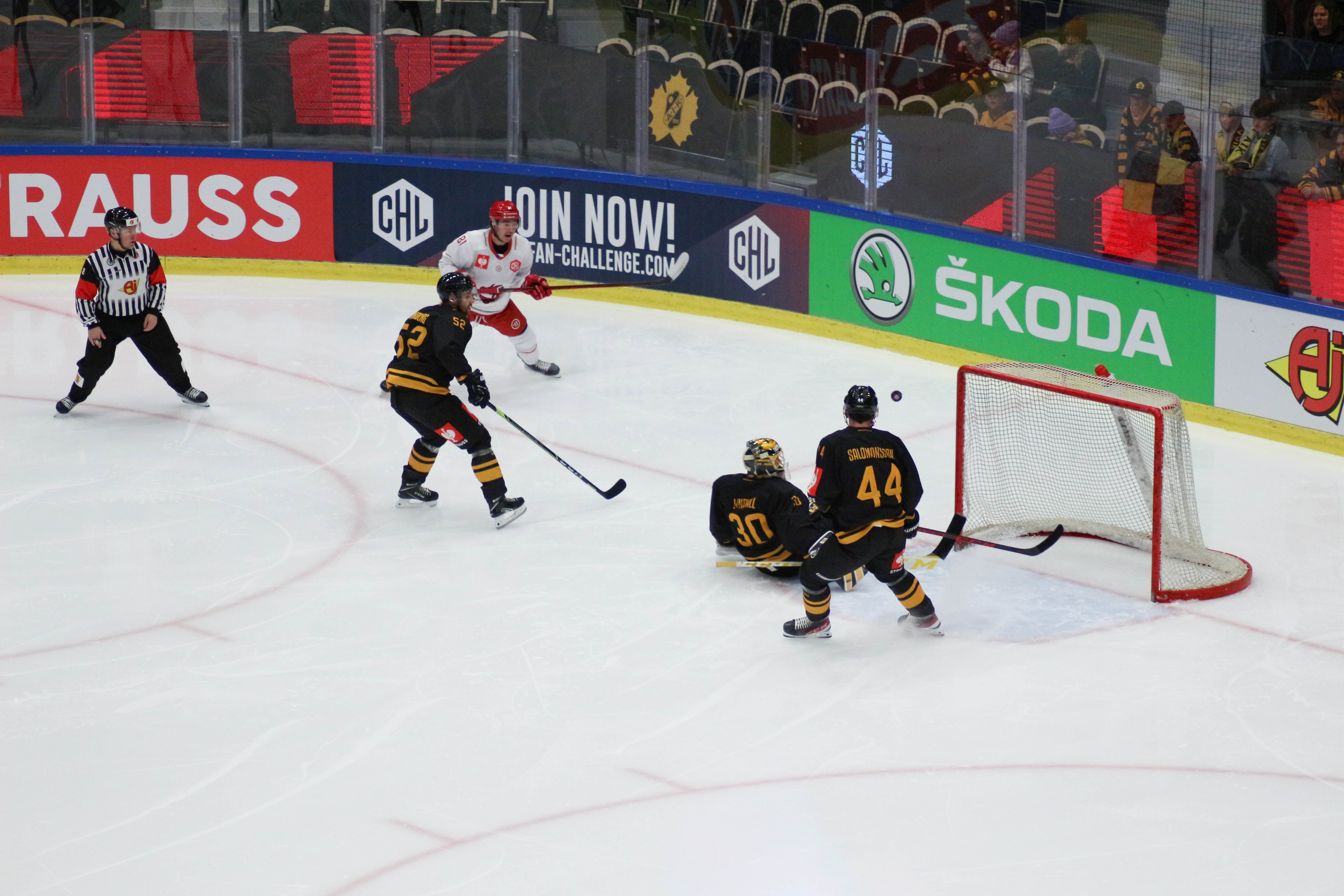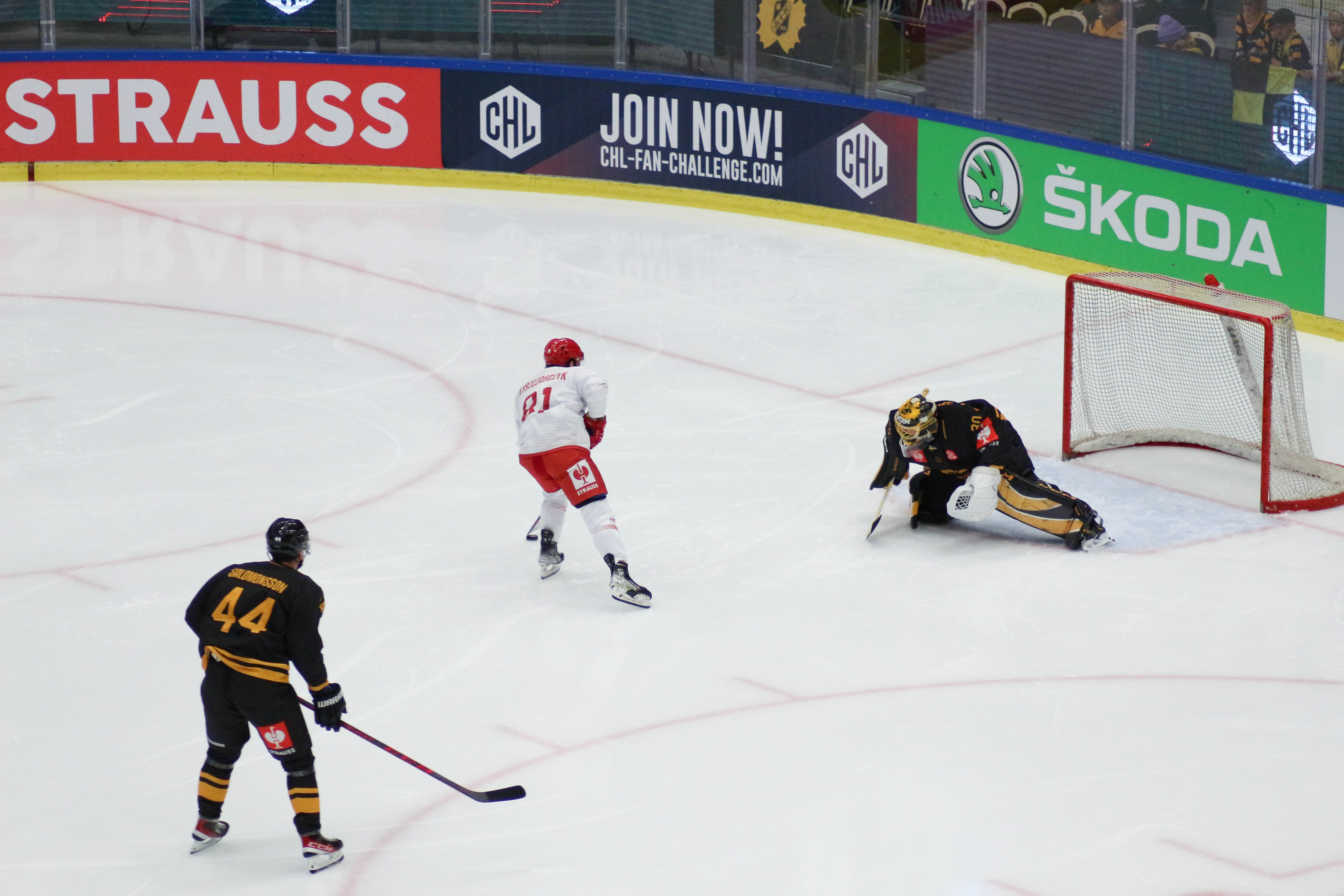 Hráči sledují puk po zakončení Alana Lyszczarczyka