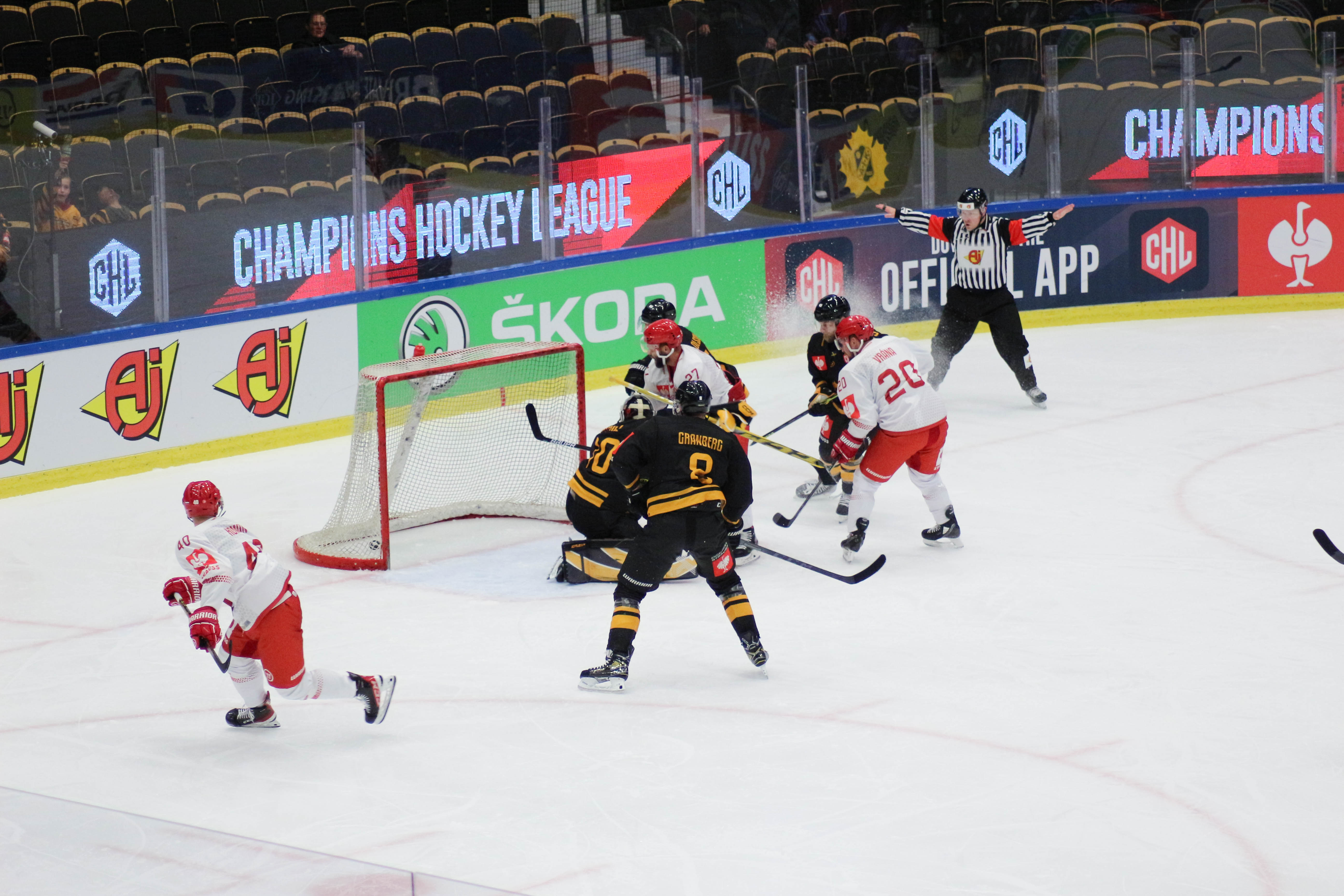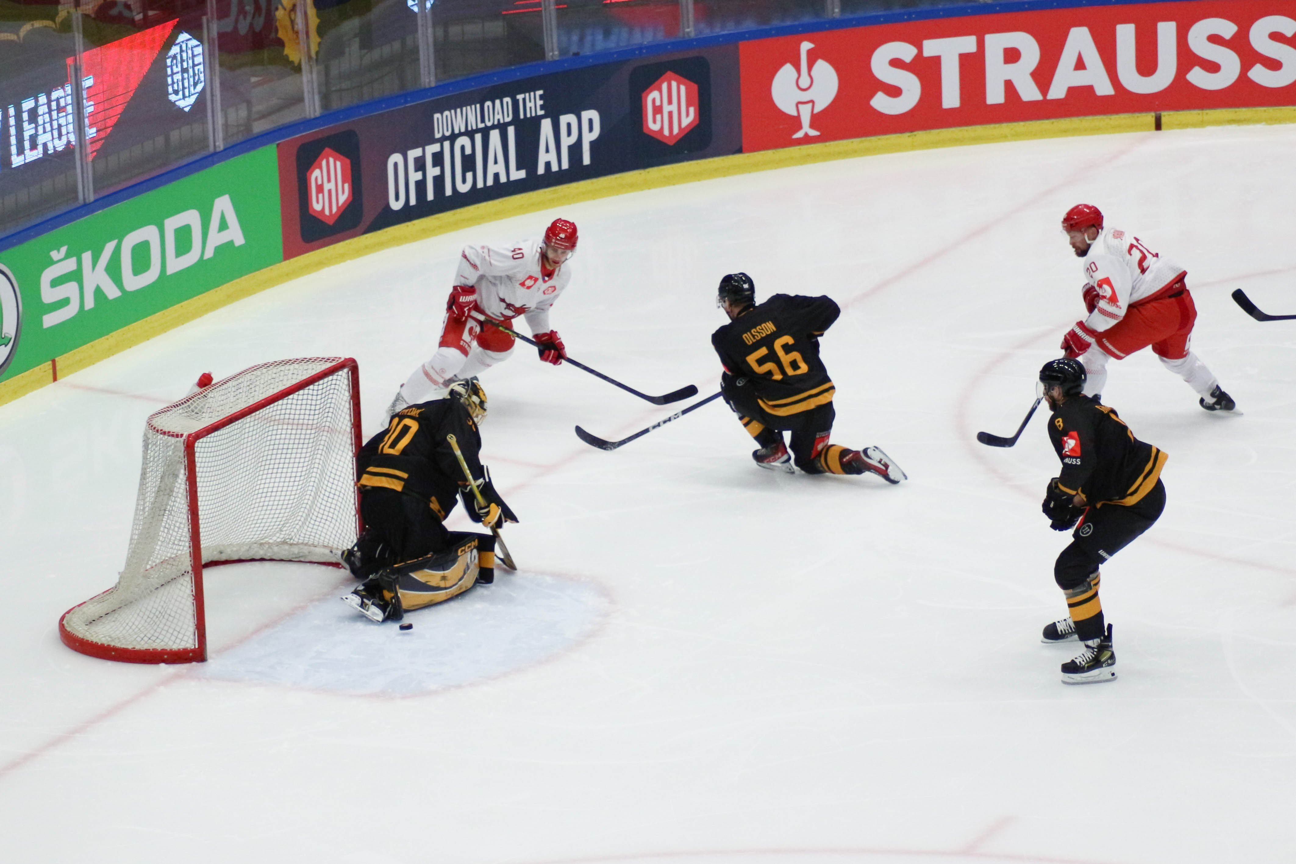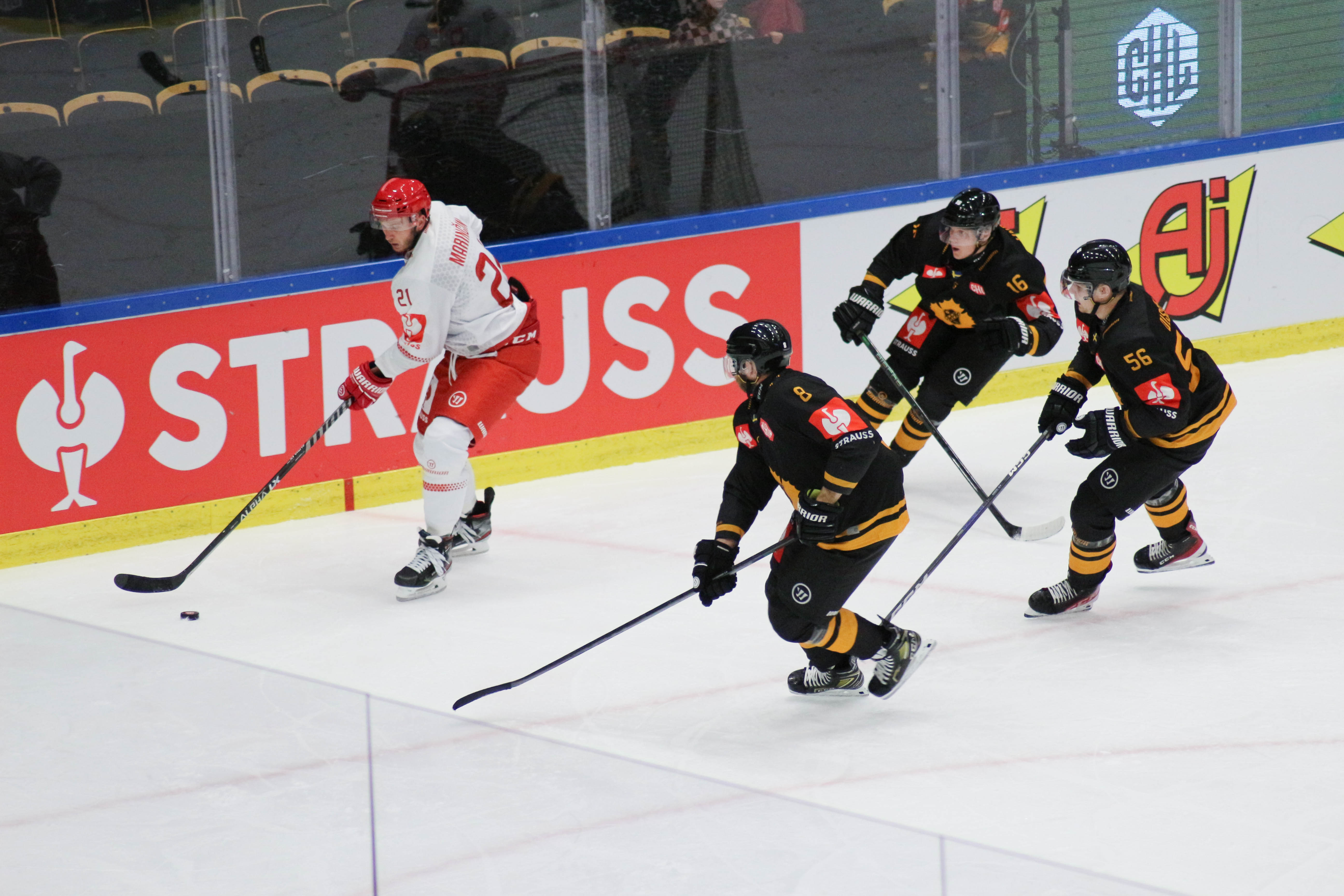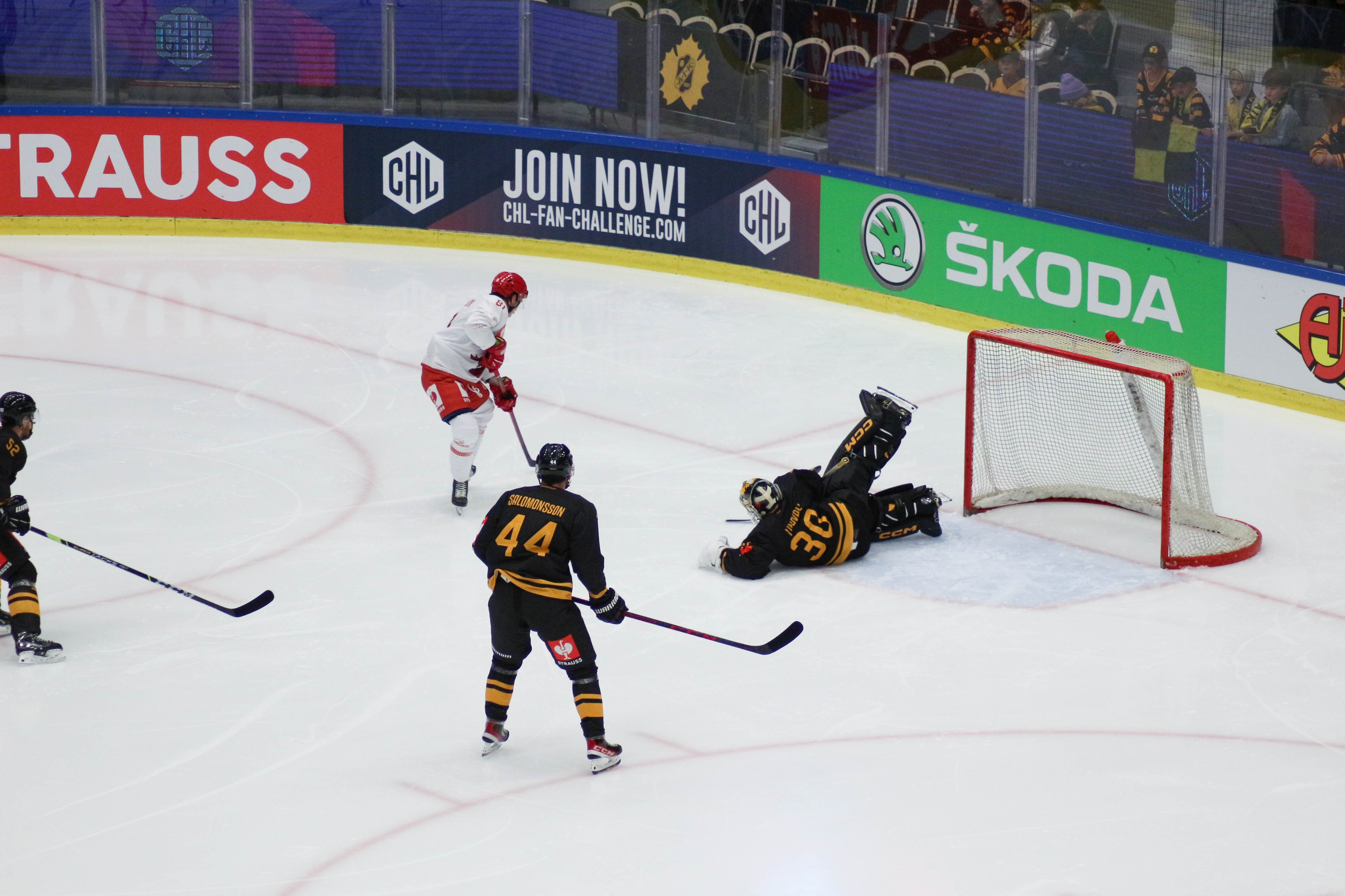 Hráči sledují puk po zakončení Alana Lyszczarczyka