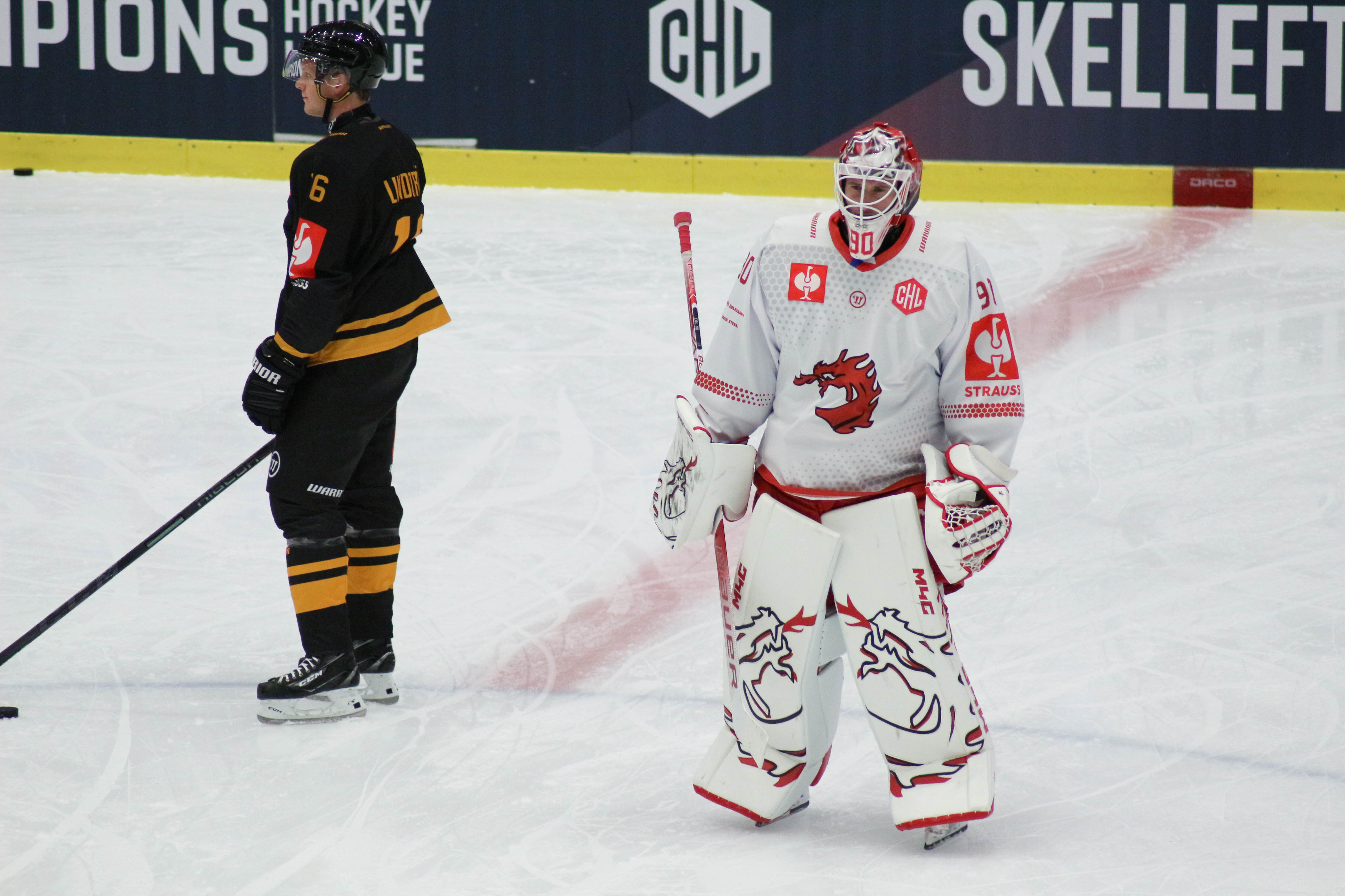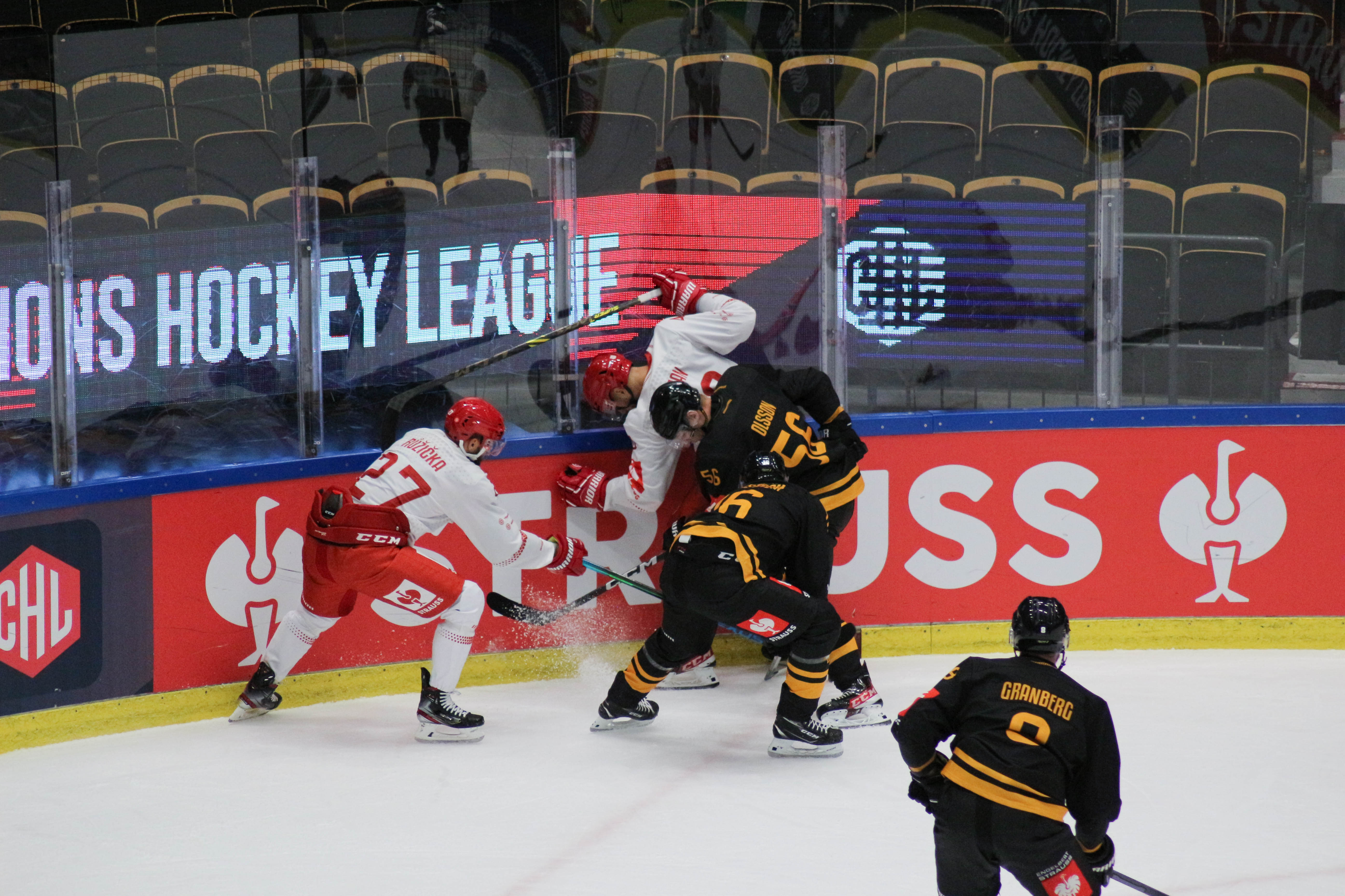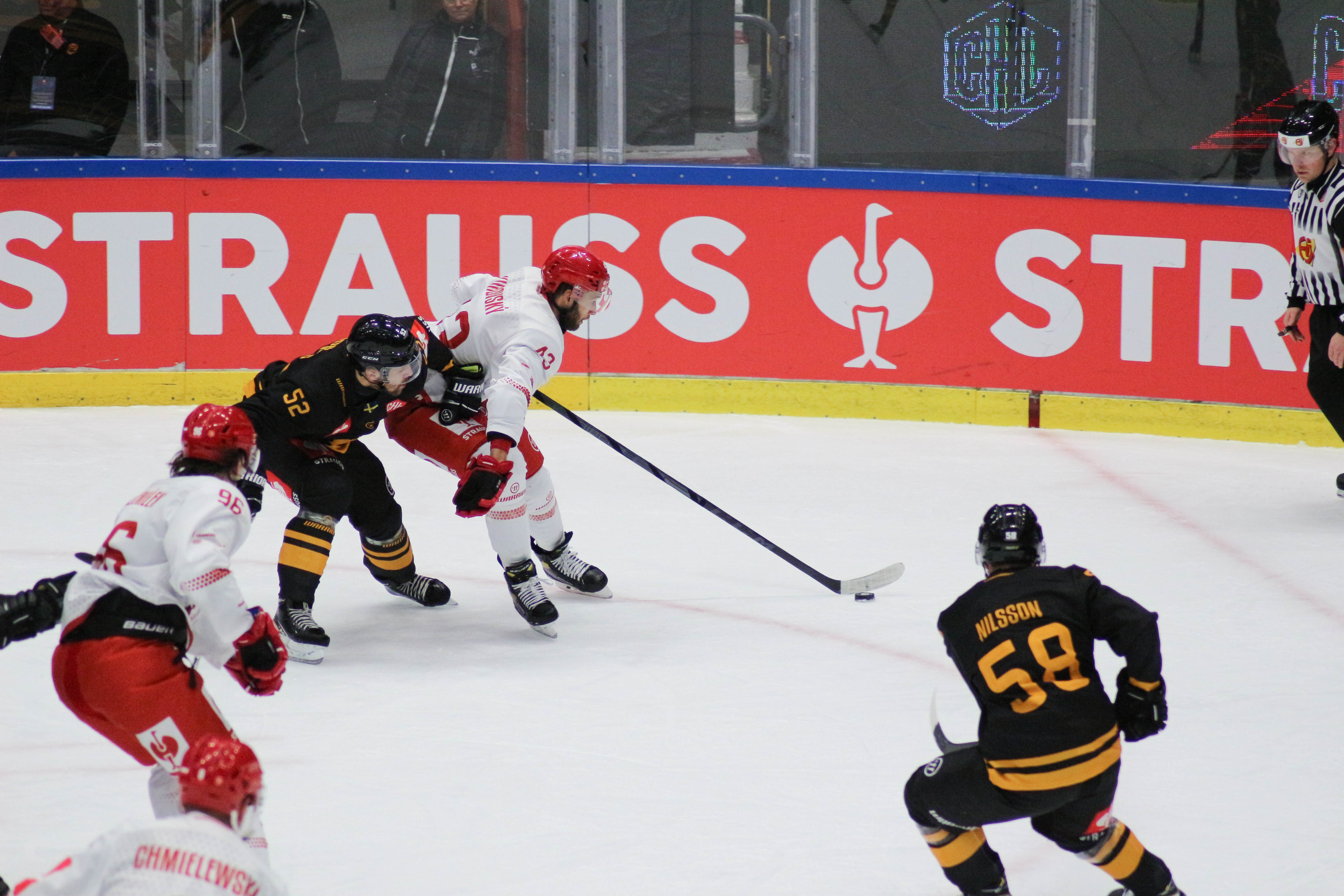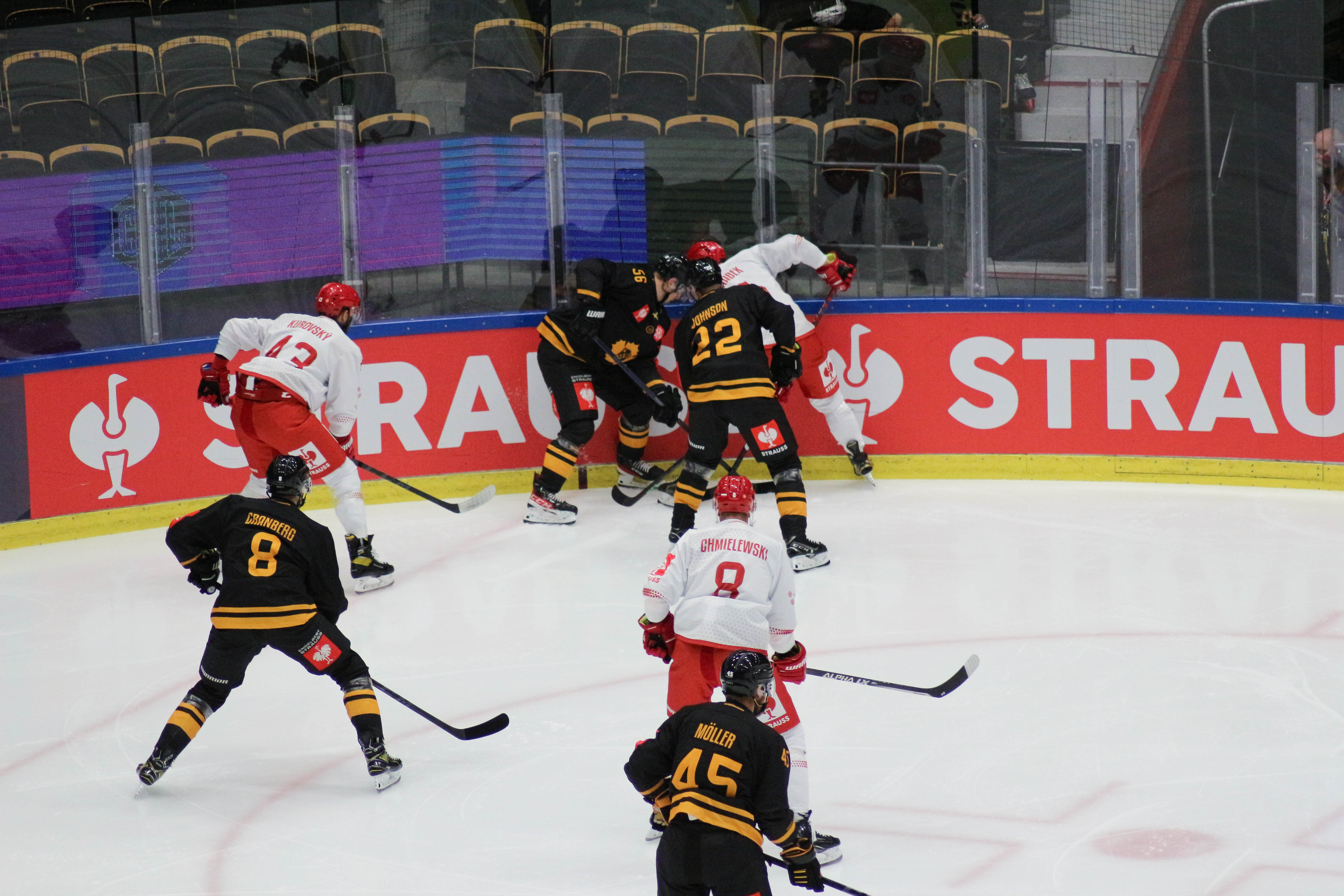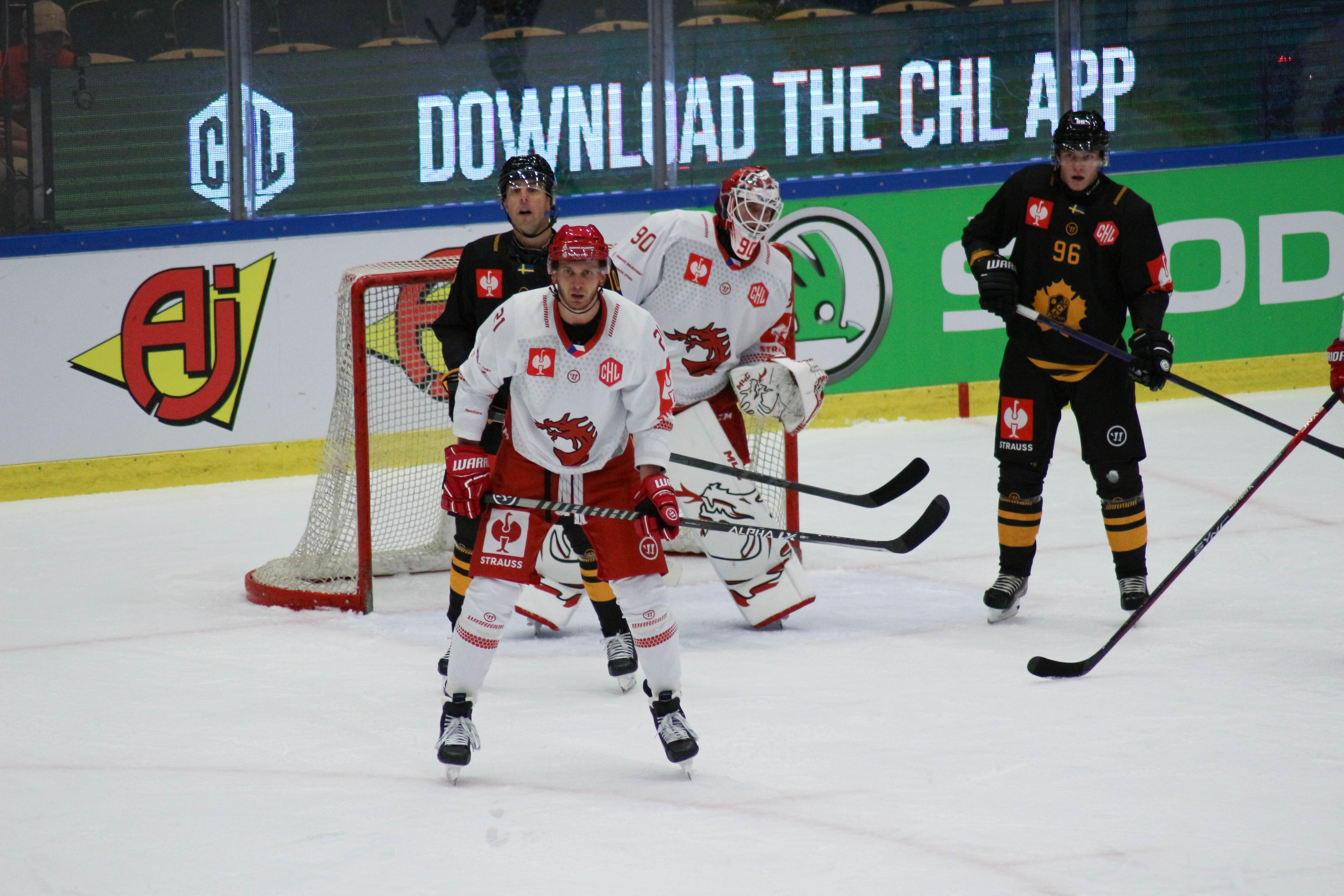 Hráči sledují puk po zakončení Alana Lyszczarczyka