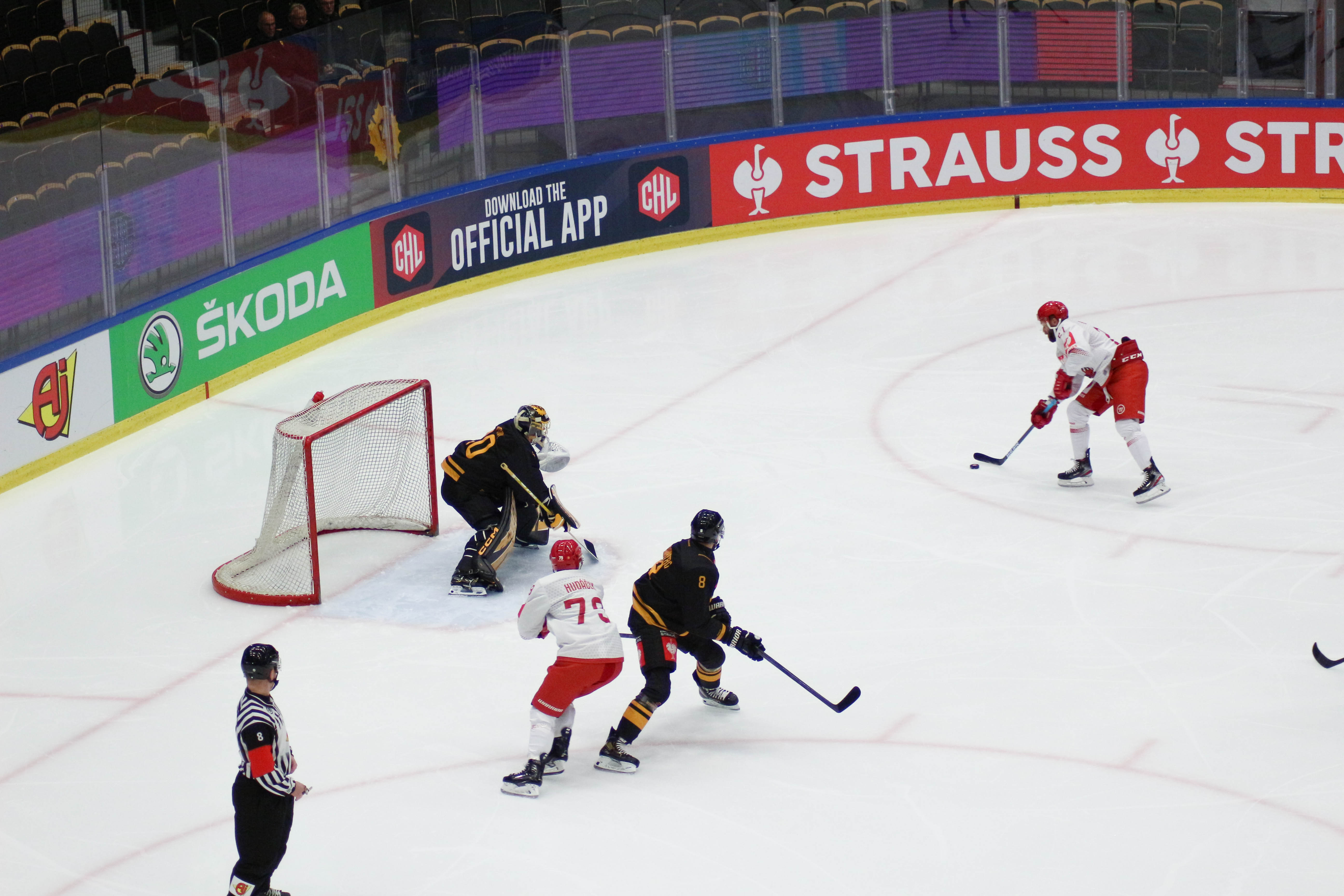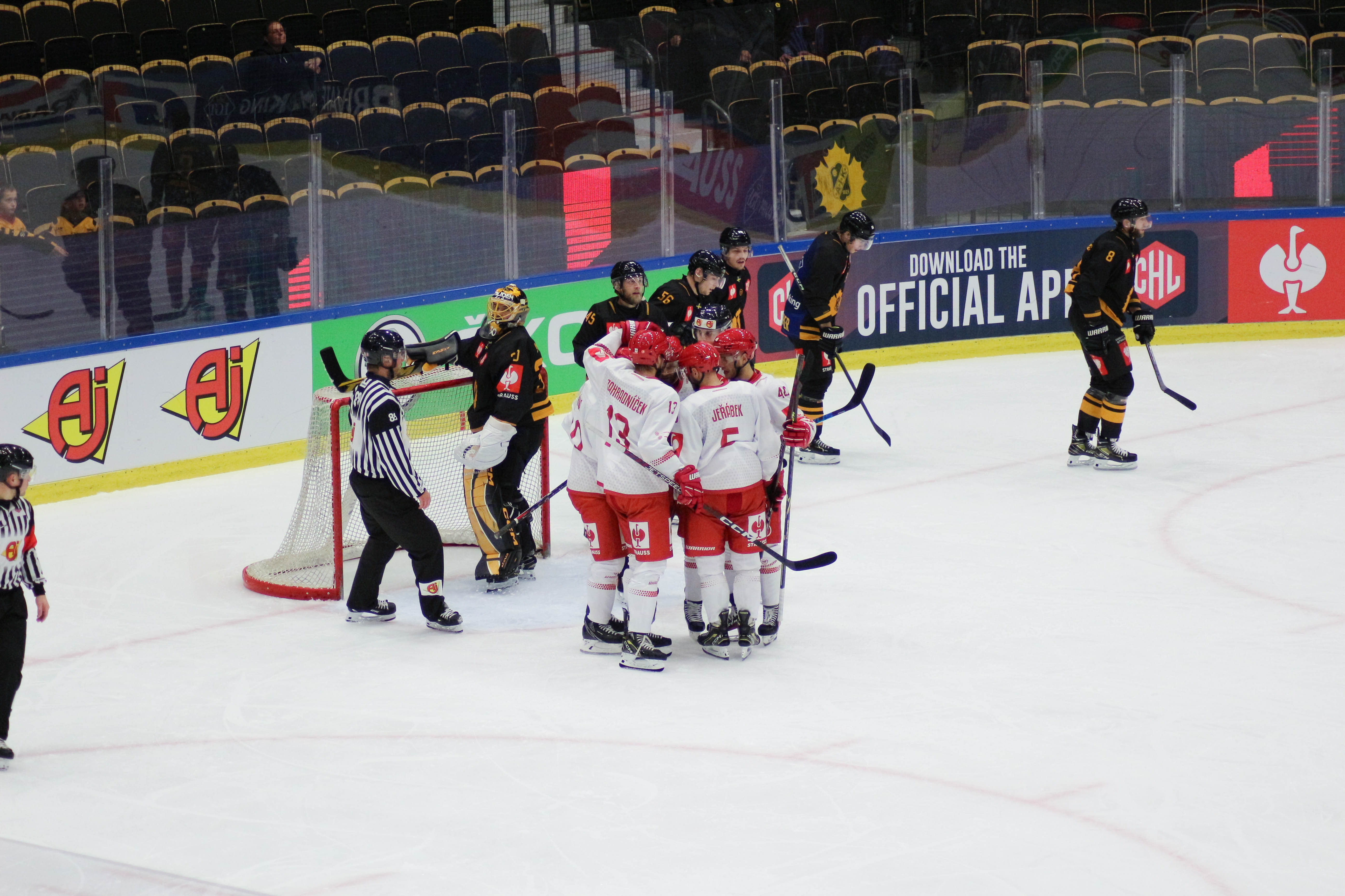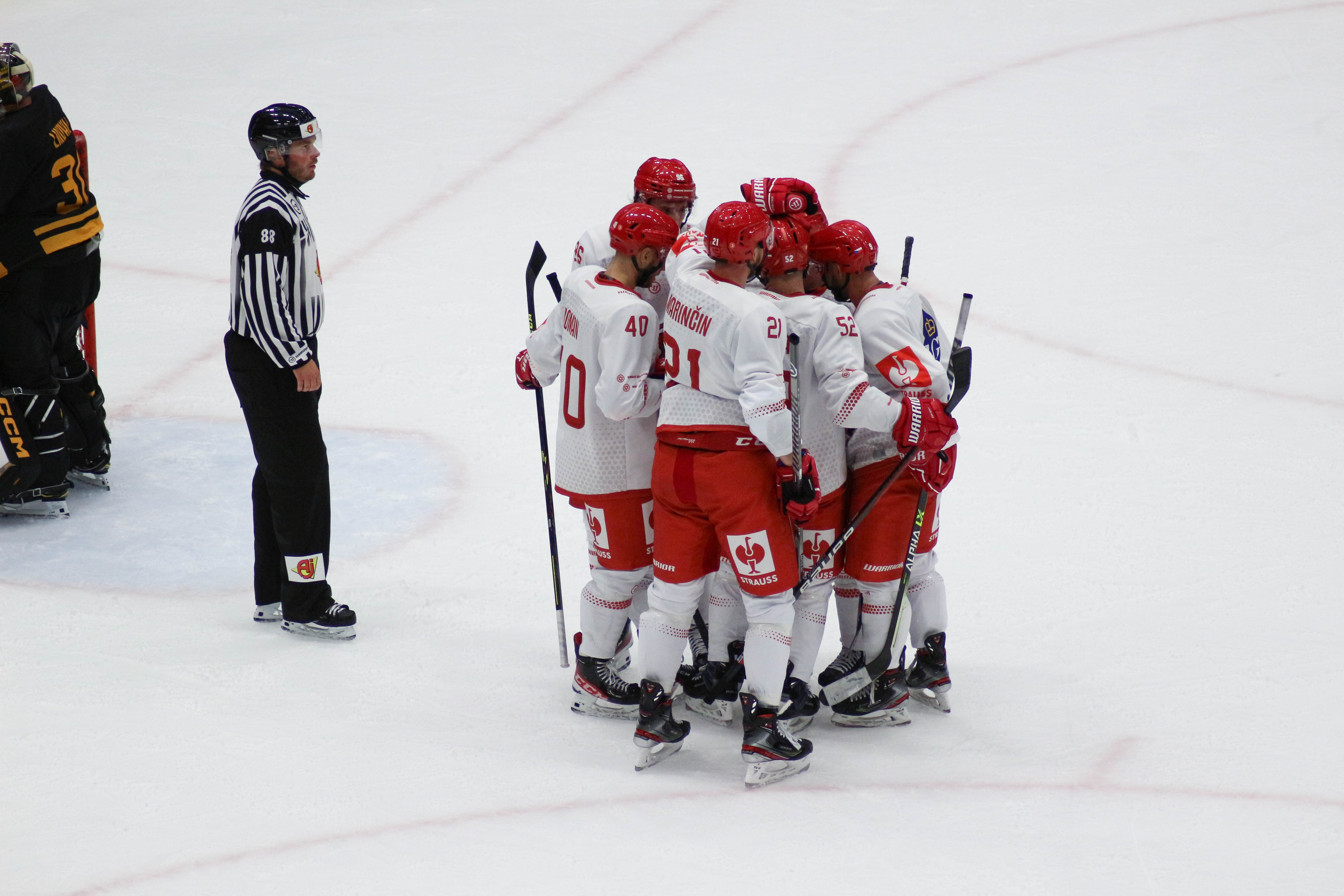 Rozhodčí po šanci Ocelářů rozpažuje...