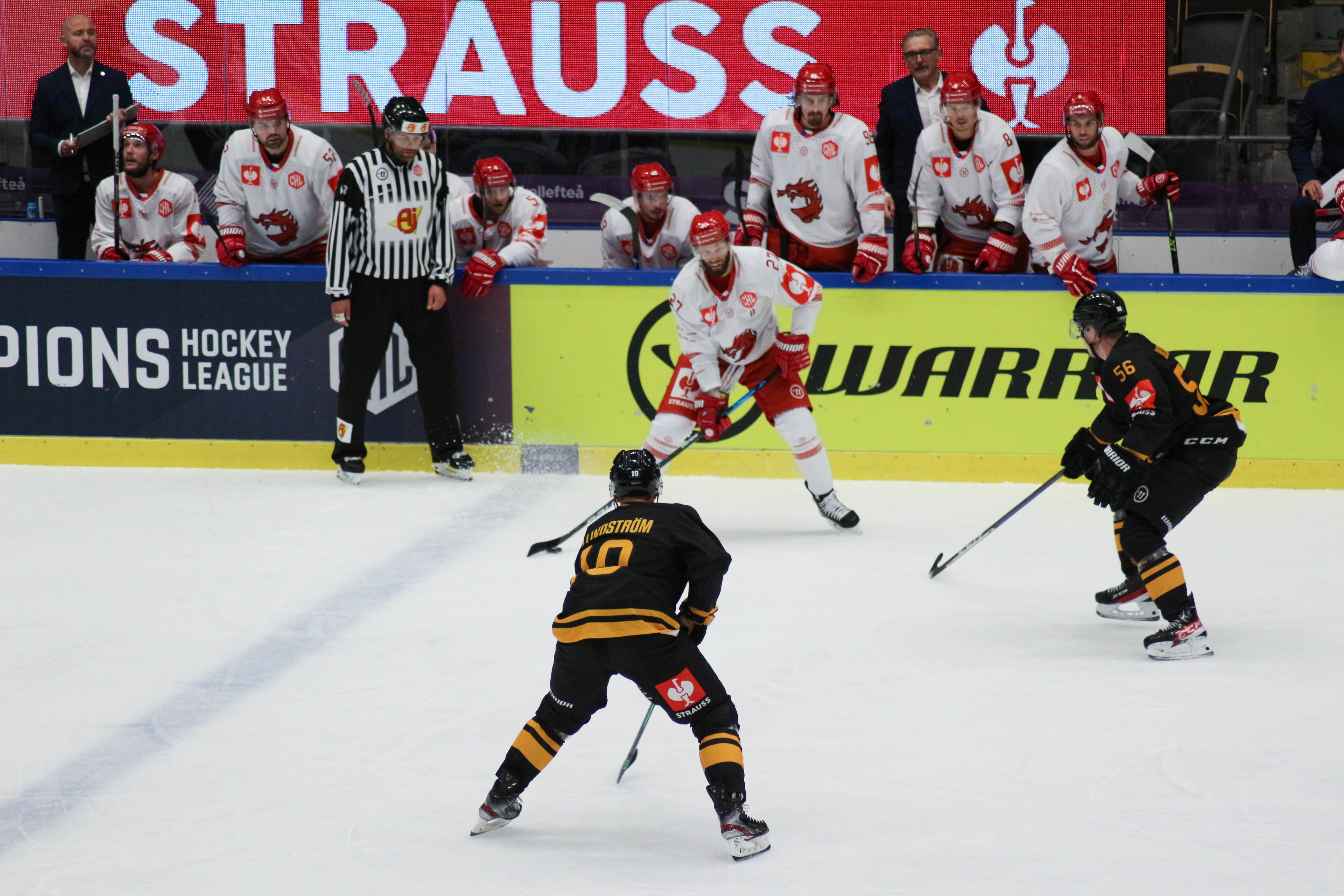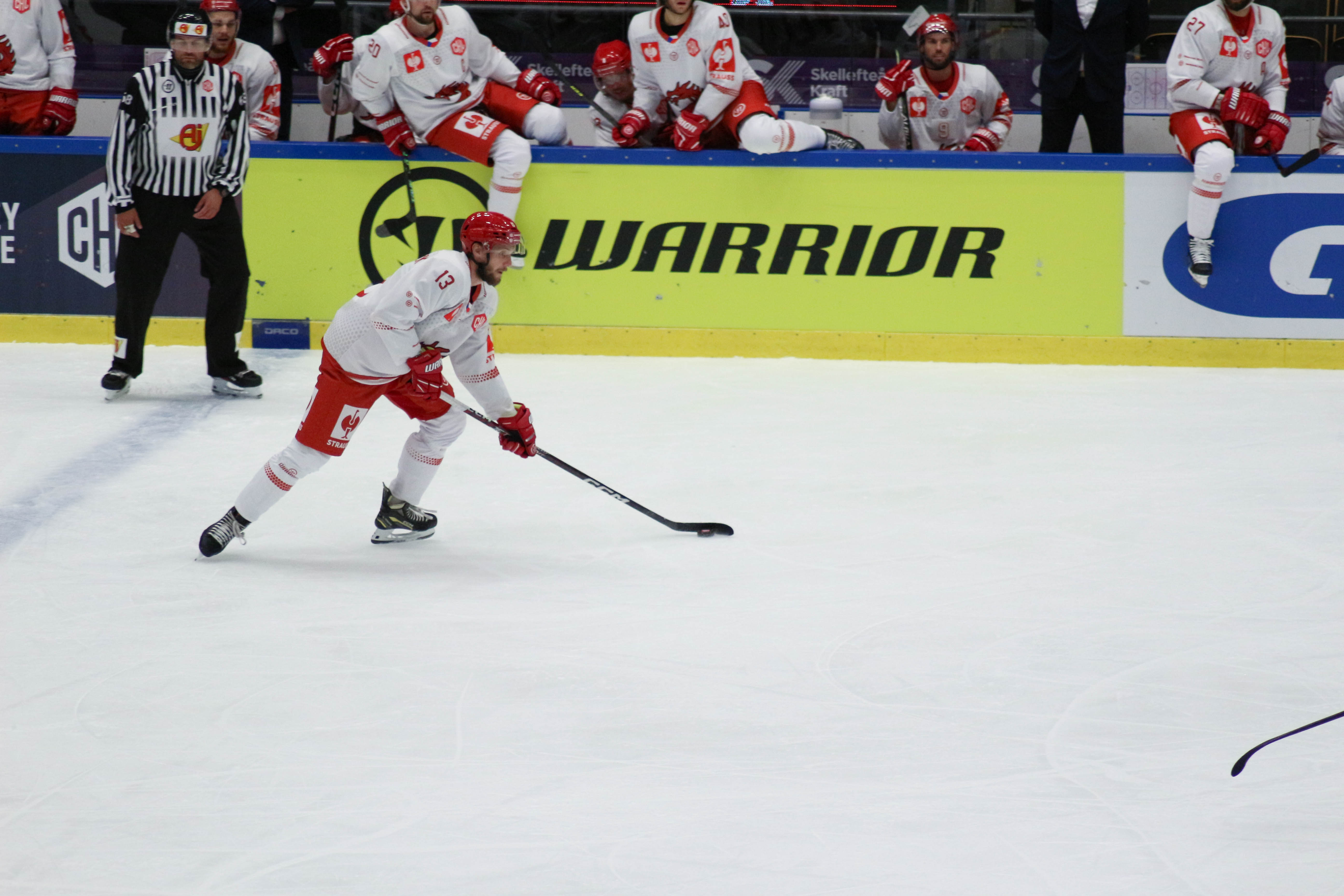 Hráči na střídačce sledují dění na ledě