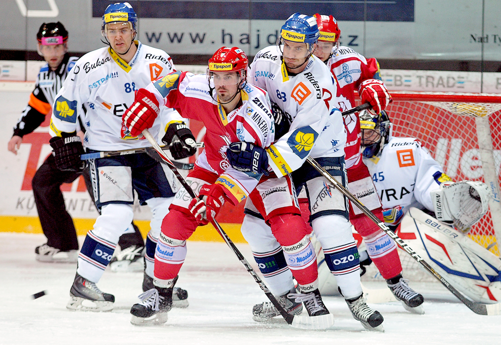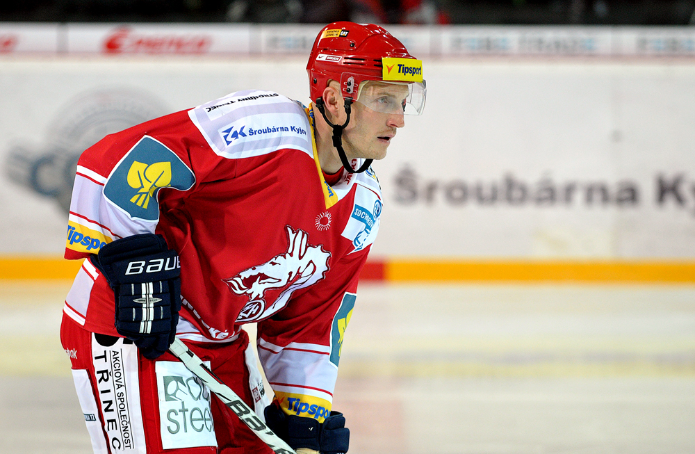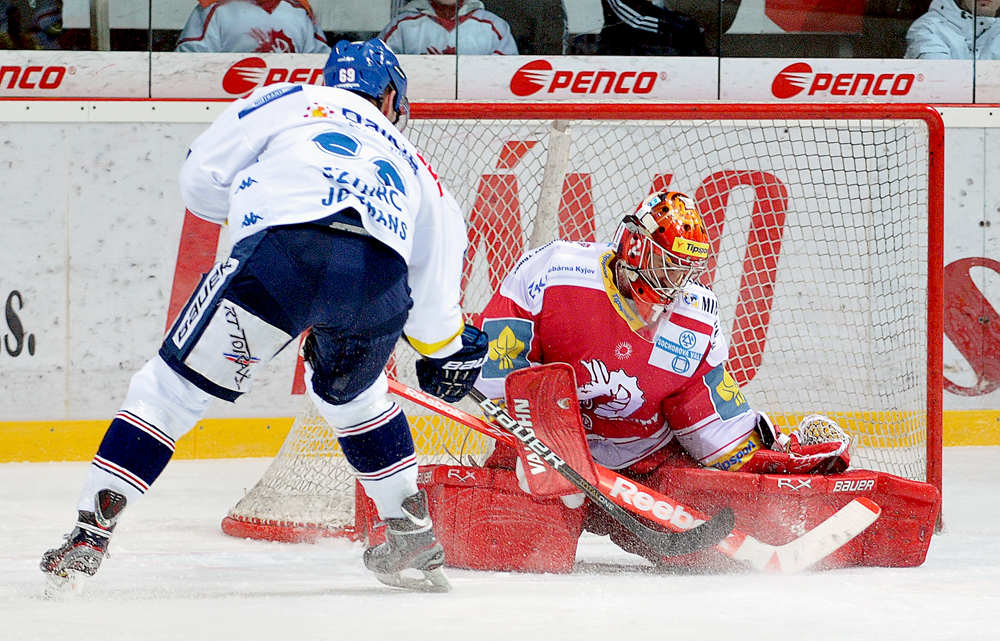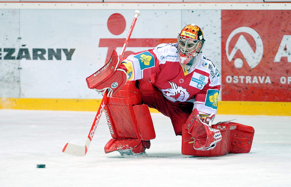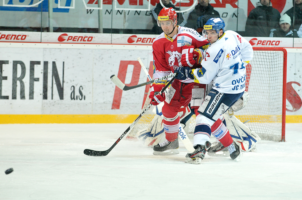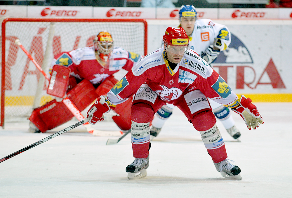 Jiří Polanský se snaží tečovat puk.