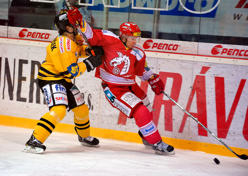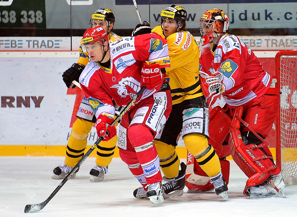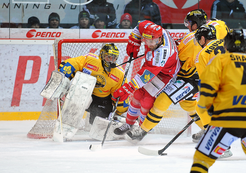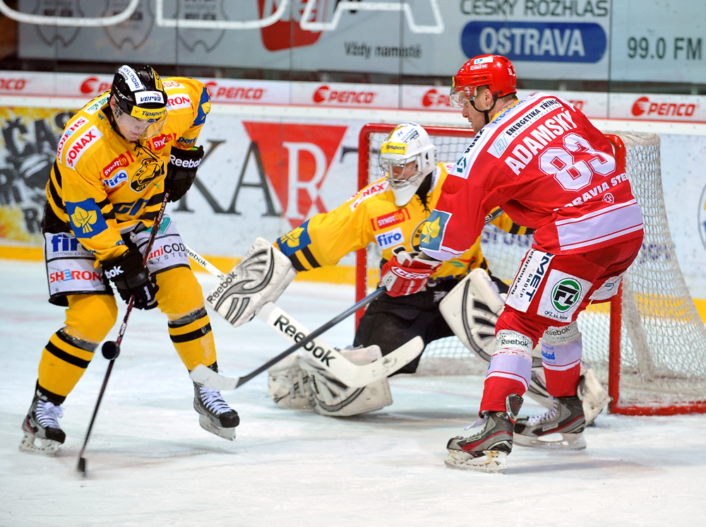 Radek Bonk a Tomáš Kůrka se snaží tečovat puk letící na Fraňka.