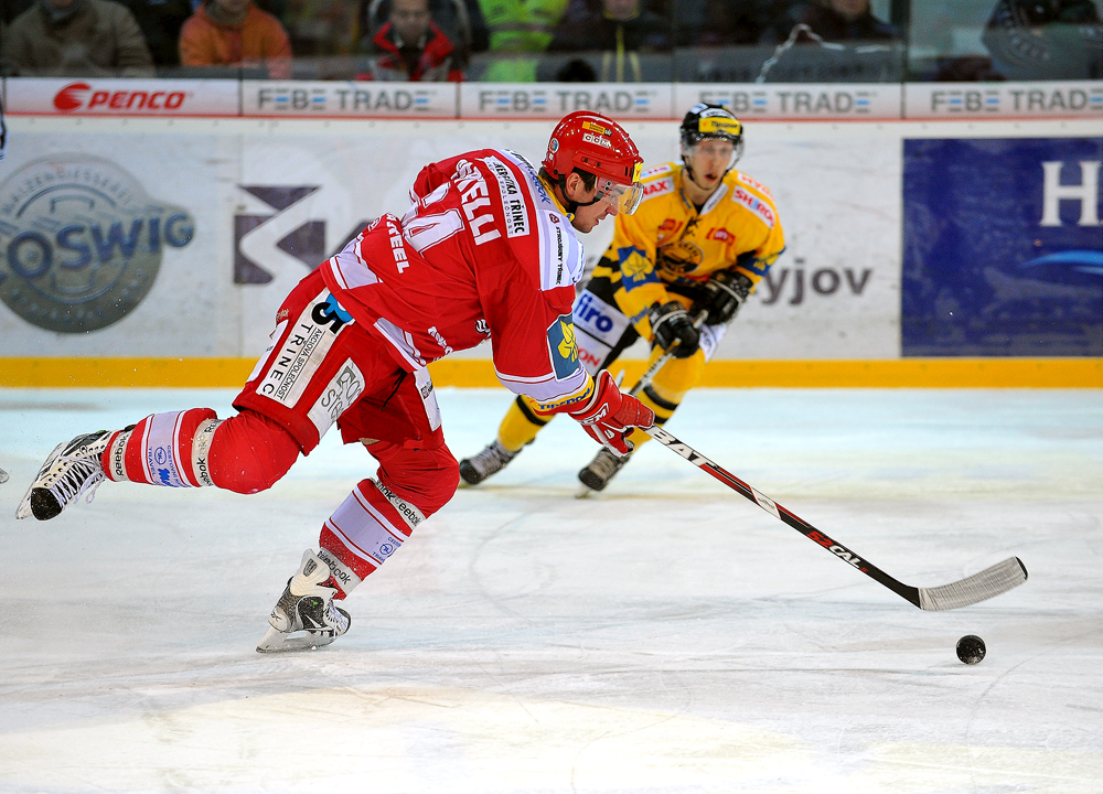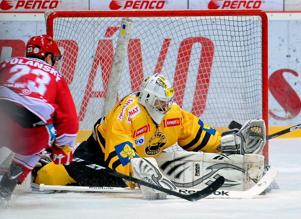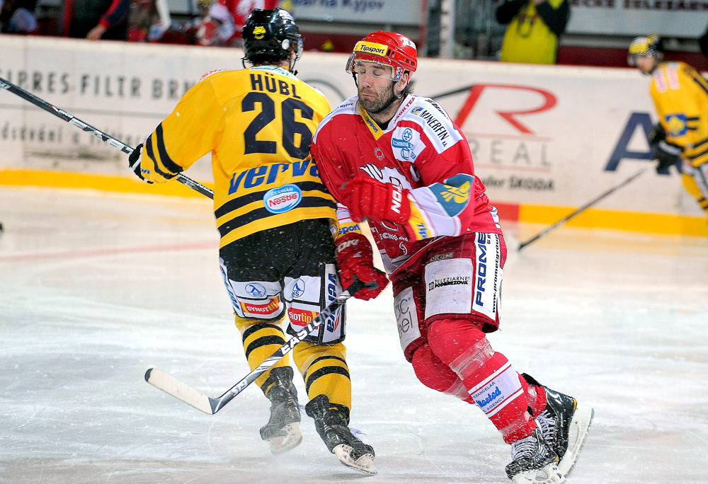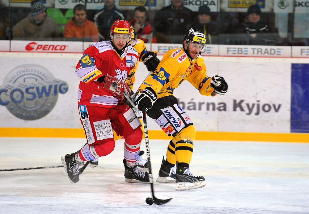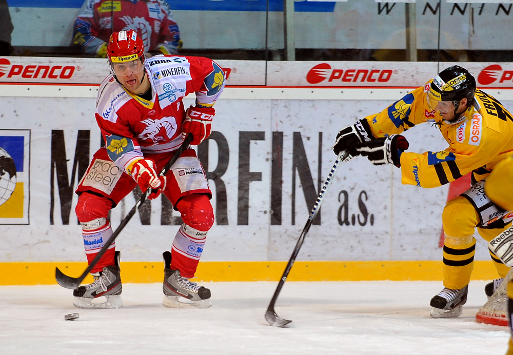 Radek Bonk a Tomáš Kůrka se snaží tečovat puk letící na Fraňka.