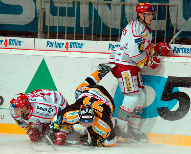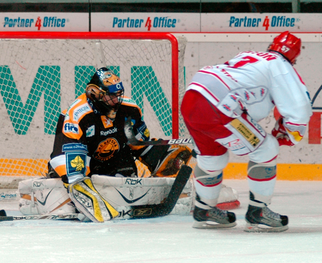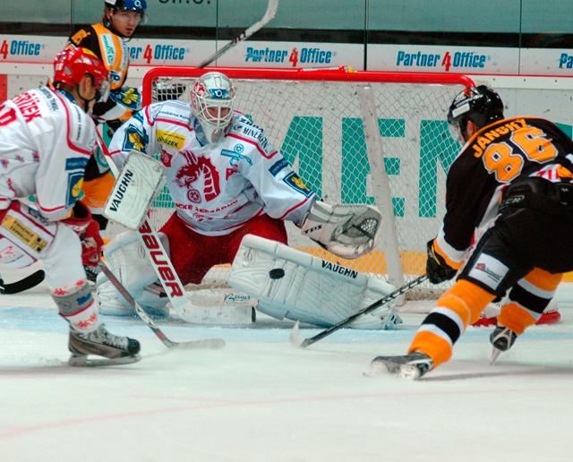 ...a posílá puk nad brankařovu lapačku!
