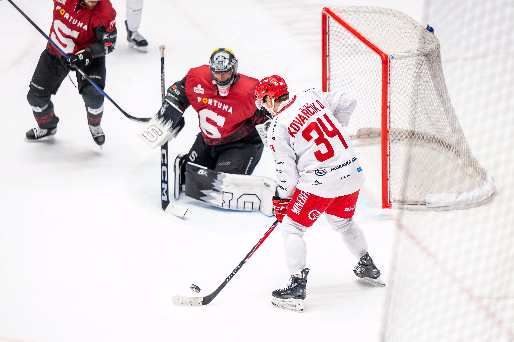 Třetí dějství bylo zahájeno velkou šancí Hudáčka, ten zprava mířil do odkryté části branky, byl však znevýhodněn kvůli velkému úhlu, slovenský forvard tentokrát další čárku ve střelecké listině nepřidal. Na druhé straně zavezl kotouč do útočného pásma Devin Shore, který vypálil nad rameno domácího brankáře a snížil na jednobrankový rozdíl. Pražané ale postupně víc a víc tlačili na třineckou branku. Zkoušel to Hyka, po něm tečoval Ondřej Hrabík nahození Krejčíka. Zničehonic se před brankou ocitl Flynn, který byl při zakončení seknut Najmanem a Oceláři hráli čtvrtou přesilovou hru. Ta ale hrubě nevyšla domácímu mančaftu, prakticky se Třinec k ničemu nedostal. Naopak Shore měl na své holi vyrovnání poté, co jej oslovil Chlapík zpoza branky, Kacetl pohotově zakročil.