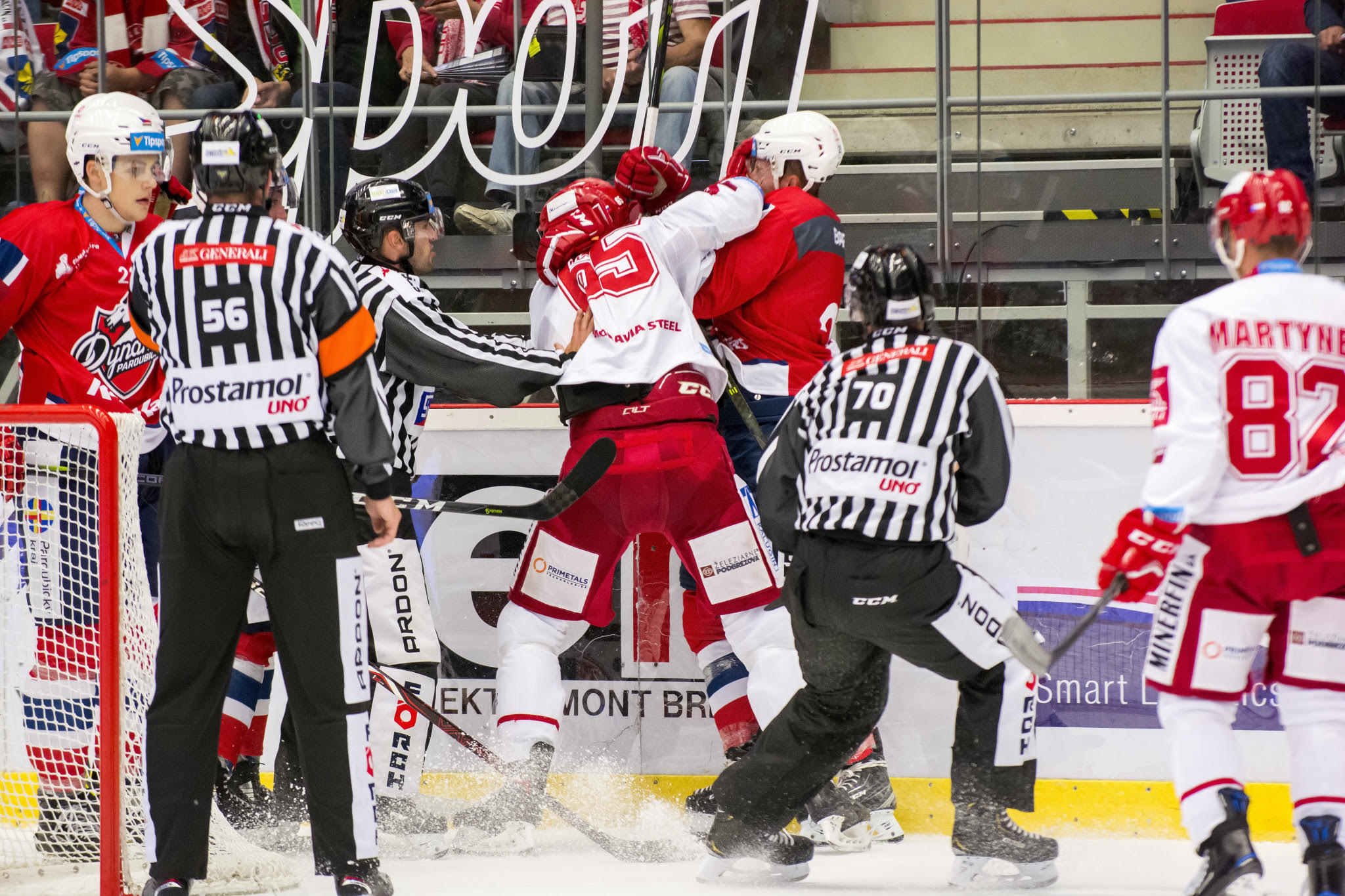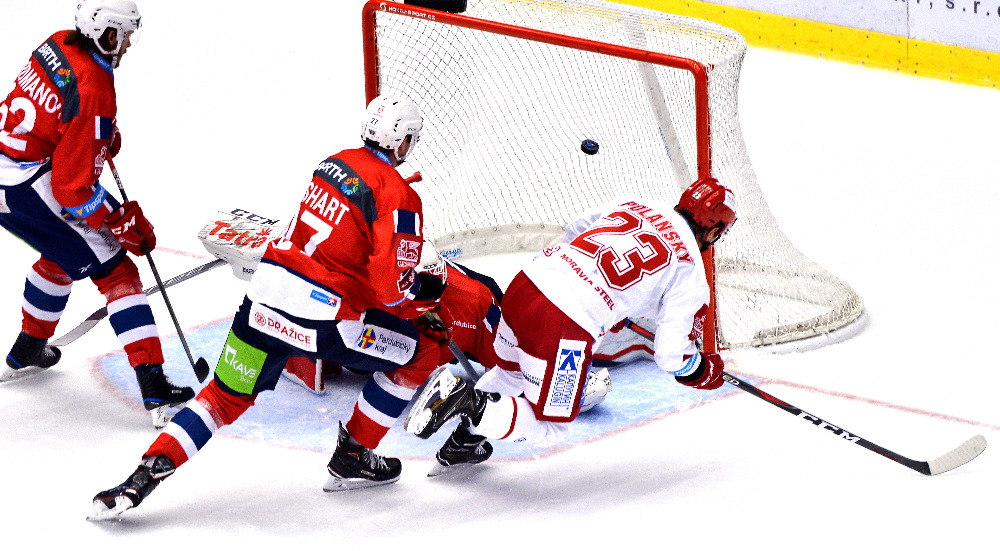 Úvodní hrací doba druhého extraligového utkání, které Oceláři sehráli ve dvou dnech, příliš hokejové krásy nepobrala, přesto byl k vidění jeden moc okulahodící okamžik, aspoň z pohledu třineckých fanoušků. Ale předtím se udály ještě jiné věci – fanoušci ve Werk areně na nějaké vzrušení čekali až do konce čtvrté minuty, kdy náznak šance měl před brankovištěm operující Dravecký. Hosté měli své příležitosti až v minutě osmé – to dvakrát z předbrankového prostoru střílel Sýkora a zejména jeho druhá střela by byla pro třineckou branku velmi nebezpečná, kdyby měla její trajektorie lepší parametry. V desáté minutě přes chumel hráčů pálil Martynek. Diváci slyšeli cinknutí tyče, ale rozhodčí se šli ještě poradit s videem, jestli to náhodou nebyla vnitřní část konstrukce.