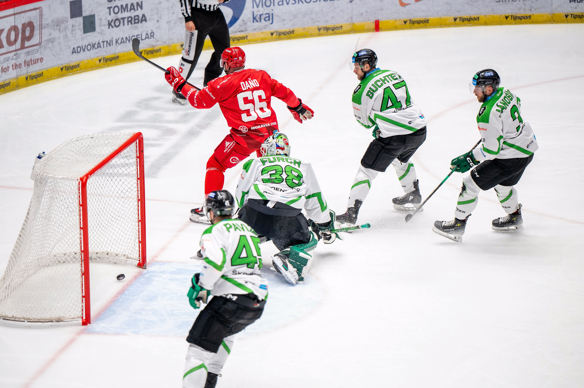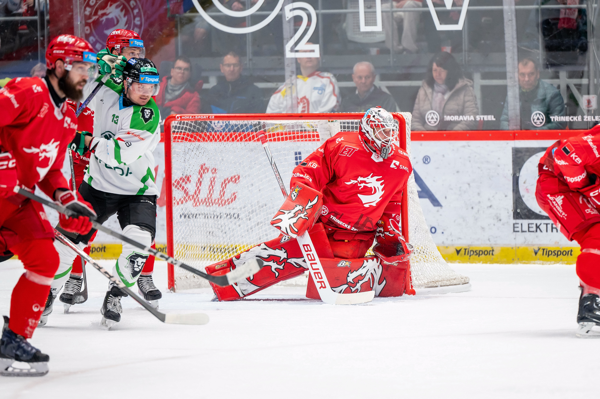 Hned zkraje druhé dvacetiminutovky ujel po pravé straně Fořt, jeho střela švihem ale neměla gólové parametry. Na druhé straně ujel Nestrašil s Teplým, první jmenovaný vzal celou situaci na sebe a orazítkoval horní tyč. Další rychlý výpad domácích zakončoval Cienciala, proti němu kostrbatě zakročil Furch, jenž přesně nevěděl, kde puk je, nikdo z červevno–bílých ale nedokázal touš dopravit do sítě. Poté byl zmatek pro změnu před Kacetlem, Buchtele nacentroval puk do předbrankového prostoru a tam číhal Lakatoš, domácí brankář musel být v pohotovosti.