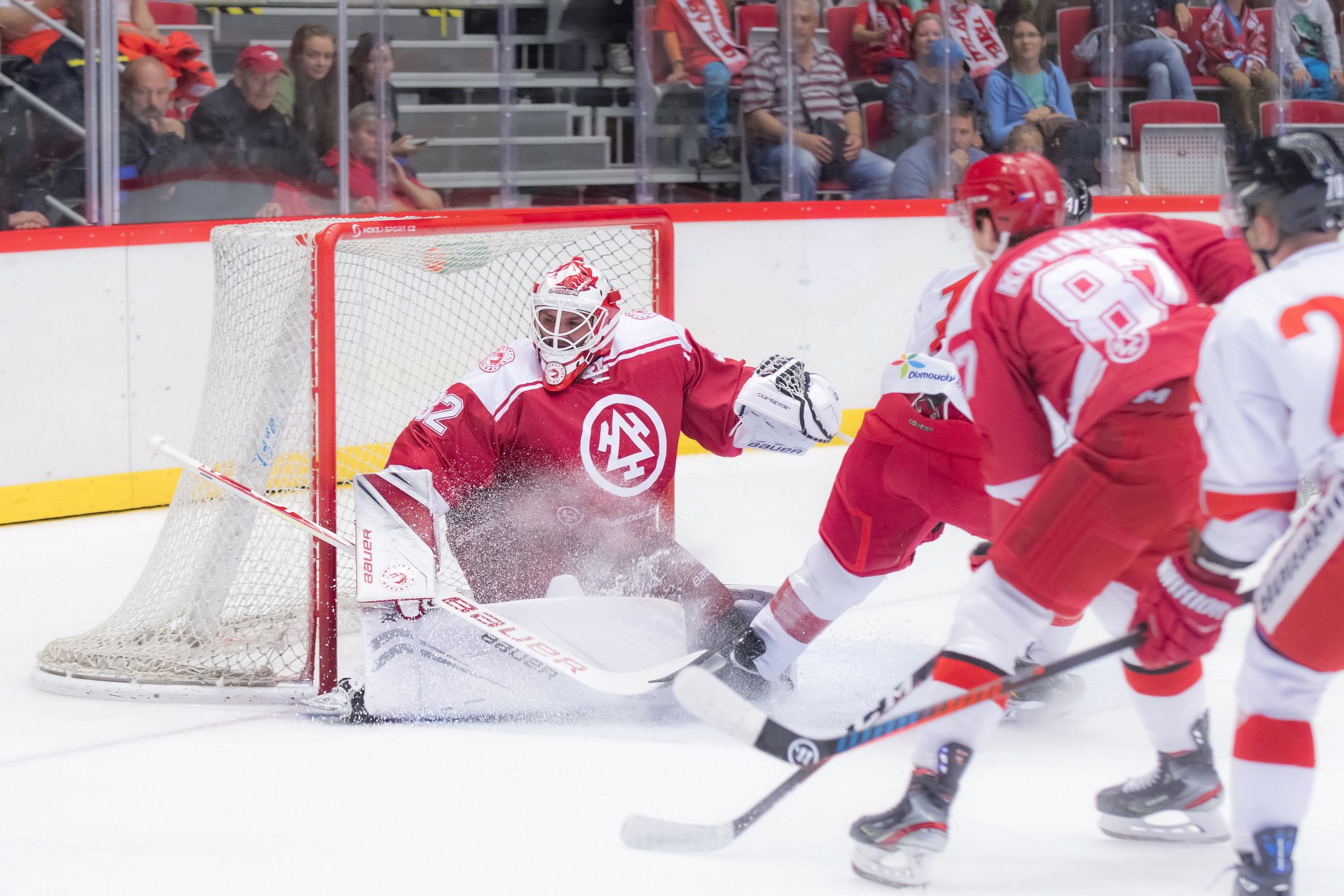 Prvních deset minut závěrečné třetiny nenabídlo moc situací, které by měly nějak zásadně pohnout s historii tohoto přípravného zápasu. První větší šanci měl na svědomí v deváté minutě třetí třetiny Hecl, který povedenou střelou z první při přesilovce donutil Bartošáka k dobrému zákroku. Devět minut před koncem mohl srovnat Chmielewski. Ten se ocitl v situaci dva na jednoho s Ondřejem Kovařčíkem, nezakončoval však pohotově a Konrád situaci zvládl. Šest a půl minuty před koncem tentokrát při přesilovce Třince hledal křížně zpoza branky skrz brankoviště Draveckého Kundrátek. Střela třineckého univerzála ale pouze orazítkovala tyč. Oceláři pak nevyužili přesilovku po vyloučení Knotka, ale dali gól až pár sekund po jejím skončení. Novotného nahození dorážel nakonec úspěšně Patrik Hrehorčák. Zápas dospěl do prodloužení i přes aktivní závěr domácích hokejistů, kteří skoro celé poslední dvě minuty strávili v pásmu před Konrádem. V prodloužení rozhodl samostatný nájezd Petra Strapáče, který puk procedil pod Bartošákem za brankovou čáru. Olomouc tedy zpod Javorového veze vítězství v poměru 3:2 v prodloužení.