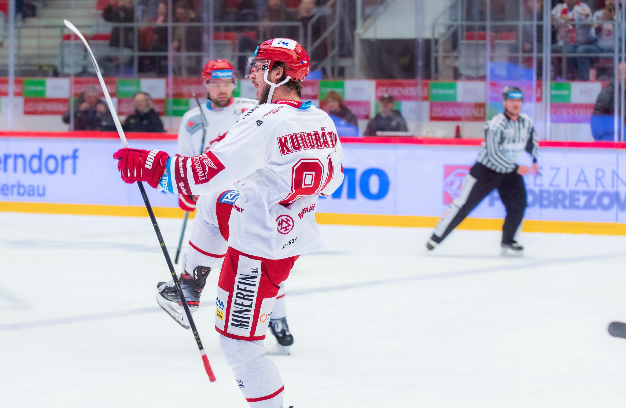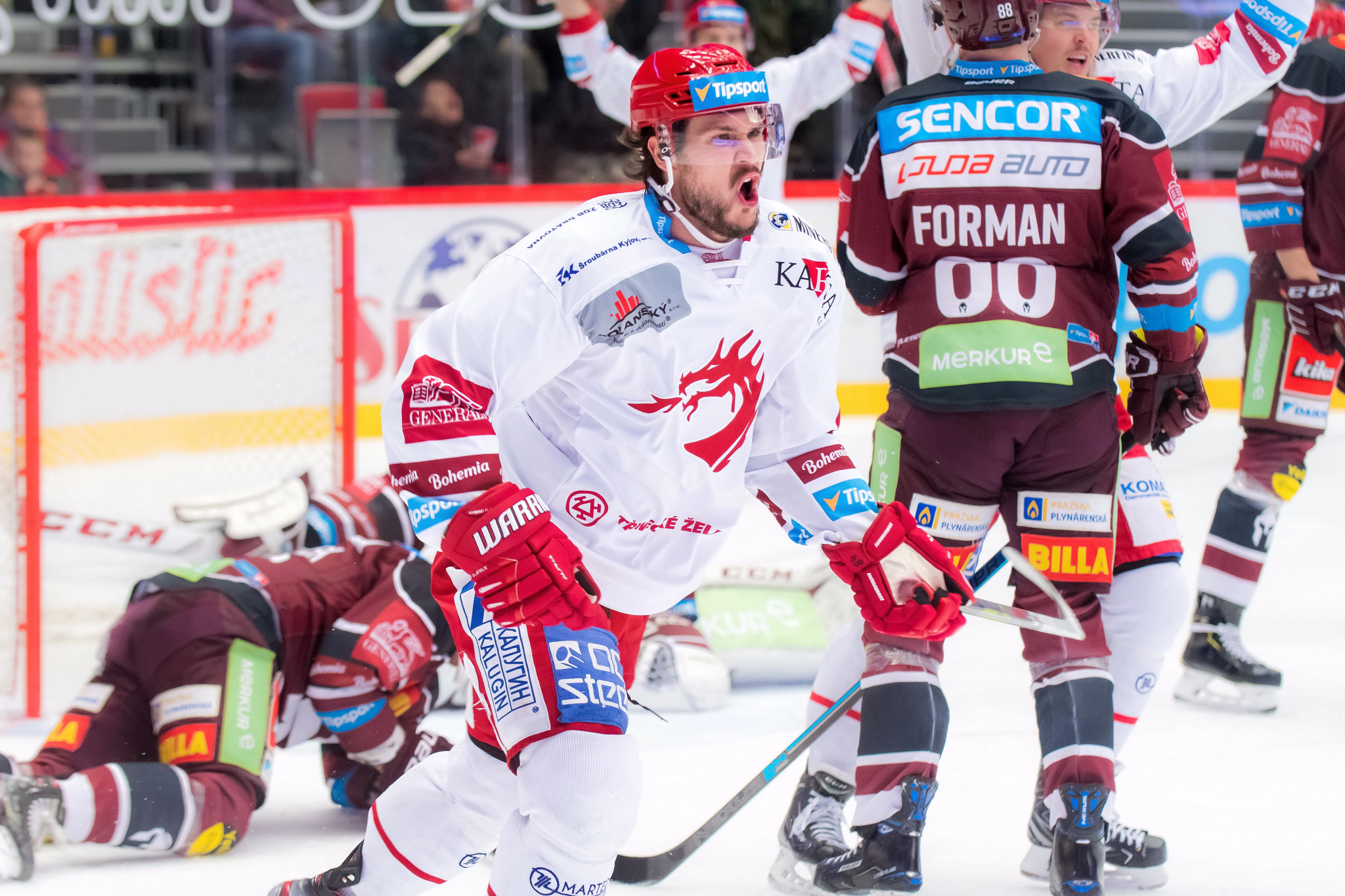 První vzrušení druhé třetiny bylo k vidění před brankou Sedláčka, když za vzájemné provinění byli vyloučení Marcinko s Poláškem a oba týmy hrály ve čtyřech. Víc prostoru na ledě jako by vyhovovalo domácím, kteří se dostávali více na puk a do útočného pásma než proti pěti sparťanům. Sparta v plném počtu byla aktivnější a korunovala to po faulu Chmielewského. Opět sehrála přesilovku bezchybně a Kváčou vyražený puk po střele Poláška od modré dorazil za třineckého brankáře Lukáš Rousek. Po inkasované brance Oceláři zvýšili obrátky, ale přestože hráli velice obětavě, přes těsnou obranu Sparty měli problém se prosadit. Poté, co to s hrubostí v obranném rohu hřiště přehnal Jurčina, dostali Třinečtí druhou přesilovku v zápase. Sice ji statisticky nevyužili, protože gól padl dvě sekundy po návratu slovenského obránce ve službách Sparty na led, ale byla to branka z přesilovkové situace. Po křížném pasu od u levé tyče hlídkujícího Draveckého na levý kruh střelou do horních pater branky nezaváhal podruhé v zápase skórující Tomáš Kundrátek. Do konce třetiny už gól nepadl, i když domácí nebyli daleko třetí branky při dalším vyloučení Poláška. Nebezpečně kolem Sedláčkovy branky lítaly střely Rotha od modré, na slot dostal nabito Chmielewski, ale trefil sparťanského brankáře na střed terče. I druhá třetina tak nabídla přesně dvě branky.