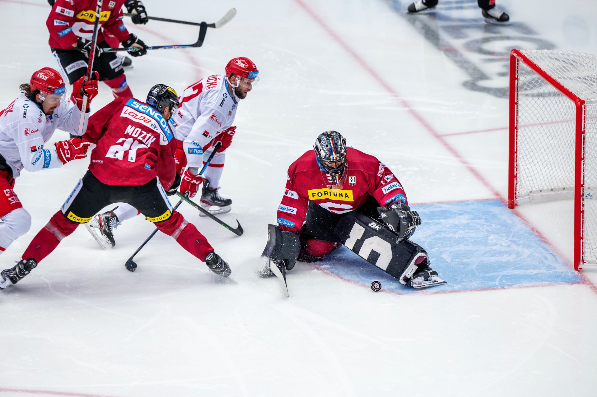 Hráči s drakem na prsou pokračovali v aktivní hře i nadále, o tři minuty později se ve velkém závaru před hostující brankou o branku marně pokoušeli Roman s Nestrašilem, další dvě velké příležitosti pak měli na svědomí Hudáček s Kundrátkem, brankář Sparty ale nejprve přesně zasáhl vyrážečkou, střelu třineckého beka od modré pak našel ve své lapačce.