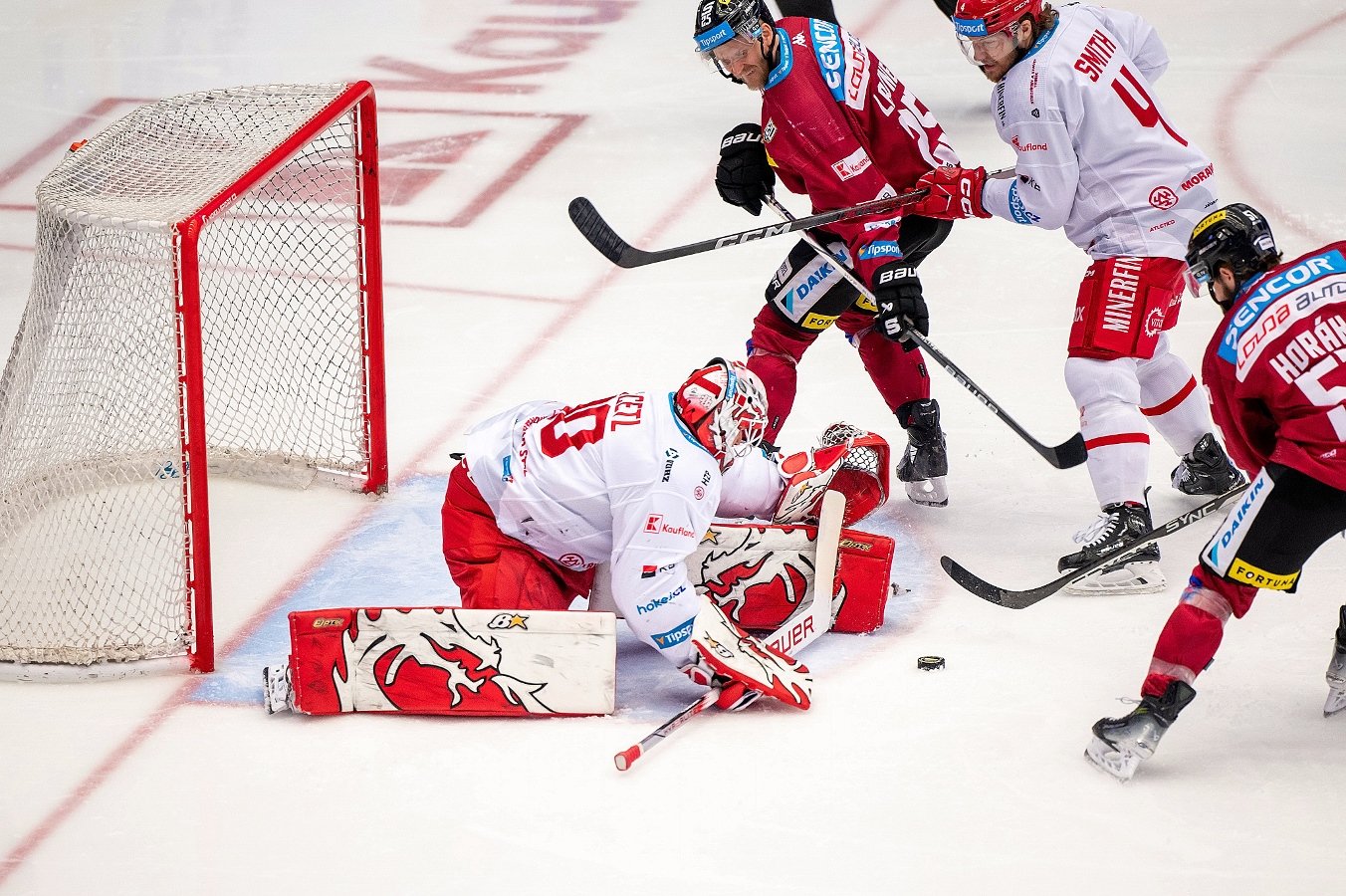 Oceláři ve čtvrtém semifinálovém zápase odvraceli první mečbol Sparty. Do sestavy se vrátil po odpykaném trestu Daniel Voženílek. Trenérské duo Moták – Ország si pro čtvrté měření sil připravilo několik změn v útočných formacích. Do branky se postavil Ondřej Kacetl. Hned ve svém prvním střídání po návratu se ukázal Voženílek ve svém klasickém rozpoložení. Jeho dohrání nevonělo Chlapíkovi, následně nadělal potíže při zákroku i Kovářovi. Prvním vyloučeným v zápase byl Dravecký, který sekal soupeře v útočném pásmu. Hned vzápětí byl vyloučen Čacho za stejný prohřešek a Třinec šel do tří. Pražané si vytvořili tlak, nicméně branku se jim vsítit nepodařilo. Navrativší do sestavy Voženílek vybojoval faulem na svou osobu první početní výhodu pro domácí. Oceláři v ní drželi přes minutu soupeře pod tlakem a Marko Daňo se nejlépe zorientoval na brankovišti a dorazil puk za záda Kováře. Trenér Gross si vyžádal trenérskou výzvu, v té hlavní rozhodčí branku potvrdil a Sparta musela kvůli zdržování hry znovu do čtyř.